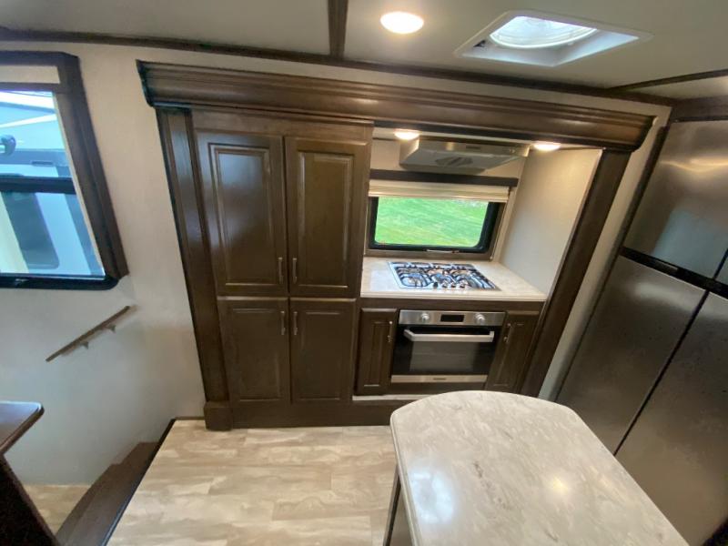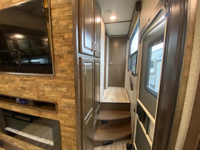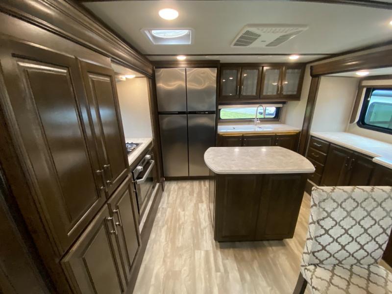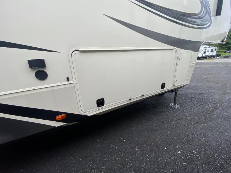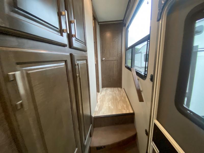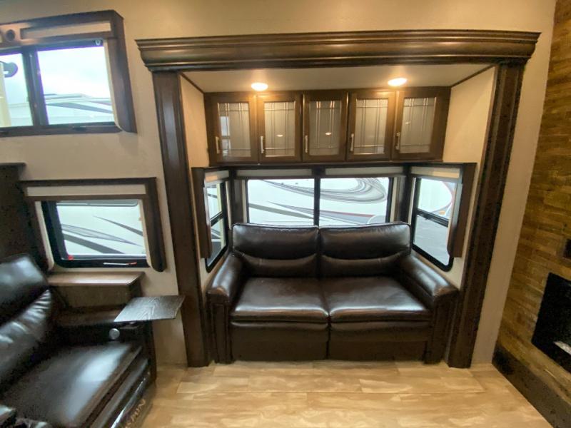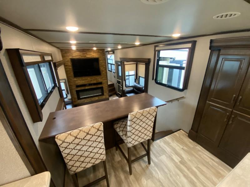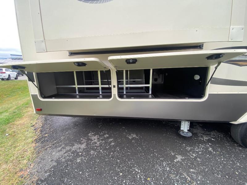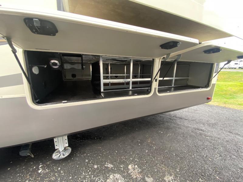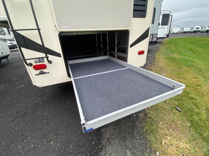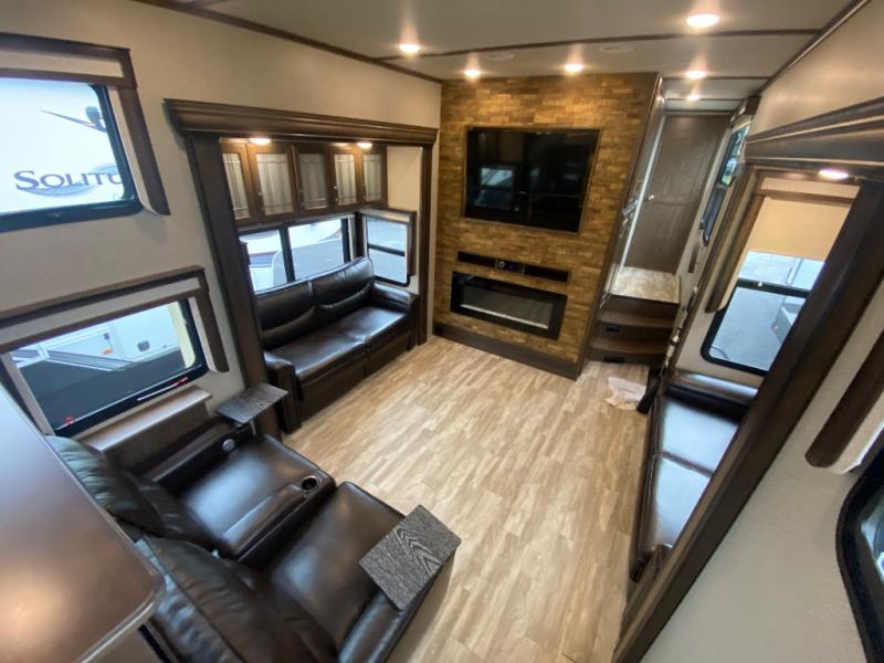 You will love your extended stays while traveling in this Solitude fifth wheel which features five slides! A rear raised kitchen provides the family chef a great space with opposing slides as well as an island for food prep. A raised bar top with two stools overlooks the center living space that also features dual opposing slides, two tri-fold sofas, and theatre seating. Dual sinks in the full bathroom means getting ready is easy for two, and the shower with skylight offers more head room that you are also sure to appreciate. As you wind down your day, the front master bedroom will be a welcomed retreat thanks to a queen bed slide, and the walk-in closet provides ample space for all of your things. For added storage, a large exterior sliding tray offers more room for luggage and larger items. There is also a mid-coach pass-through storage compartment for other camping gear.