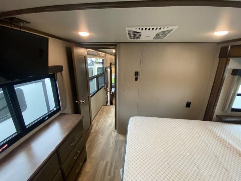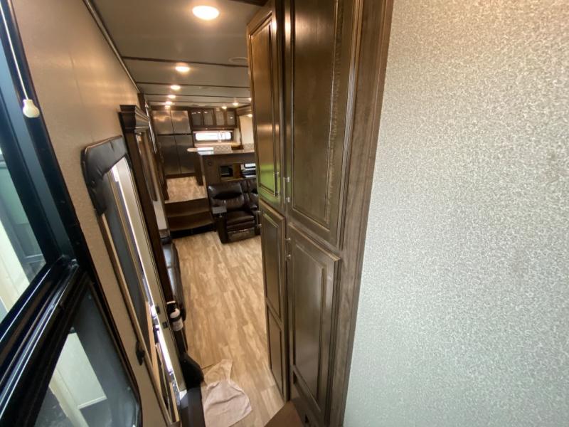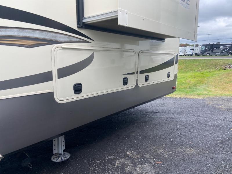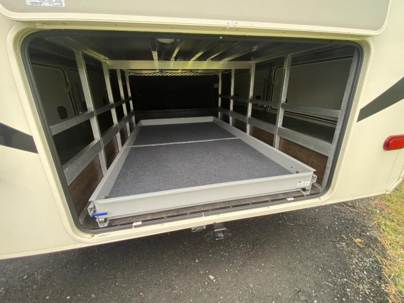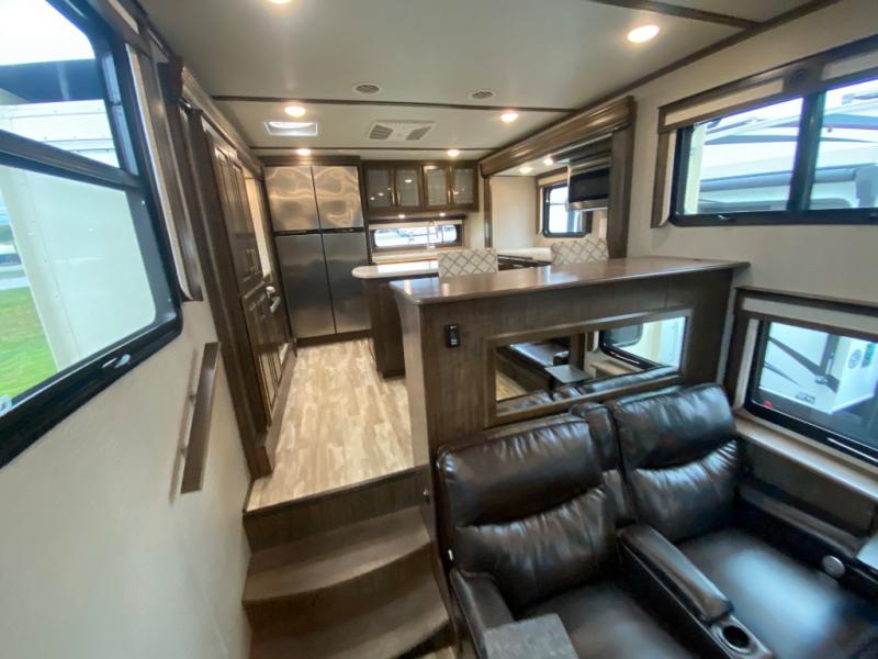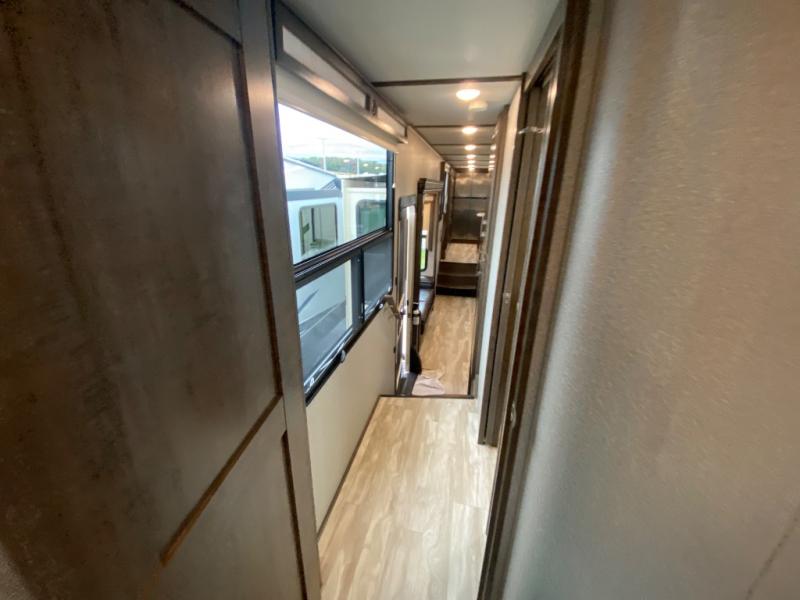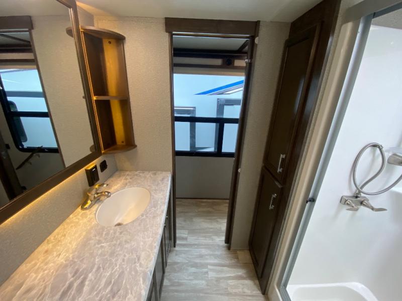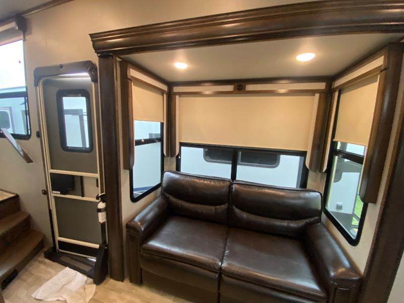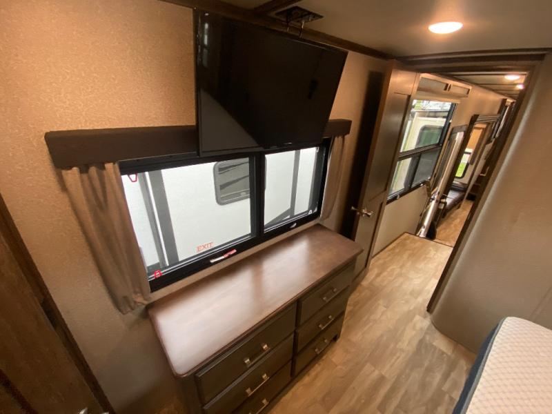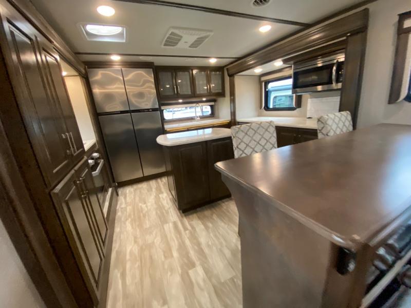 You will love your extended stays while traveling in this Solitude fifth wheel which features five slides! A rear raised kitchen provides the family chef a great space with opposing slides as well as an island for food prep. A raised bar top with two stools overlooks the center living space that also features dual opposing slides, two tri-fold sofas, and theatre seating. Dual sinks in the full bathroom means getting ready is easy for two, and the shower with skylight offers more head room that you are also sure to appreciate. As you wind down your day, the front master bedroom will be a welcomed retreat thanks to a queen bed slide, and the walk-in closet provides ample space for all of your things. For added storage, a large exterior sliding tray offers more room for luggage and larger items. There is also a mid-coach pass-through storage compartment for other camping gear.
