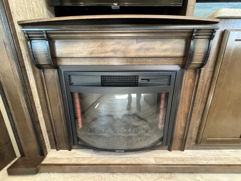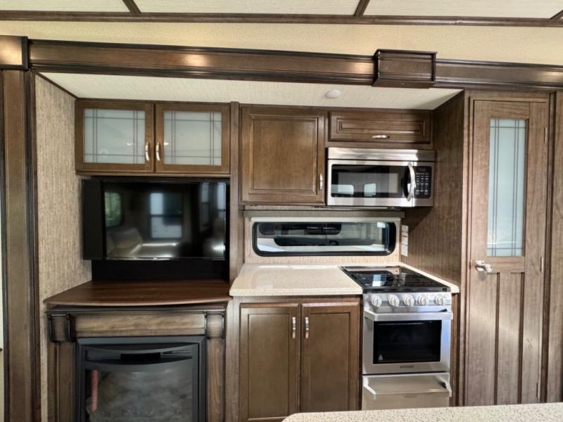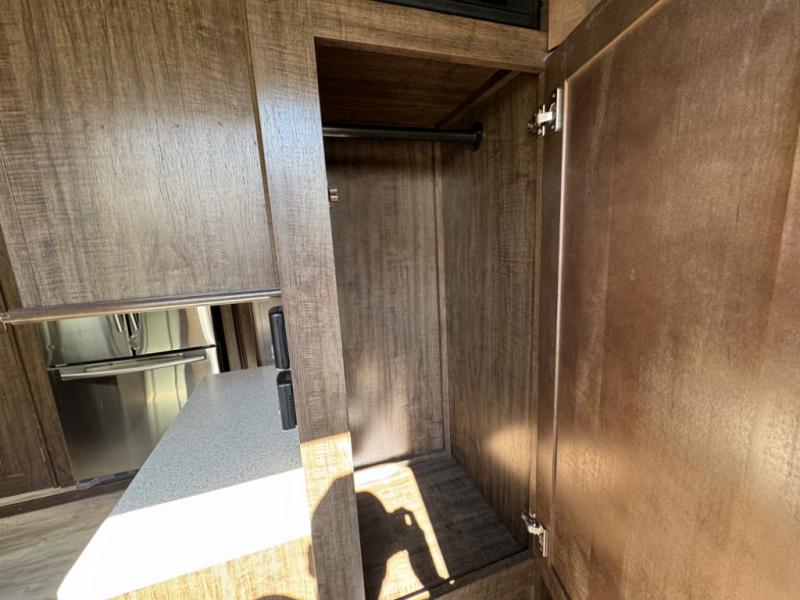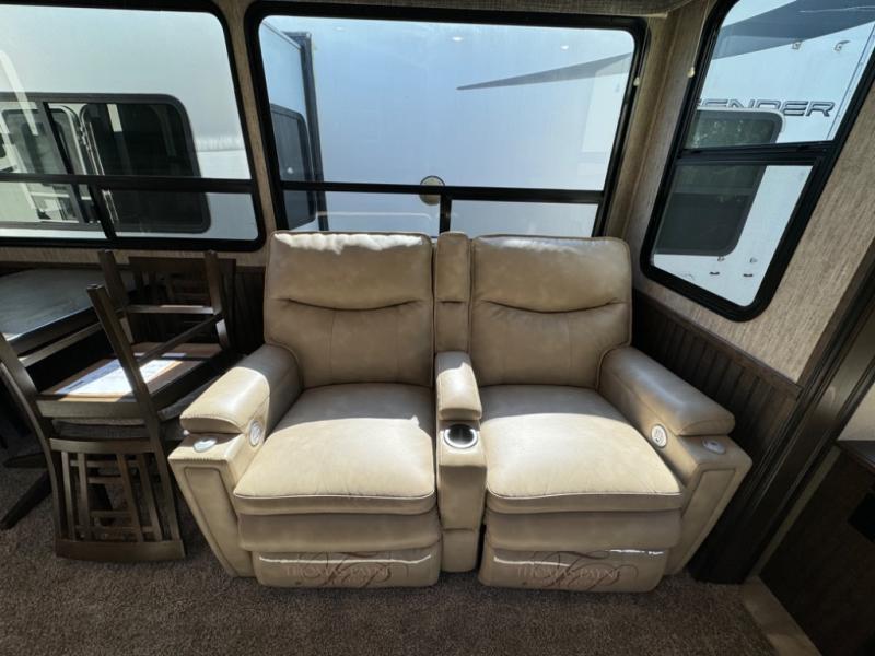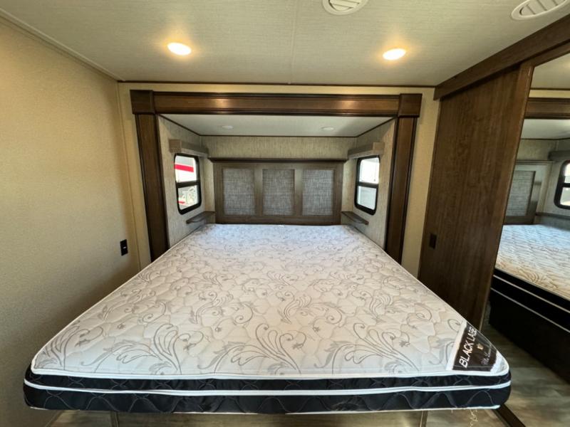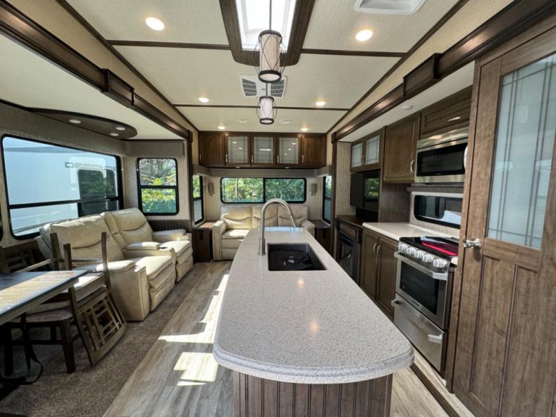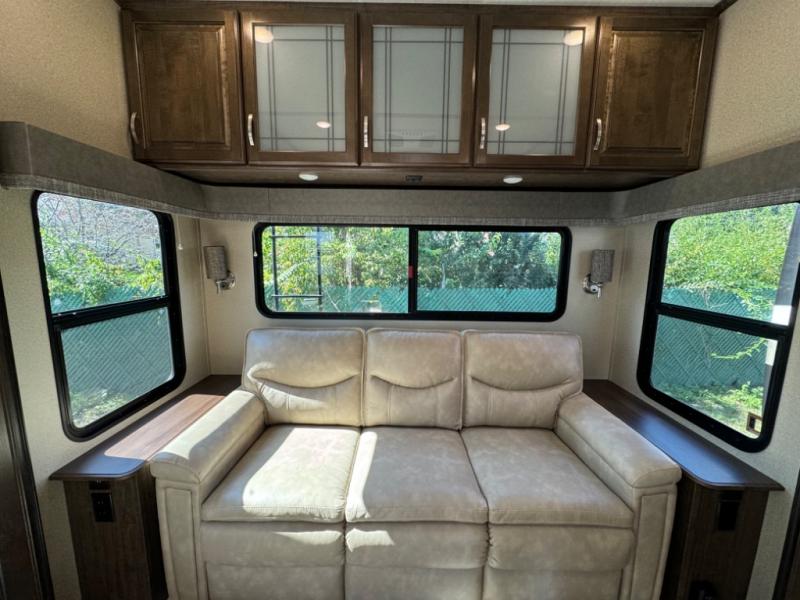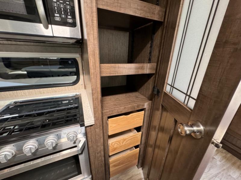 This Solitude S-Class fifth wheel will have you daydreaming about all the places you will visit, and maybe change you into a full-timer once you see all the amenities. Of course your sleeping accommodations are very important to you, the front master suite offers a queen bed or choose an optional king size if you prefer. And your spouse will surely love having their own sink in the bathroom, and plenty of clothing storage in the bedroom. The cook will enjoy using the professional grade stainless steel cooktop and convection microwave, the oversized pantry, the hutch, the stainless steel 12 cu. ft. four door refrigerator, plus the kitchen island. Everyone can relax in the rear living area on the tri-fold sofa or on the theatre seats for a massage. There are many more features to enjoy such as the fireplace, and options to add like a washer and dryer and/or a residential refrigerator. Start your plans now!