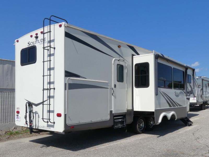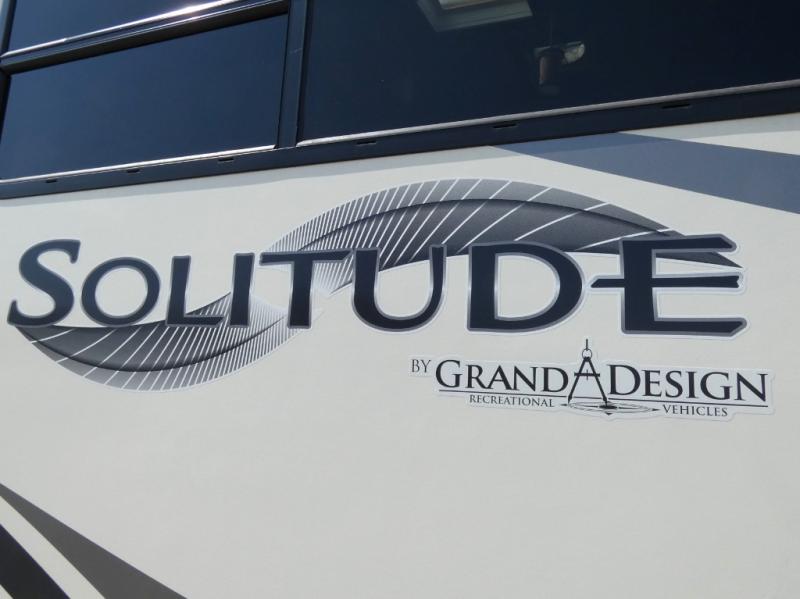 Each Grand Design Solitude S-Class fifth wheel offers many residential features at an affordable price for full-timers, extended stay travelers, or weekend warriors. Made to a higher standard, the foundation is built on a drop down chassis, is 8'5" wide with a walk-on roof, includes a MORryde pin box and CRE3000 suspension system, a 4-point or 6-point electric leveling system for quick set up, and has been prepped for solar. Inside you will enjoy taller ceilings, taller and deeper cabinets, the power reclining theatre seating with swivel tables including LED lighting, plus a heat and massage function, a Stealth AC system, and the Weather-Tek package which allows you to travel any season. Choose your favorite model today!