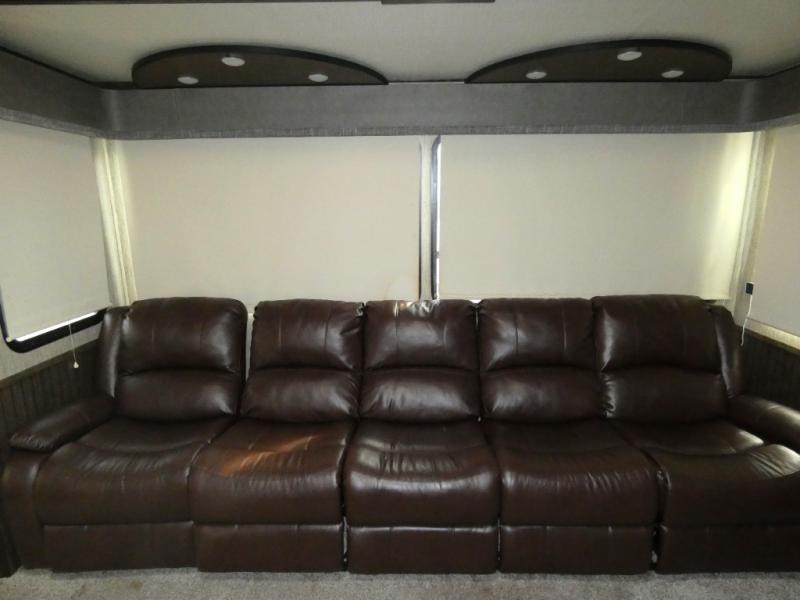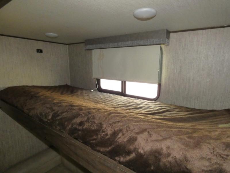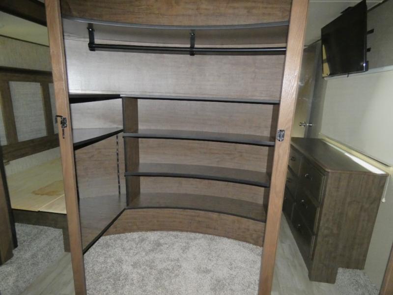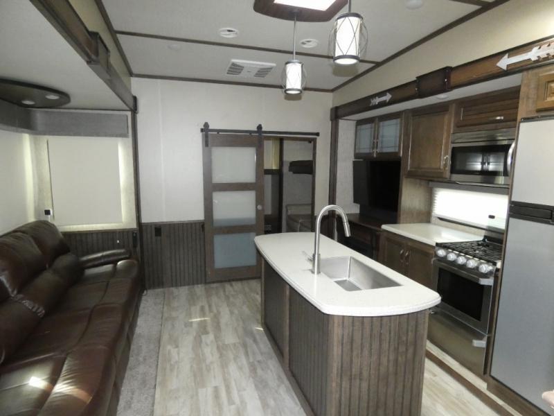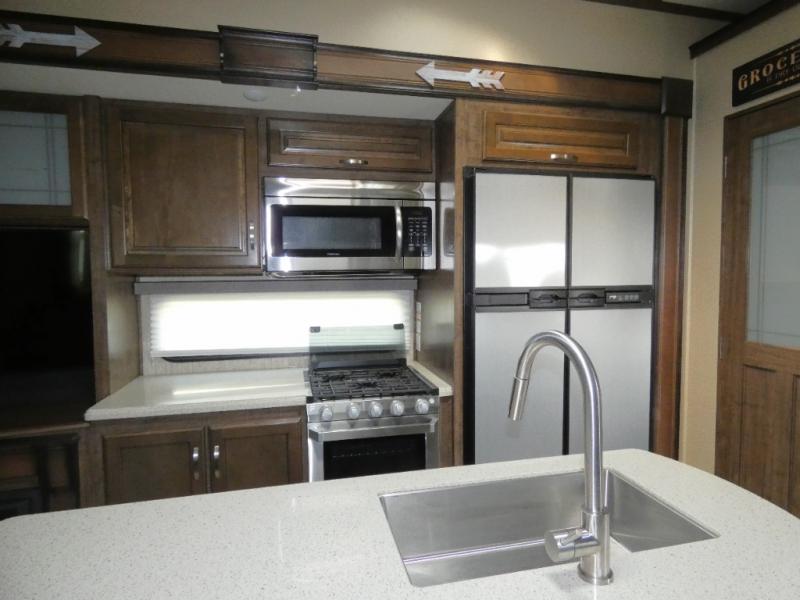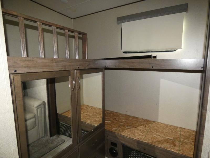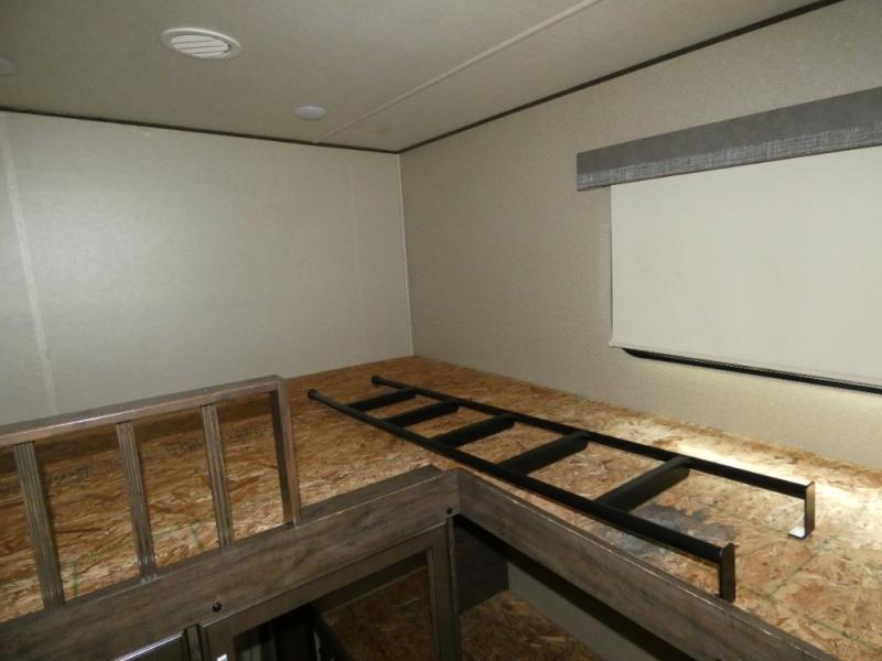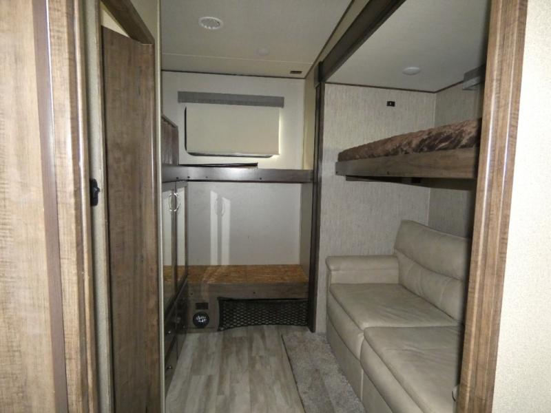 Your search is over! Your kids are going to love having their own bunkhouse with a half bath including the second entry/exit into the fifth wheel. That door will surely be opened and closed all day from all the fun outside and inside. The kiddos will enjoy having their privacy, the tri-fold sofa on rainy days, and having their friends stay the night thanks to all the sleeping space in this one room. The main living and kitchen area will impress anyone, and the kitchen appliances allow you to make a thanksgiving meal. You will surely appreciate all the USB charging outlets, the fireplace, the shock assist SolidStep quad entry steps, and the two awnings.