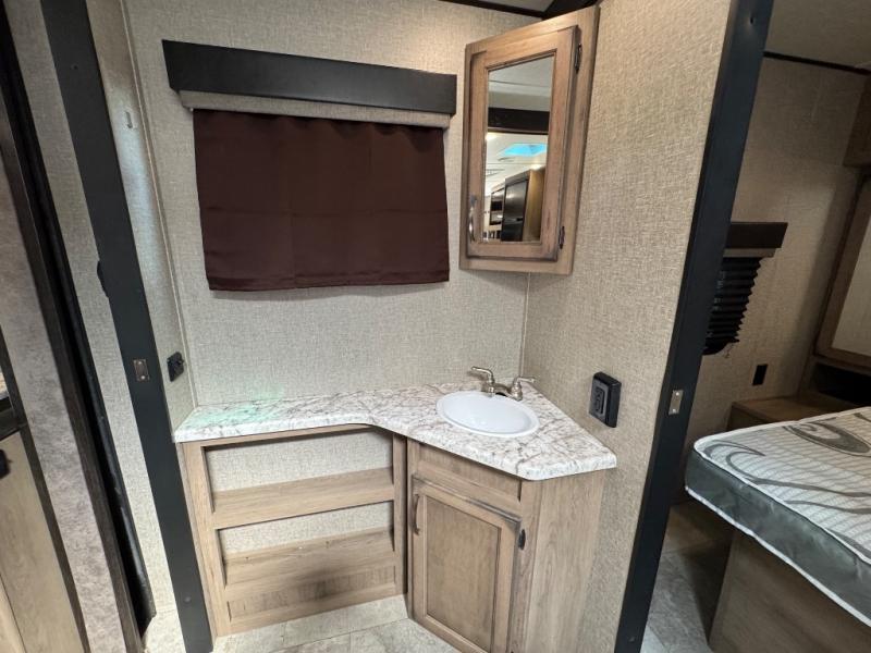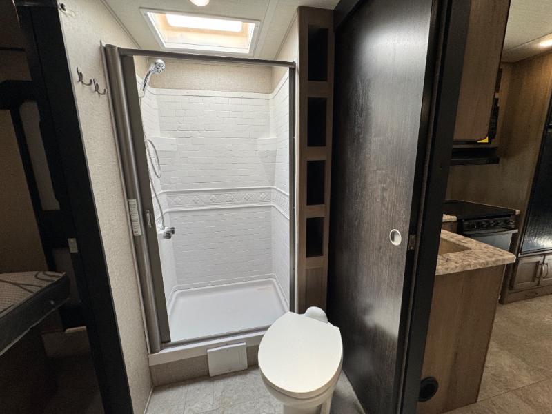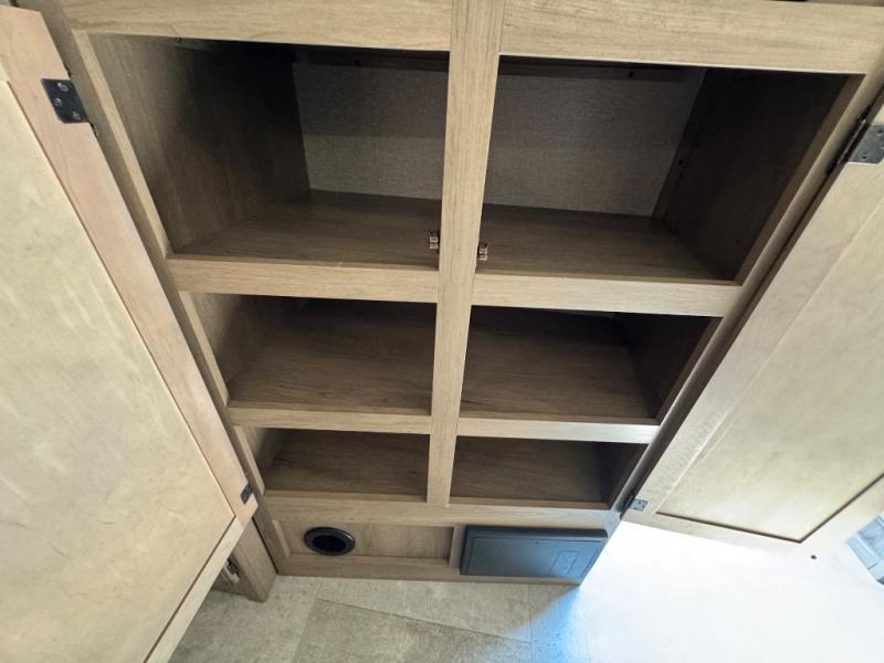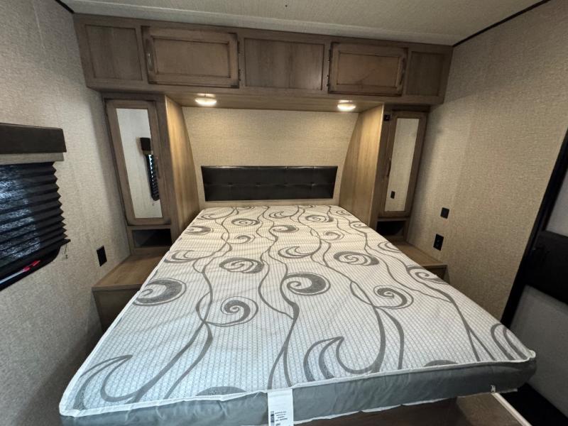 You're going to love camping in this dual entry Transcend 26RLS travel trailer! With features like the front private bedroom, the walk-through bathroom, and the exterior universal docking station, you will want to extend all of your camping trips. The front private bedroom has everything you need to enjoy a good night's rest and to look your best each day with the queen-size bed with wardrobes on either side. The rear living area is the perfect place for you to wind down your nights. You can watch your favorite movie on the 32" LED TV on a swing arm for everyone to see from either the tri-fold sofa or the theater seating which has cupholders to prevent you from spilling your drink, and if you're not one for movies then you can head to the booth dinette to play a card game!