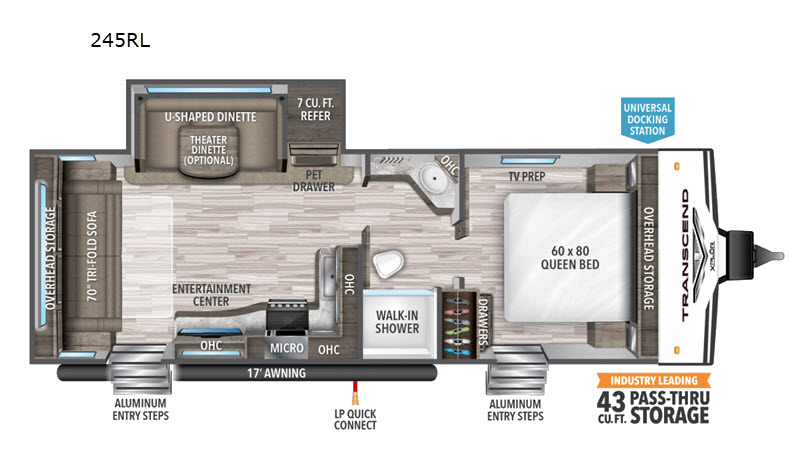 Plan to stay a while in this Transcend Xplor travel trailer that features a rear living area and a slide out for more interior space. The kids will love to sit around the U-shaped dinette to play a board game, and you and your spouse can relax on the 70" tri-fold sofa. These areas can also be converted to sleeping space each night, and the entertainment center will allow you to add a TV. The chef of the family can prepare breakfast on the three-burner range, and the 7 cu. ft. refrigerator can store the milk and eggs. This model includes a pet drawer under the refrigerator to keep your loyal friends happy. You'll also find a spacious walk-though bath with a walk-in shower, and the front private bedroom includes a queen bed and its own exterior entry door!