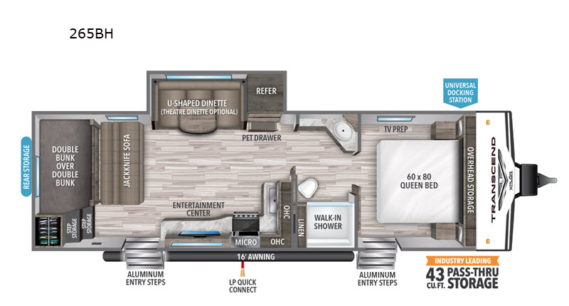 SUPER CLEAN 2020 GRAND DESIGN TRANSCEND XPLOR 265BH IS A RV LOADED WITH LUXURY!! 33 LONG. PRIVATE BEDROOM UNIT, 1 XL SLIDE. QUEEN MASTER SUITE WITH PRIVATE FRONT BEDROOM WITH 2 REAR BUNKS. DINETTE & SLEEPER SOFA. FRONT PRIVATE BEDROOM.