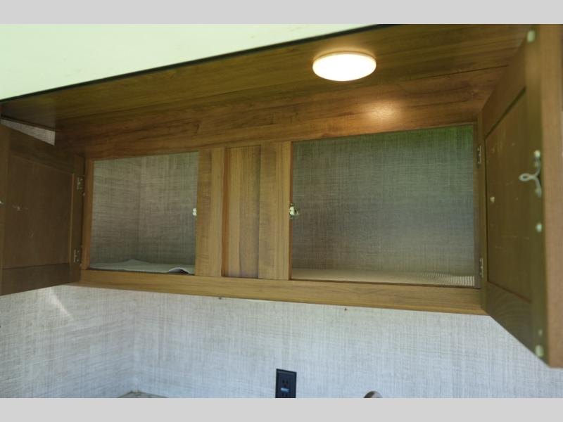 Exterior pass-through storage for camping gear and outdoor equipment