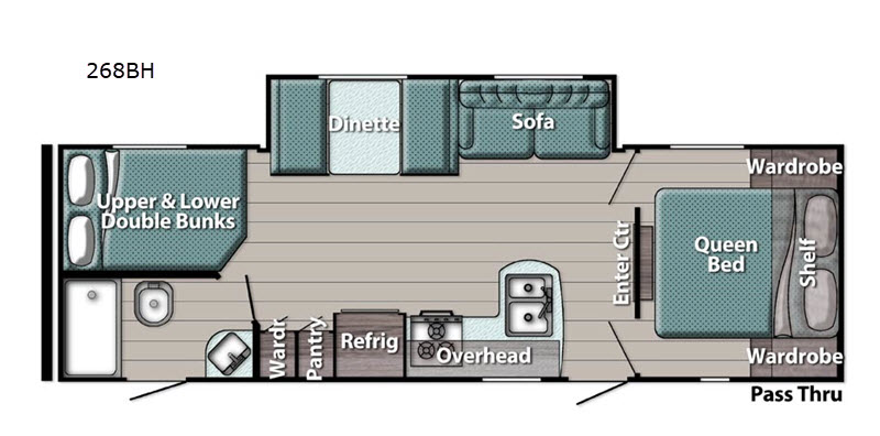 Let your next adventure be in this travel trailer that includes many at-home comforts. You will love the amount of interior space you have thanks to the large slide out and you'll find seating space here on the booth dinette and sofa. The kids can take a rest on the double bunk beds before heading back outside to ride their bikes, and everyone can easily use the bathroom that has its own exterior entry door. Mom and dad will enjoy the front private bedroom with its queen bed and dual wardrobes for their clothes. Take a look at this travel trailer, you won't be disappointed!