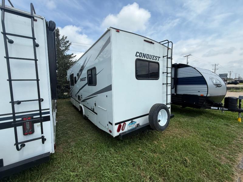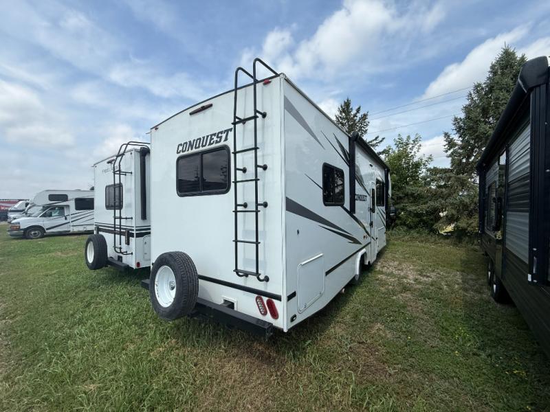 Look no further than the Gulf Stream Conquest Class C gas motorhome to safely travel the countryside! Beginning with the "Cradle of Strength" construction, the fuel-efficient Ford E350 or E450 chassis, and the welded aluminum perimeter frame, you will find that the Conquest is the perfect foundation to all of your travels. The Conquest Luxury package that comes standard on each model provides a 4.0 kW Onan generator to keep everything running, stainless steel appliances for a stylish look, and upgraded exterior graphics to catch your neighbor's attention. It's time to choose the floorplan that works best for your family's traveling lifestyle!