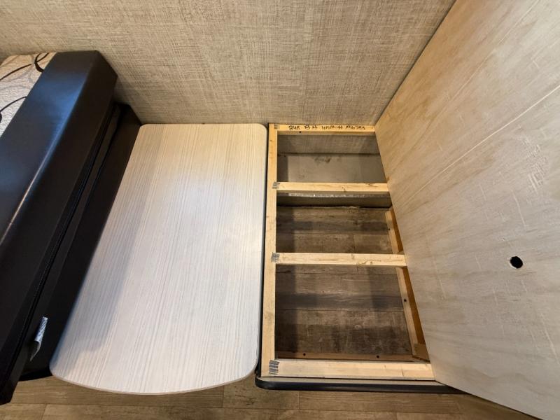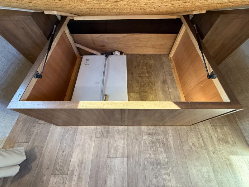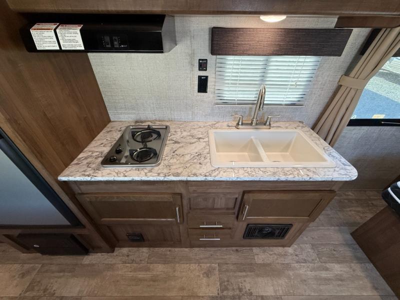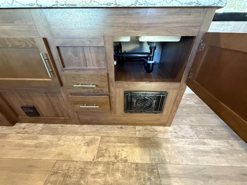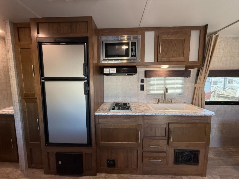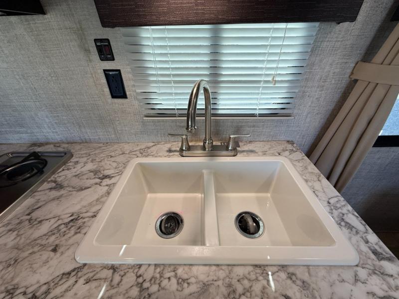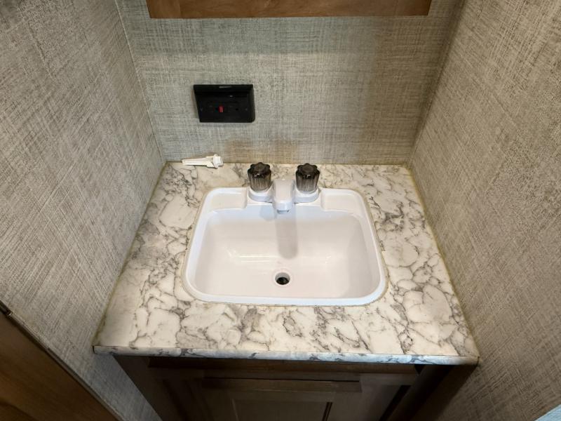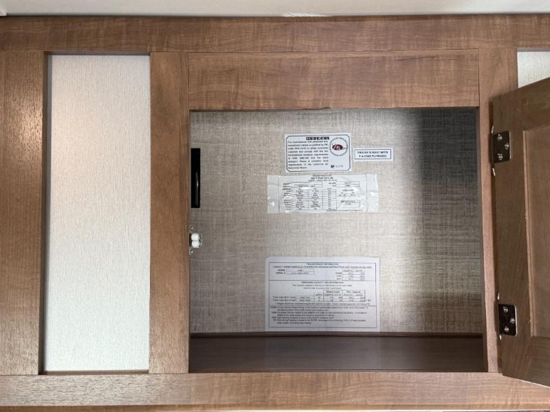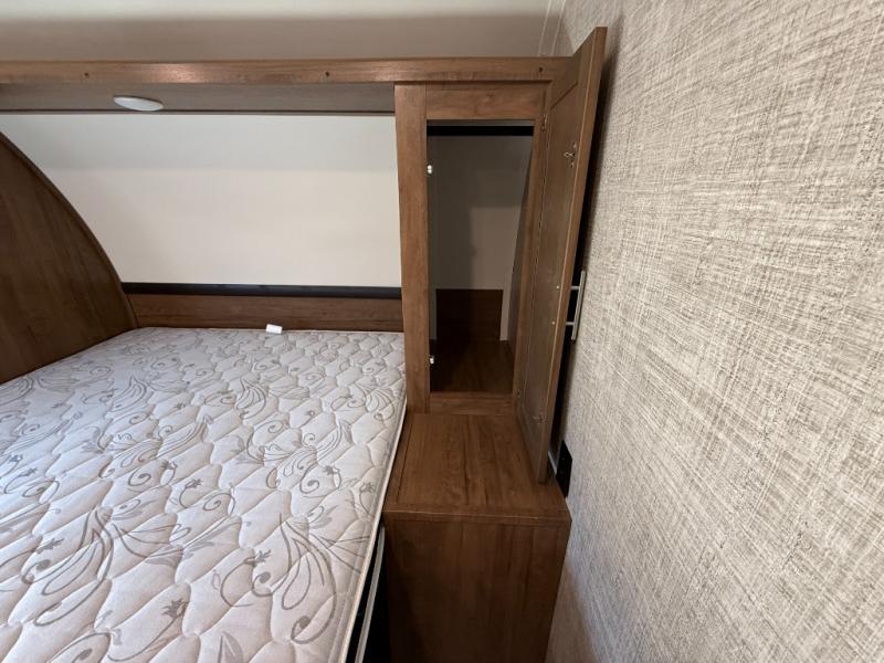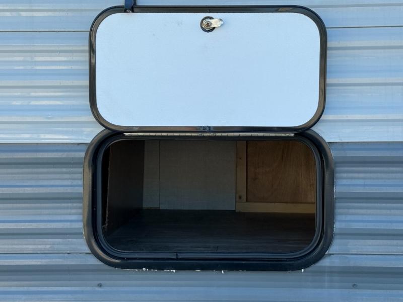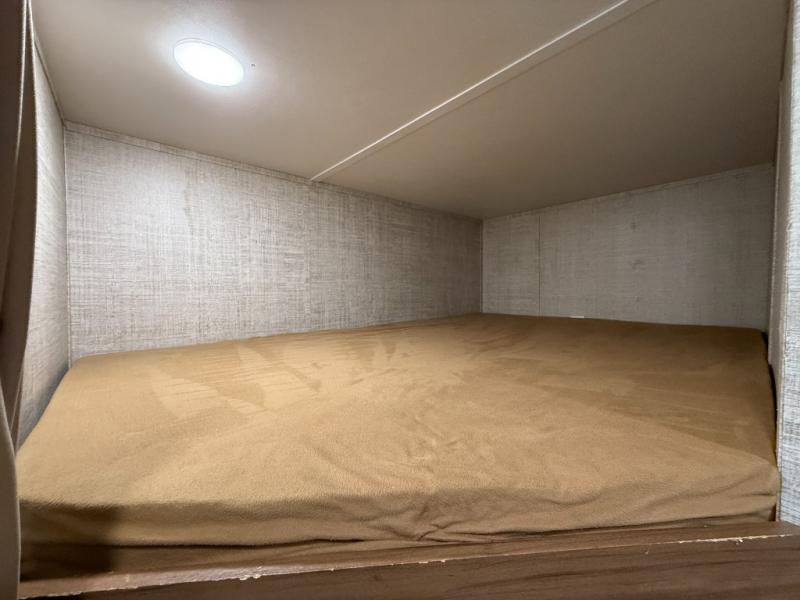 You and your family will enjoy sleeping in this trailer with double size bunk beds for the kids and their friends, a queen bed for the parents or choose the optional Murphy bed/sofa, and a booth dinette to sleep one more! The seven of you can wake up and take a hike or walk around the campgrounds, and someone can stay back to make breakfast in the galley kitchen with everything needed for warm meals. Everyone can take turns getting ready in the private toilet and tub/shower room while others take turns brushing their teeth in the single bath sink just outside the bath door. You will find plenty of storage for your clothes, dishes, and your outdoor camping gear in the pass-through compartment.