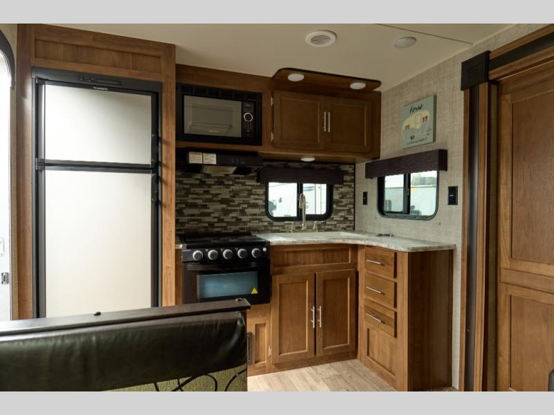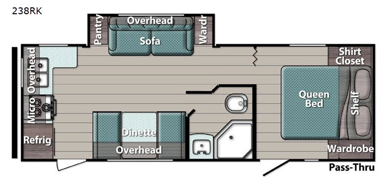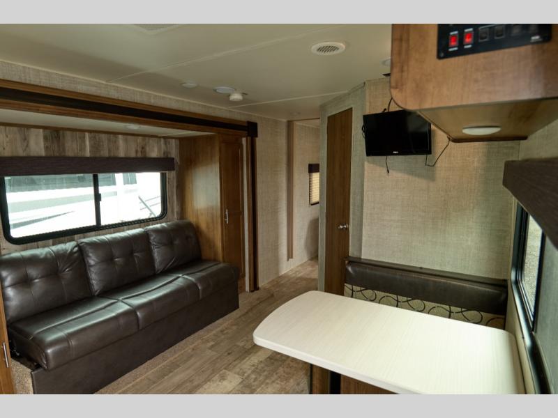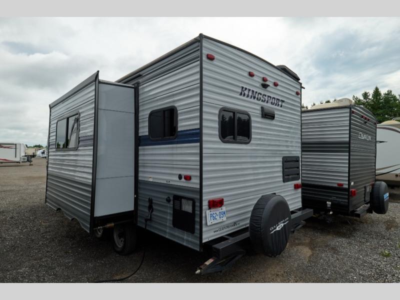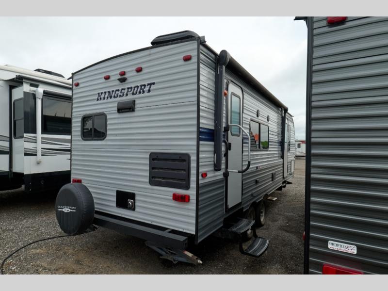 This dual-entry Kingsport Ultra Lite travel trailer is ready to go whenever you are! You will enjoy all of the conveniences this model has to offer from the rear kitchen and the front private bedroom with a queen bed to the booth dinette with overhead cabinets for storage. Across from the booth dinette is a sofa with a wardrobe on one side and a pantry on the other for you to quickly grab a snack before relaxing on the sofa. At the front of this unit is an exterior pass-through storage area for you to easily access and store your outdoor camping gear!