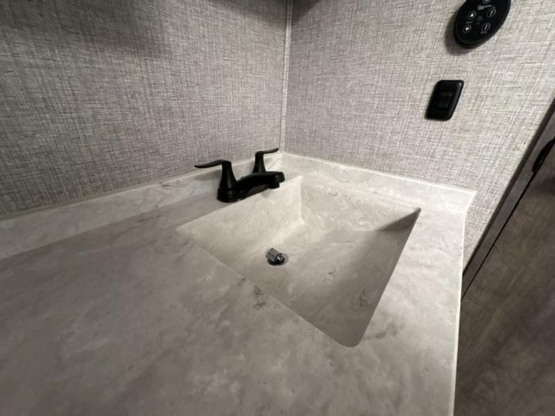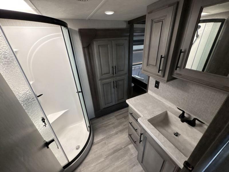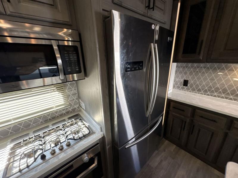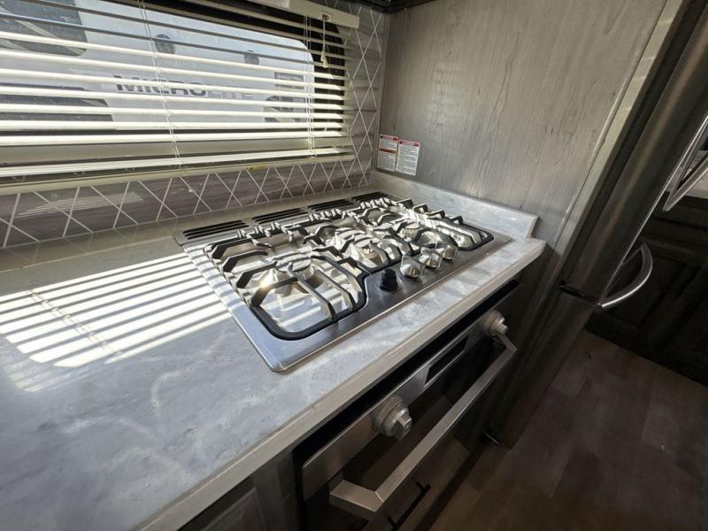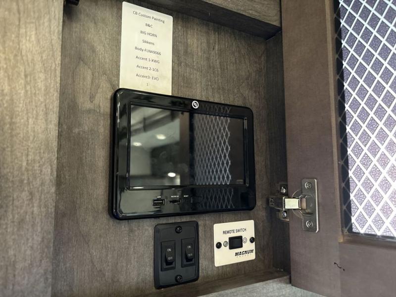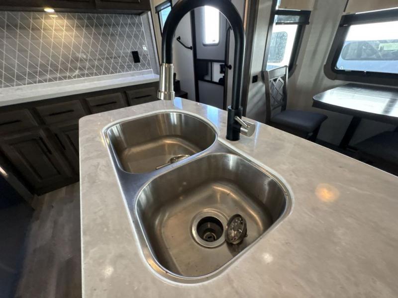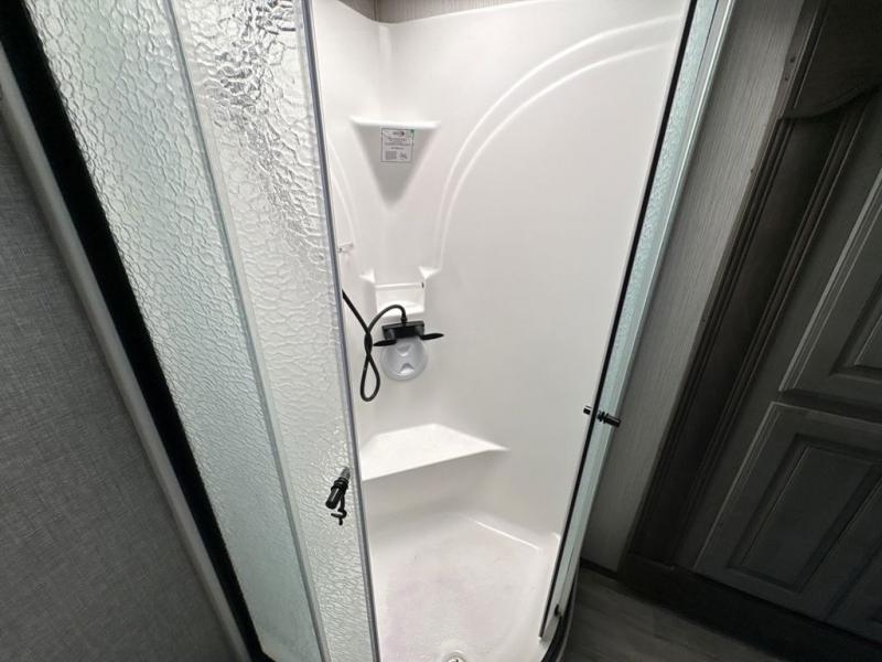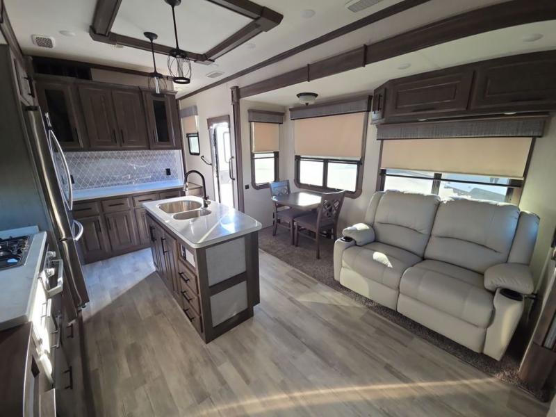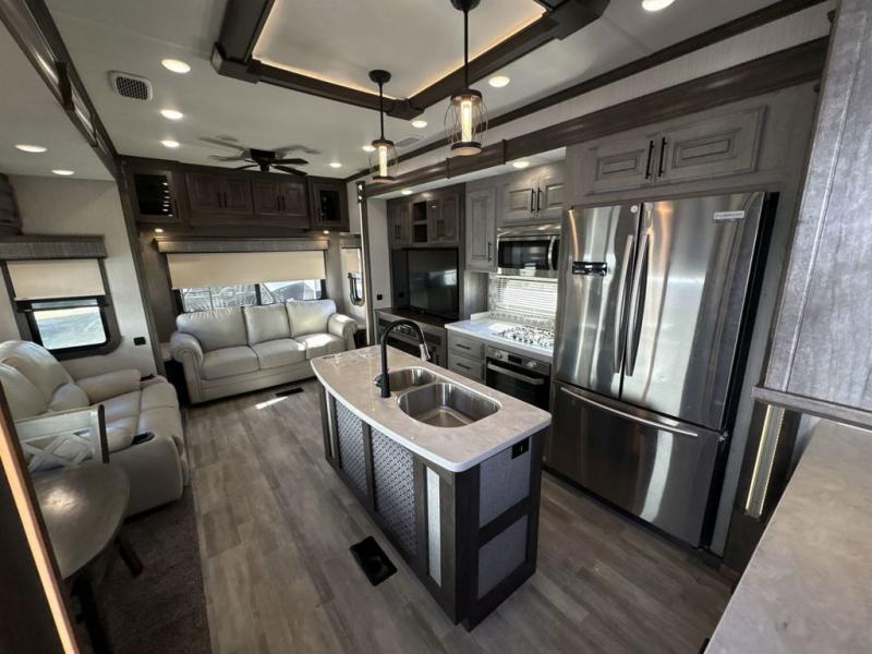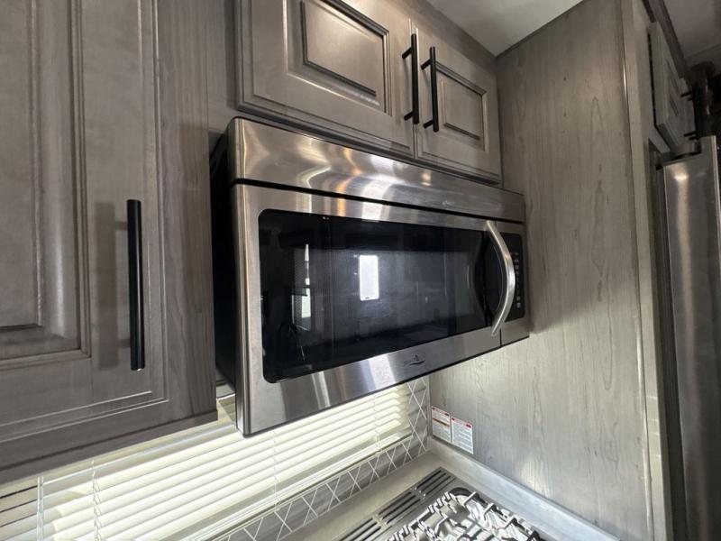 You will love spending your nights relaxing in comfort and style with this Bighorn fifth wheel! Because of the extended king bed slide, you have even more space in the front master suite to unwind from an exhausting and adventurous day, and since there is a private entrance into the bathroom, you can discreetly get ready in the morning. Head out to the kitchen and start your first pot of coffee while you fry some eggs on the three-burner cooktop or grab some juice from the 18 cubic foot stainless steel refrigerator. You can even sit down and eat your breakfast at the free-standing table with chairs, or you can put your feet up on the sleeper sofa or theater seating.