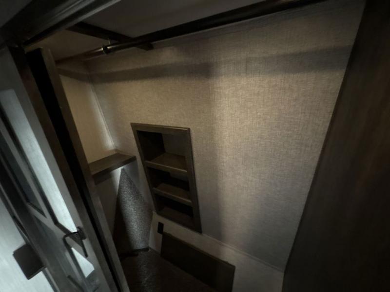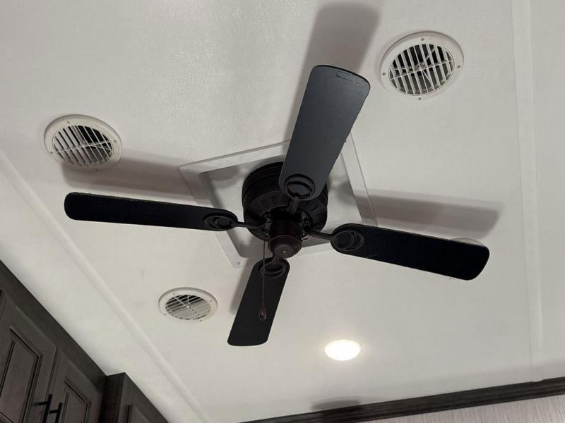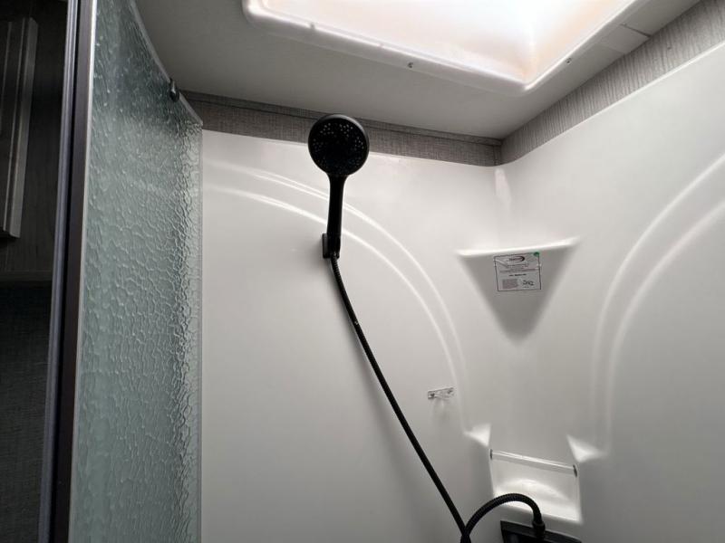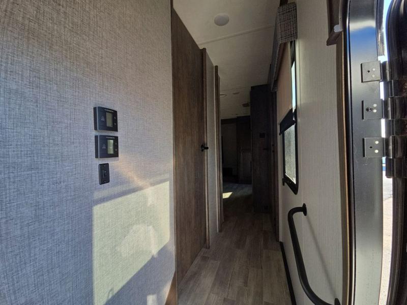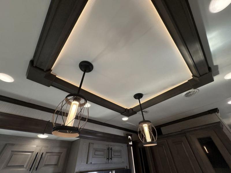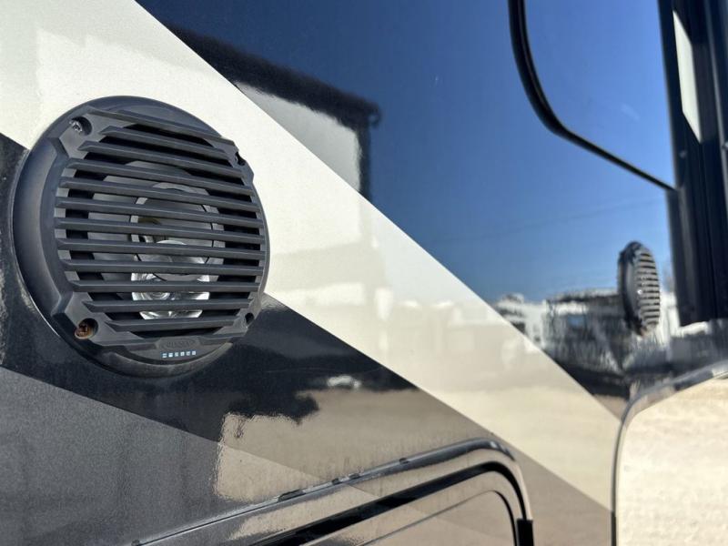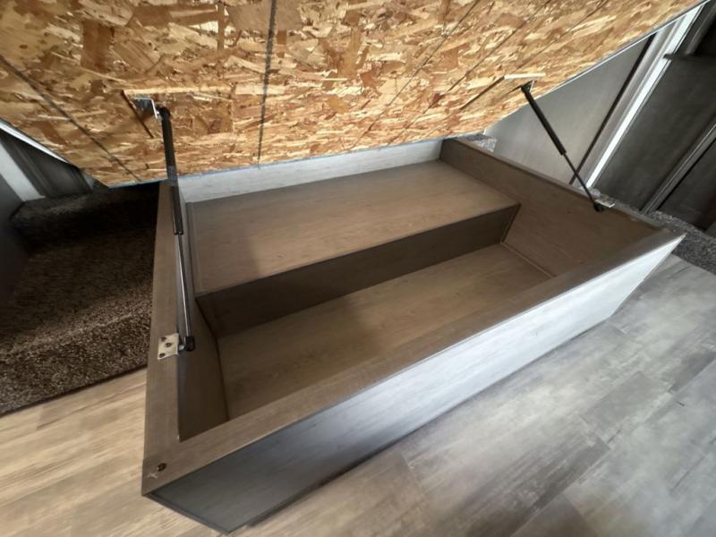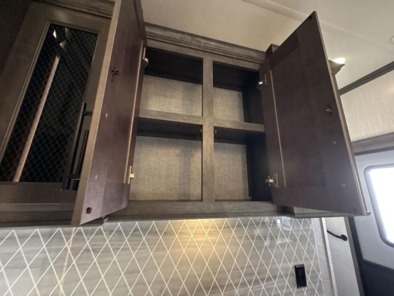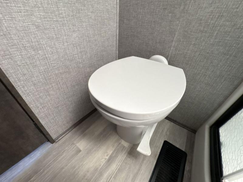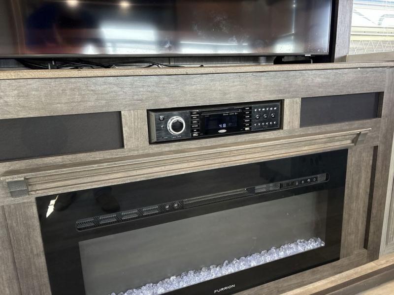 You will love spending your nights relaxing in comfort and style with this Bighorn fifth wheel! Because of the extended king bed slide, you have even more space in the front master suite to unwind from an exhausting and adventurous day, and since there is a private entrance into the bathroom, you can discreetly get ready in the morning. Head out to the kitchen and start your first pot of coffee while you fry some eggs on the three-burner cooktop or grab some juice from the 18 cubic foot stainless steel refrigerator. You can even sit down and eat your breakfast at the free-standing table with chairs, or you can put your feet up on the sleeper sofa or theater seating.
