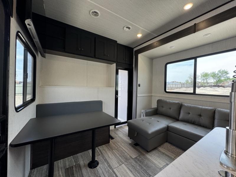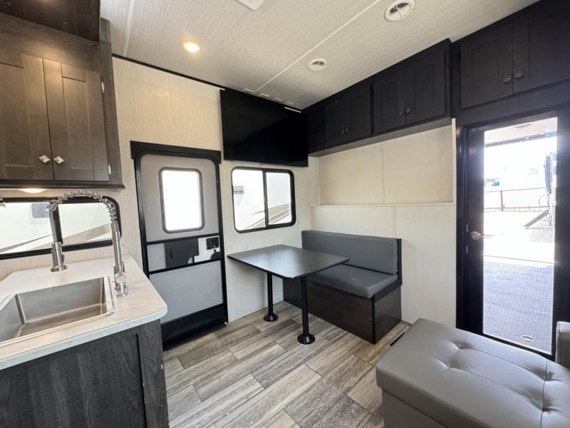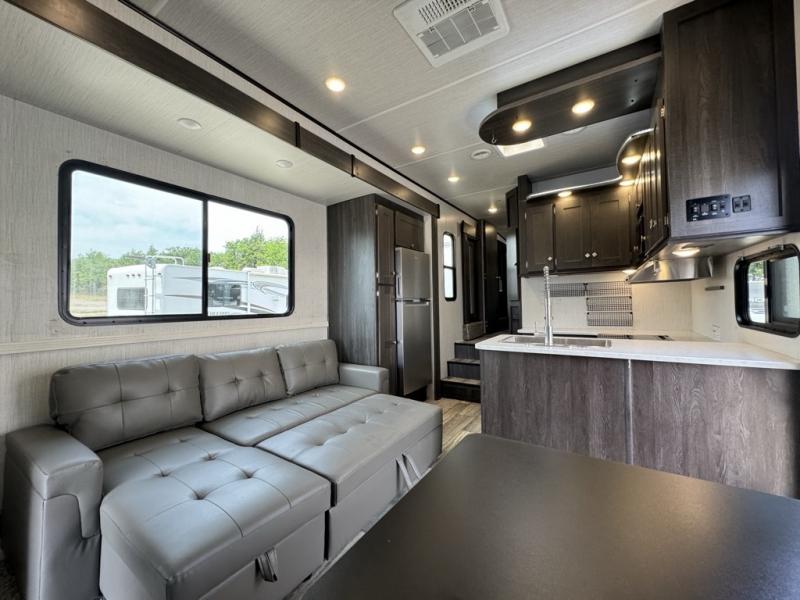 You will love how helpful and fun this Fuel toy hauler will be for you and your family! With the queen-size electric bunk, overhead loft, opposing sofas, and queen-size bed in the master suite, this unit can sleep nine people which makes it a great choice even if you don't have extra toys that you want to bring along in the 13' separate garage. You will also appreciate having two entry doors for quick and easy access while you are unloading and setting up at the campground, and the outdoor kitchen will be a fun spot to grill up some hamburgers after you've prepared the site.
