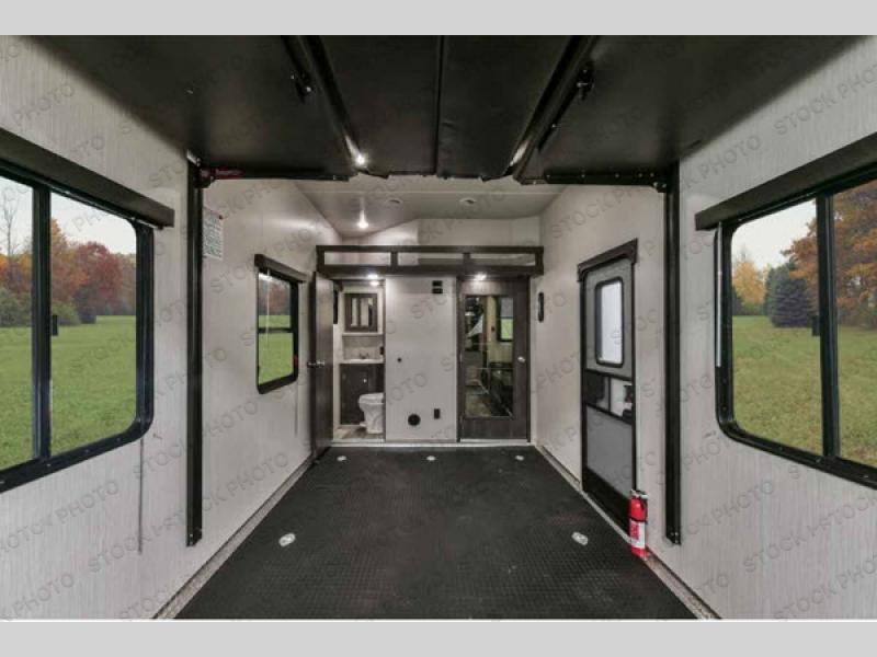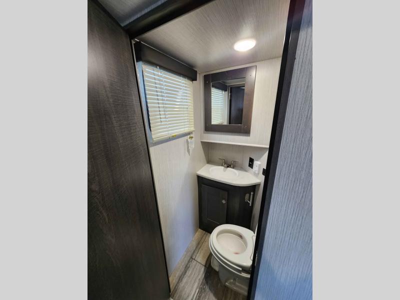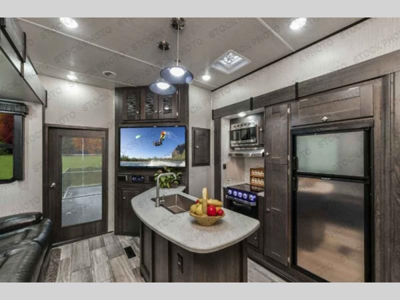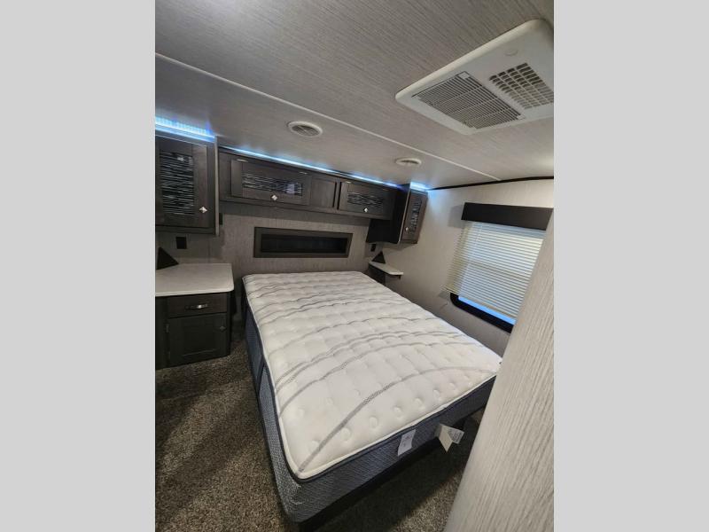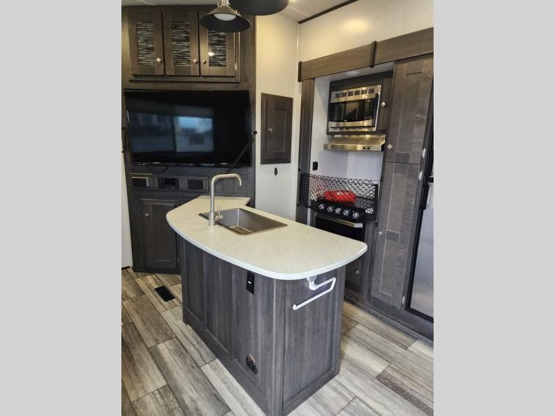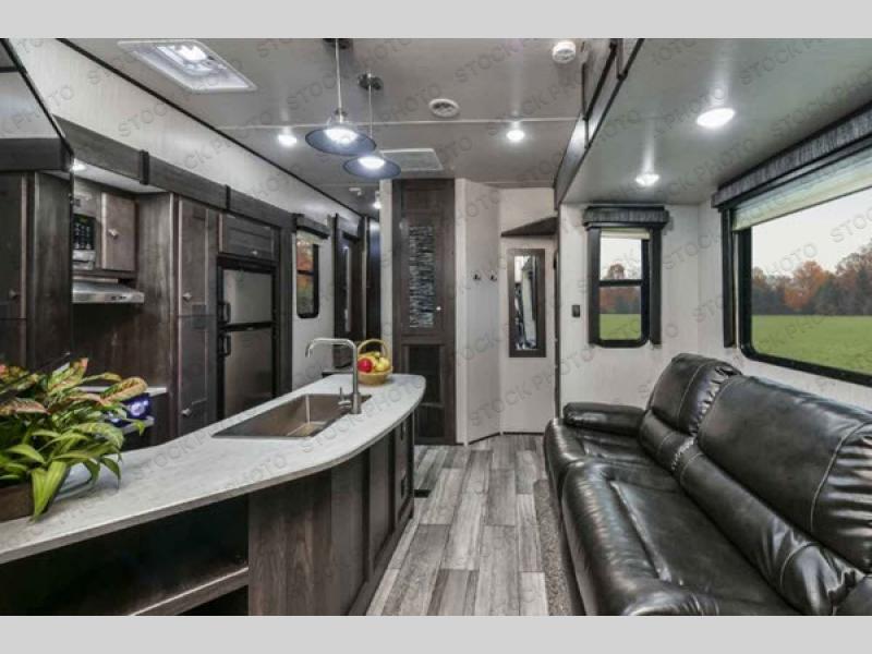 If you like to keep the dirt out of the main living area, this toy hauler gives you a separate garage with a side man door, a half bath for those quick breaks, and a power queen bed above opposing sofas with a dinette so the dirty shoes and all can stay in this area. After hitting the trails, you can get cleaned up in the full bathroom with a seated shower, make a meal in the kitchen and serve everyone from the counter peninsula then relax on the reclining sofa. The dual slides in this space offer everyone enough room to stretch out and recoup from the ride. And don't forget about your oasis in the front private bedroom with plenty of storage for your clothing and such.