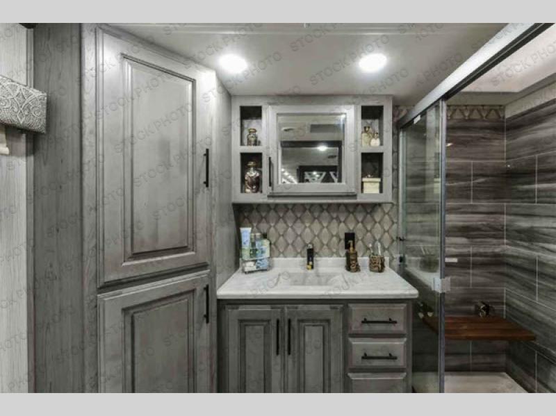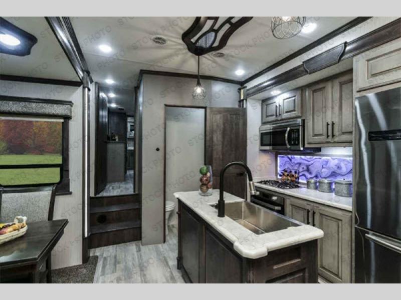 Don't forget to pack your sense of adventure before you take off with this Landmark 365 fifth wheel! This model lets you feel like you've never left home with its separate living room up front and its completely accommodating master suite in the back. In the central living area, there is an additional half bath next to the kitchen so that you don't have to go far while you are preparing dinner on the three-burner gas cooktop or in the convection microwave. Sit down with a hot meal at the free-standing table with chairs before heading outside to check out the night sky underneath the two electric awnings with LED lights.