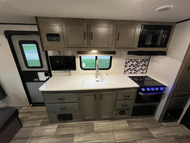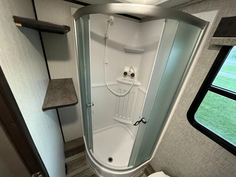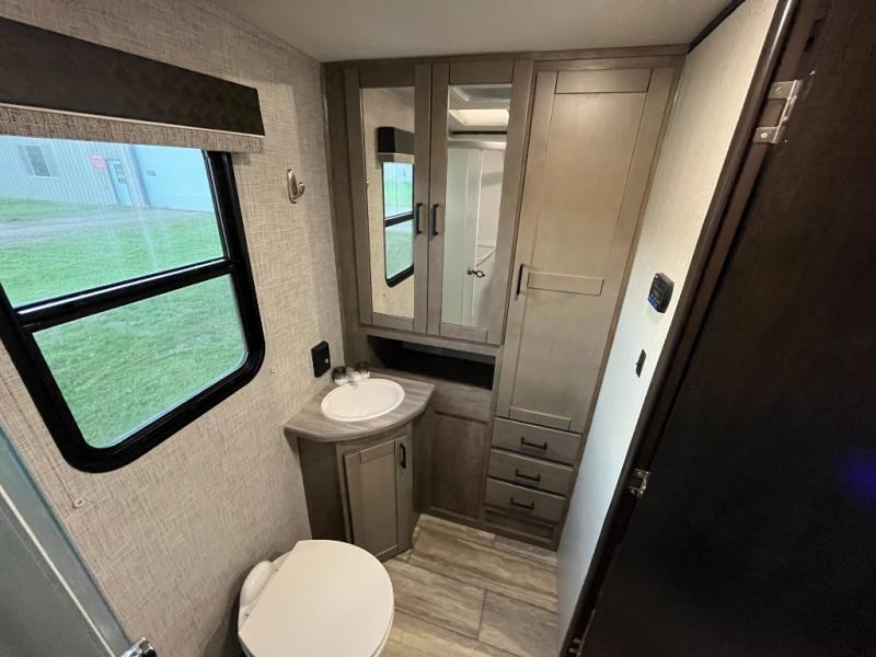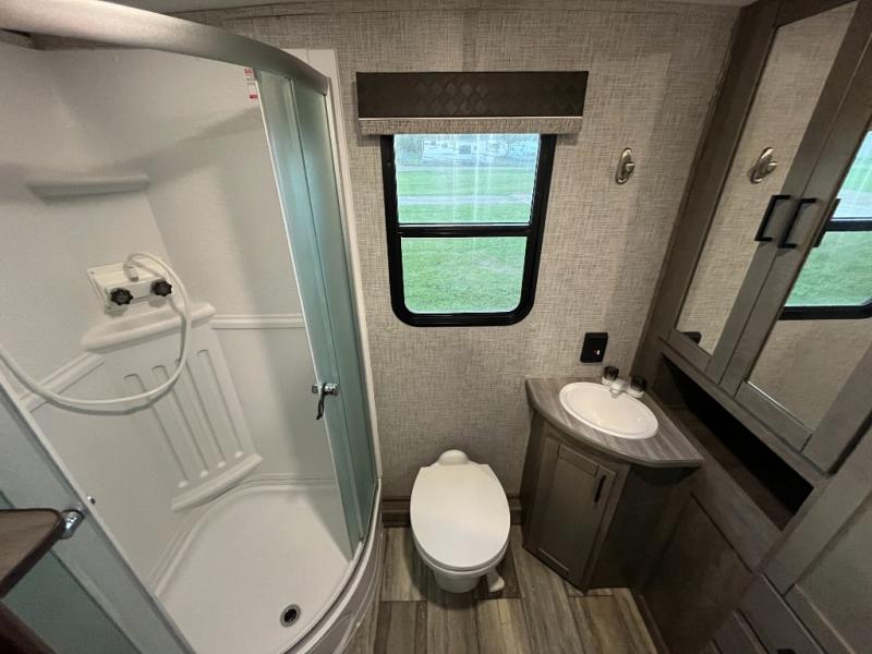 Are you ready for relaxing days and evenings filled with sitting around the campfire visiting with your family? You will want this single-slide North Trail travel trailer! This model can easily sleep six people, and after you set up camp, you can come inside and enjoy the comforts throughout from the sofa to the U-shaped dinette where you can eat your meals or play a card game or two. The rear bathroom features extra storage and a neo-angled shower, and when you are ready to turn in for the night, come enjoy the front bedroom!