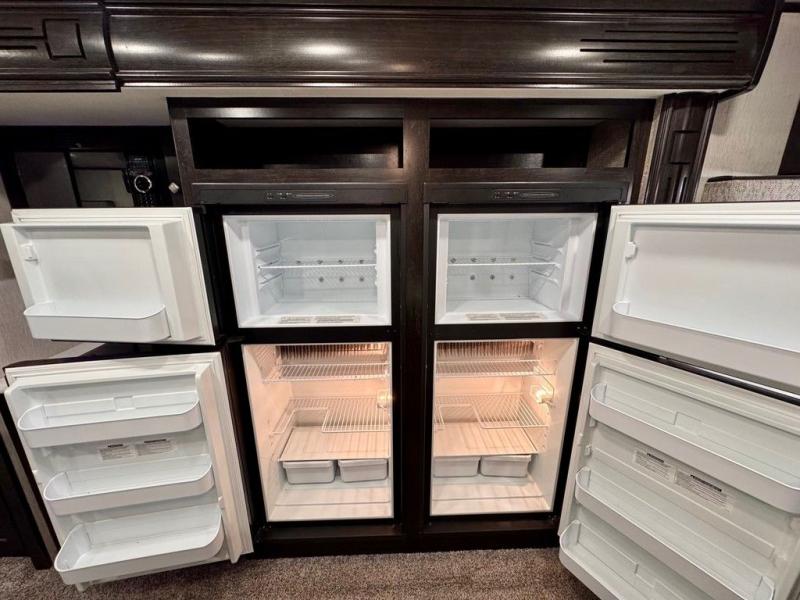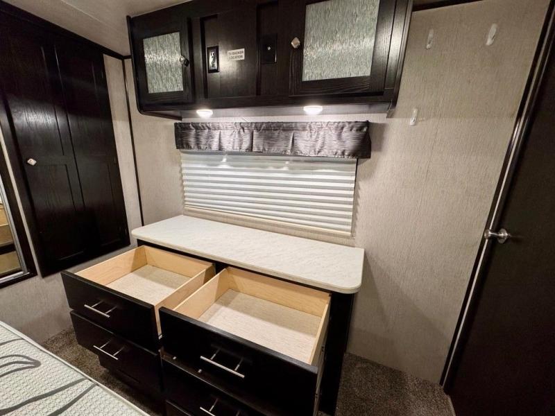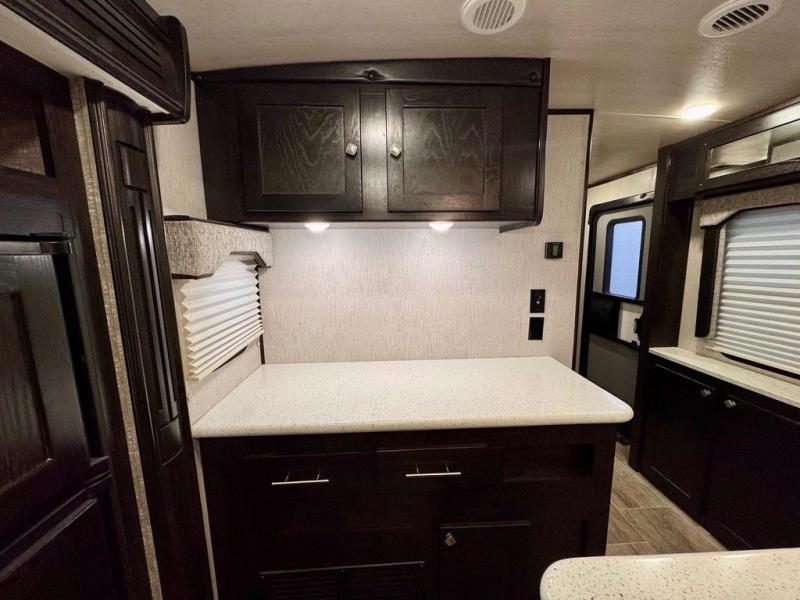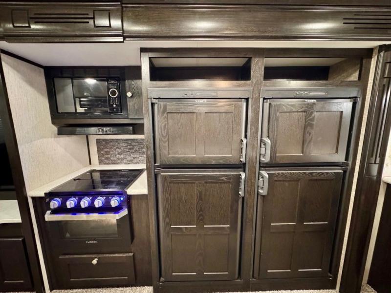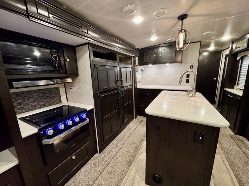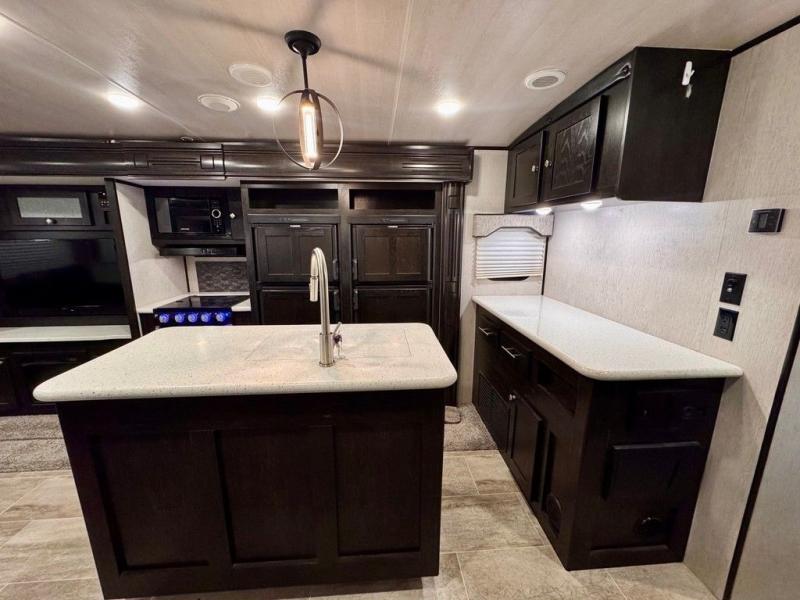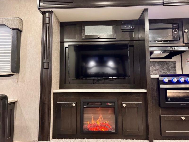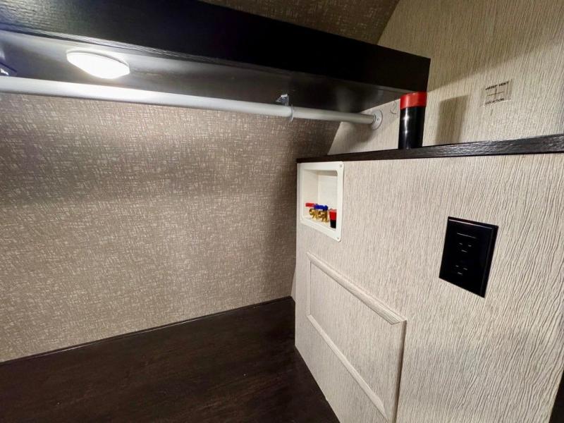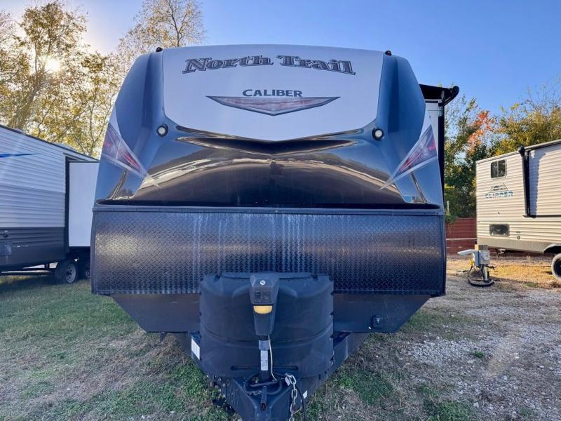 The amenities inside this North Trail travel trailer will have you smiling the whole time you are on vacation! All of these comforts will make anywhere you park and camp feel like home. A second entry within the bath leads right into the front master suite where you can rest easily on the king bed that slides out to create a more spacious and inviting room. You will love the abundant storage within the full-wall wardrobe that has been prepped for a washer and dryer. In the kitchen, you can stock up on refreshments and food with a nice double-door refrigerator, and the abundant counter space between the island and added counter area adjacent to the refrigerator will make your food prep and entertaining a breeze. You will also enjoy kicking back with your feet up in the theater seating found opposite the entertainment center for your enjoyment!