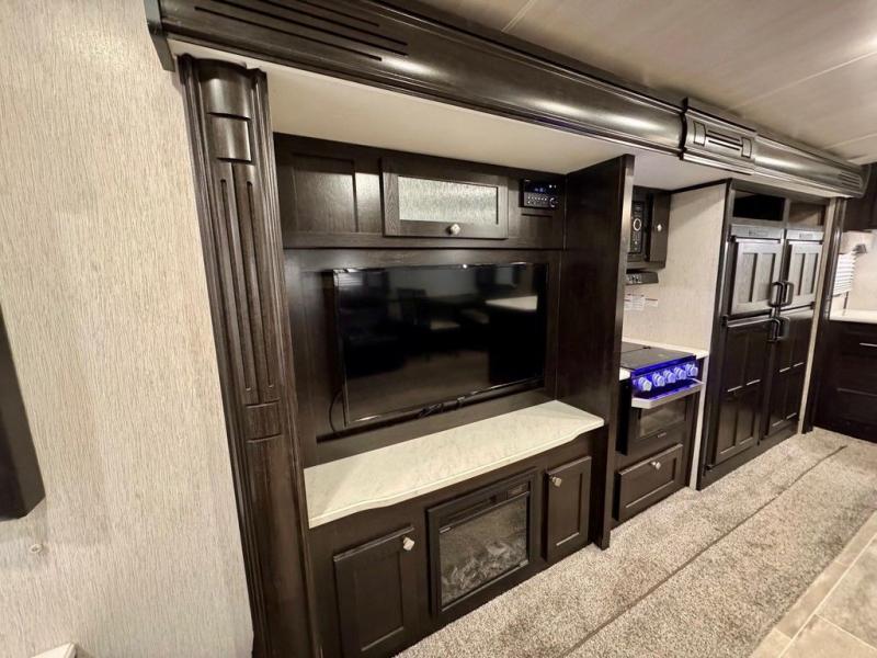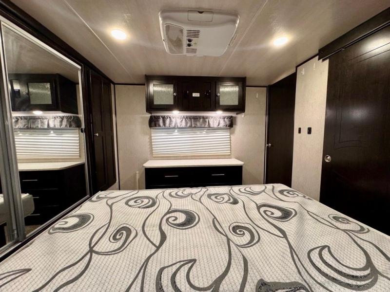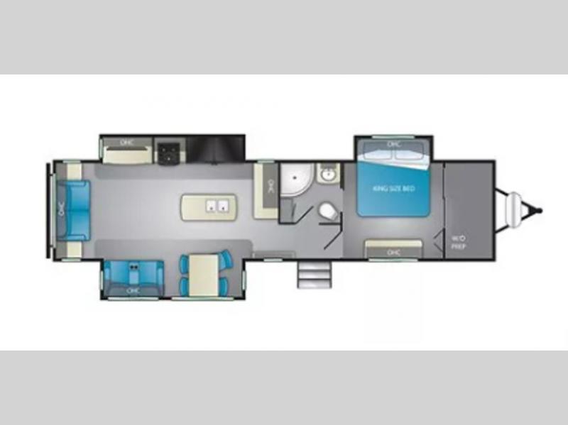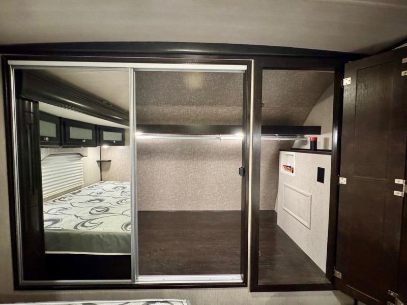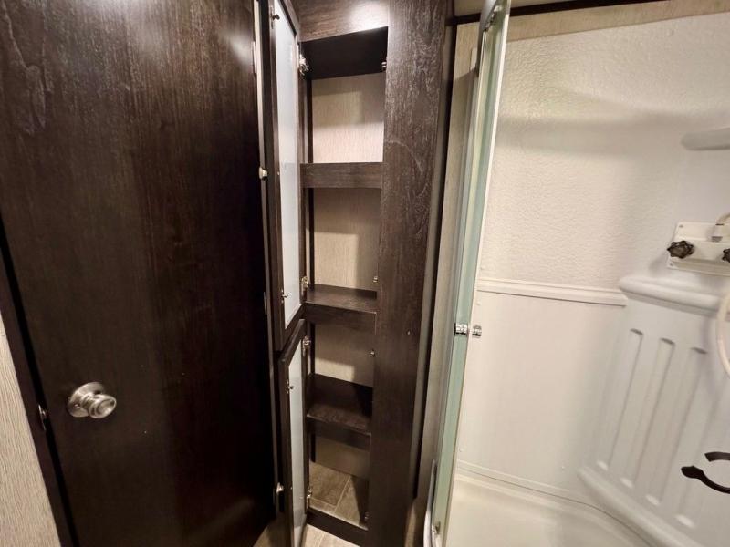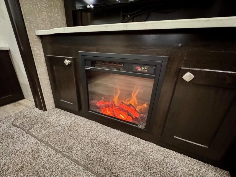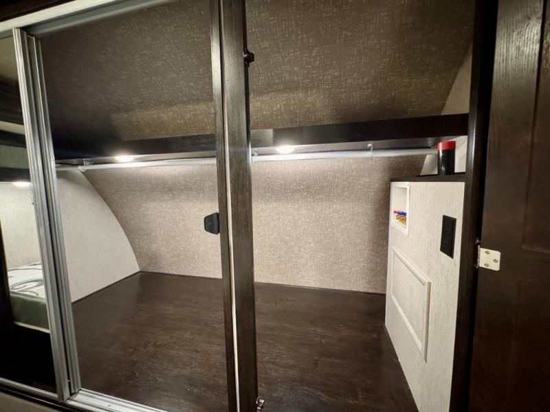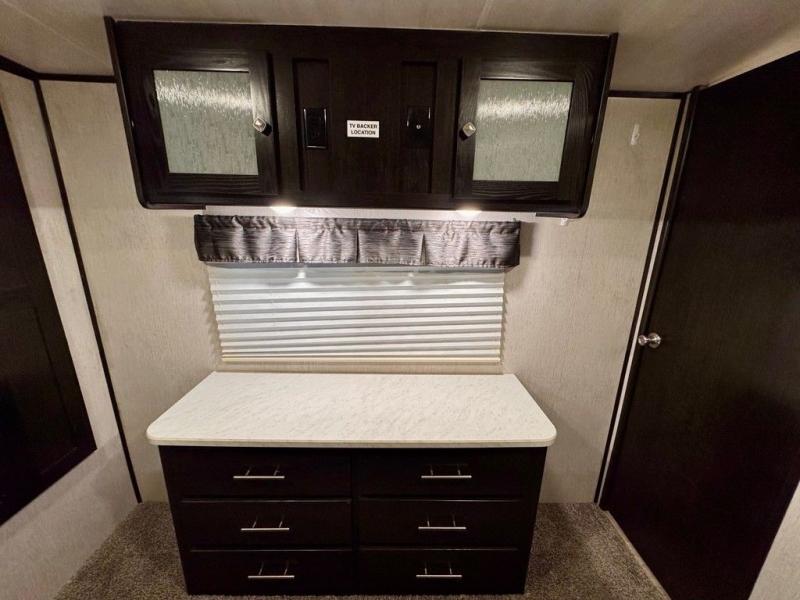 The amenities inside this North Trail travel trailer will have you smiling the whole time you are on vacation! All of these comforts will make anywhere you park and camp feel like home. A second entry within the bath leads right into the front master suite where you can rest easily on the king bed that slides out to create a more spacious and inviting room. You will love the abundant storage within the full-wall wardrobe that has been prepped for a washer and dryer. In the kitchen, you can stock up on refreshments and food with a nice double-door refrigerator, and the abundant counter space between the island and added counter area adjacent to the refrigerator will make your food prep and entertaining a breeze. You will also enjoy kicking back with your feet up in the theater seating found opposite the entertainment center for your enjoyment!