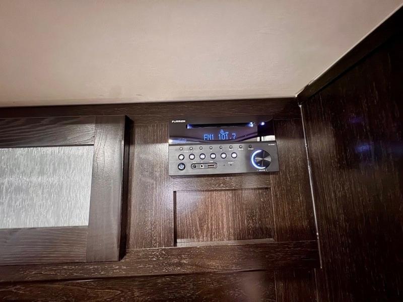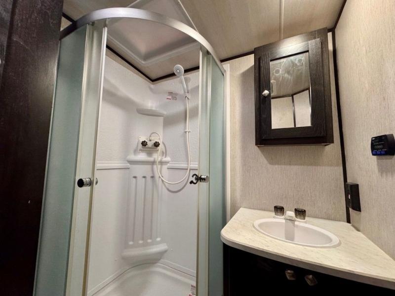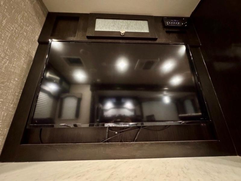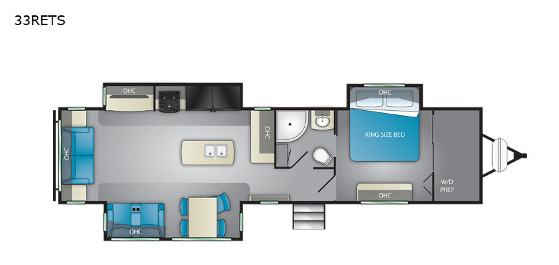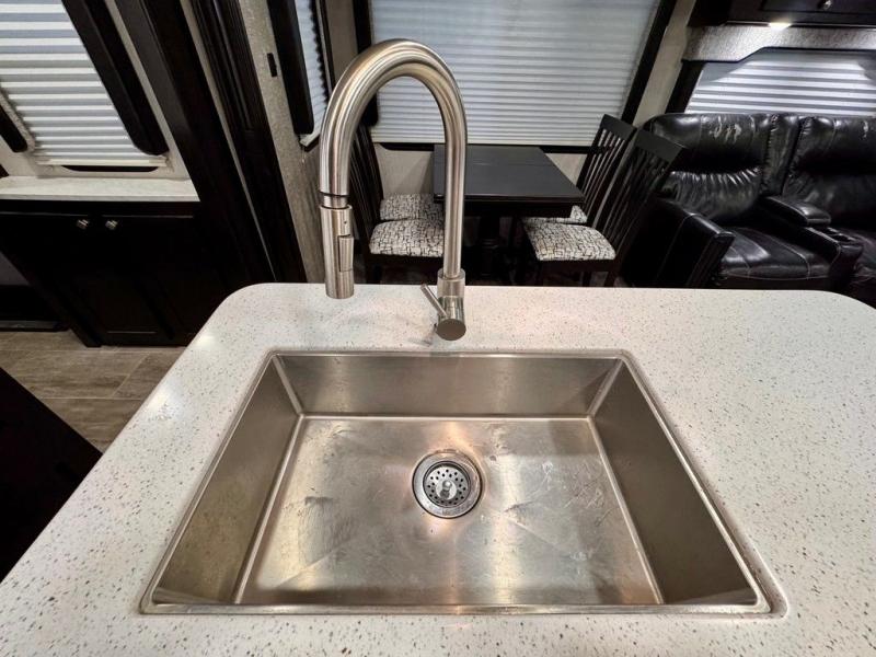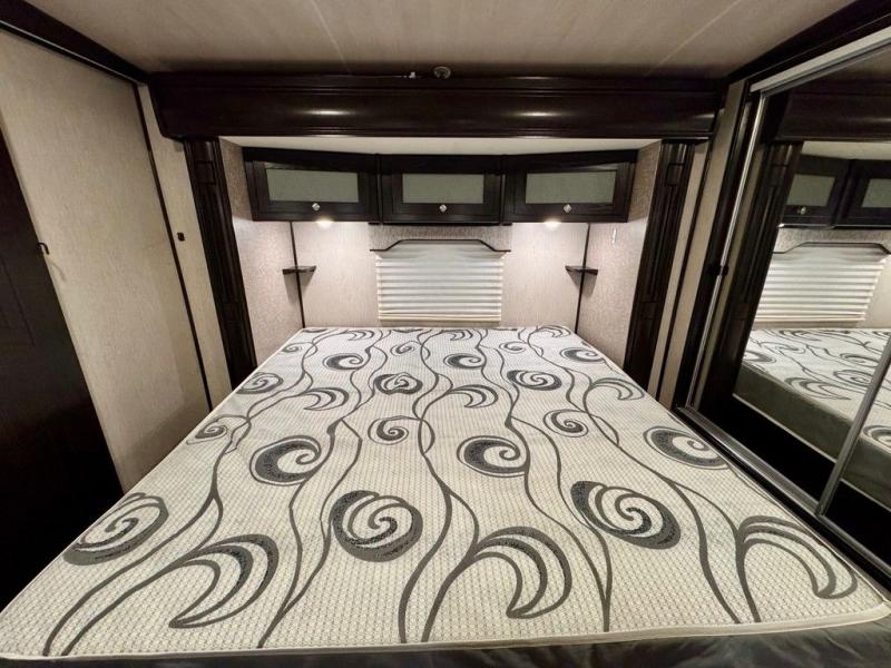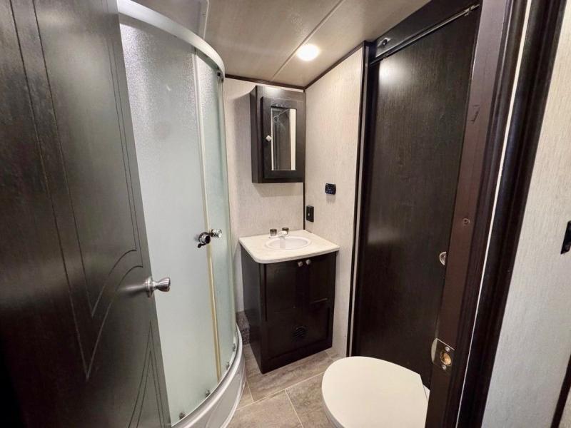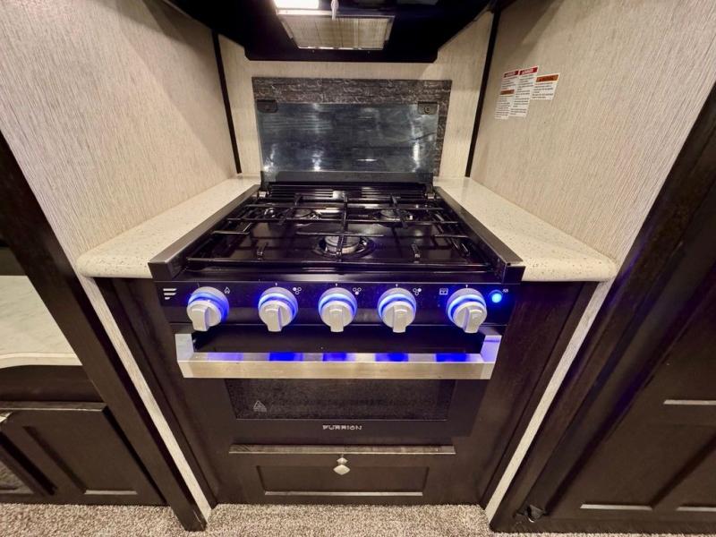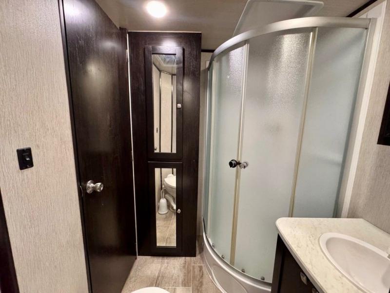 The amenities inside this North Trail travel trailer will have you smiling the whole time you are on vacation! All of these comforts will make anywhere you park and camp feel like home. A second entry within the bath leads right into the front master suite where you can rest easily on the king bed that slides out to create a more spacious and inviting room. You will love the abundant storage within the full-wall wardrobe that has been prepped for a washer and dryer. In the kitchen, you can stock up on refreshments and food with a nice double-door refrigerator, and the abundant counter space between the island and added counter area adjacent to the refrigerator will make your food prep and entertaining a breeze. You will also enjoy kicking back with your feet up in the theater seating found opposite the entertainment center for your enjoyment!