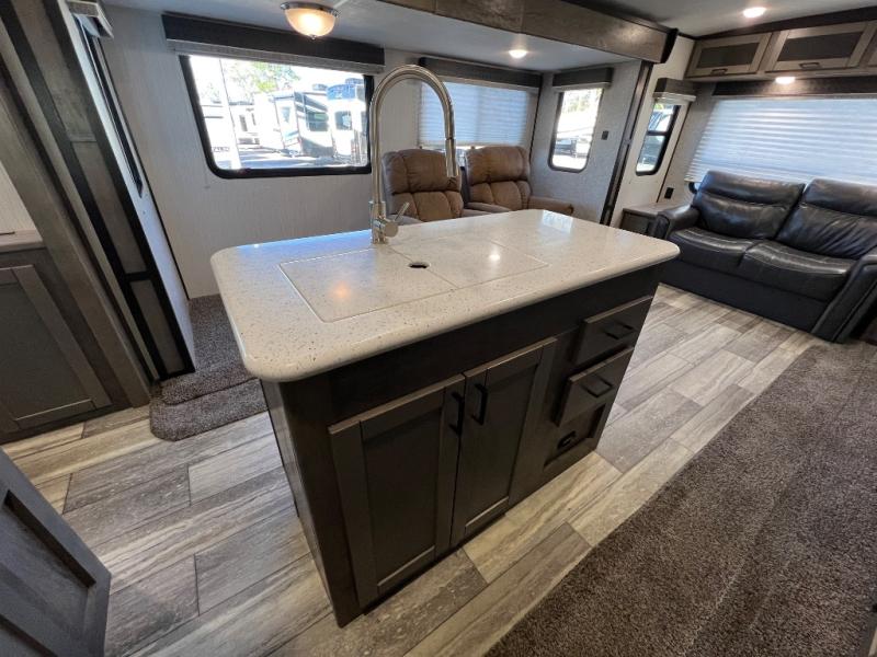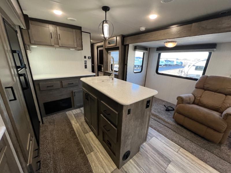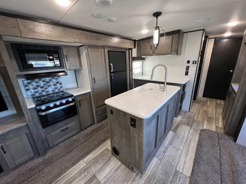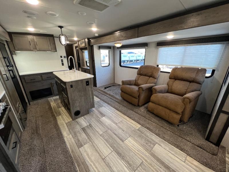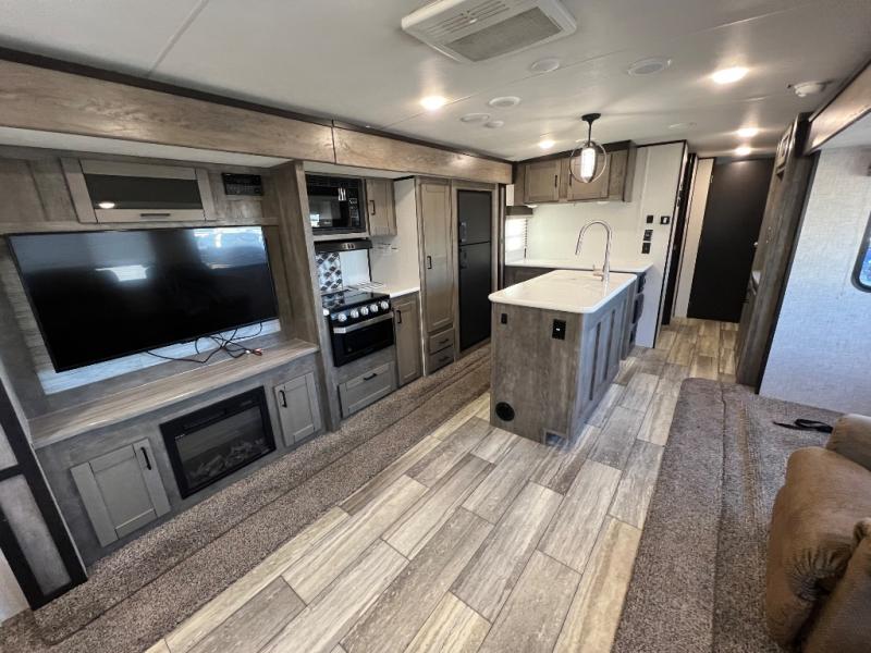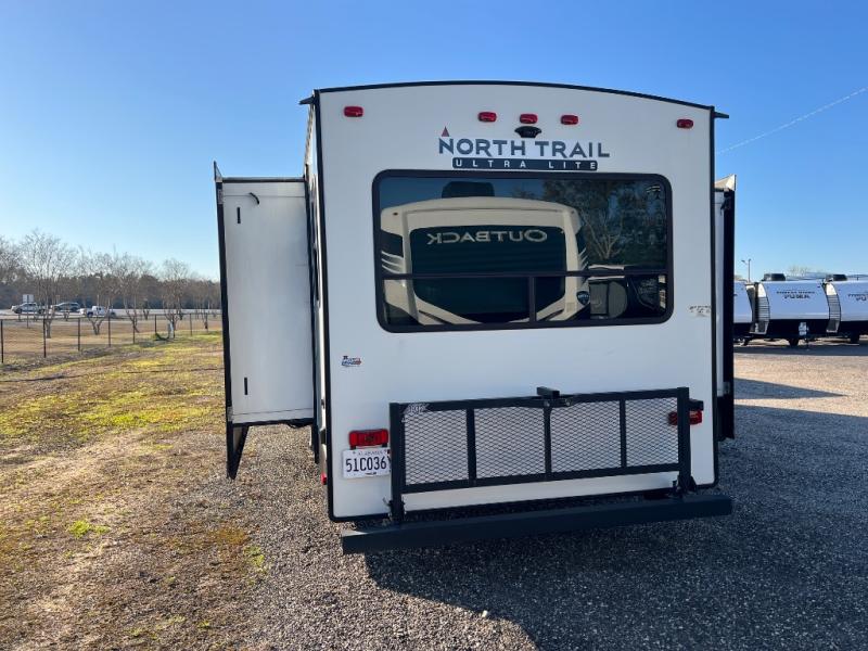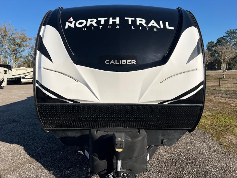 The amenities inside this North Trail travel trailer will have you smiling the whole time you are on vacation! All of these comforts will make anywhere you park and camp feel like home. A second entry within the bath leads right into the front master suite where you can rest easily on the king bed that slides out to create a more spacious and inviting room. You will love the abundant storage within the full-wall wardrobe that has been prepped for a washer and dryer. In the kitchen, you can stock up on refreshments and food with a nice double-door refrigerator, and the abundant counter space between the island and added counter area adjacent to the refrigerator will make your food prep and entertaining a breeze. You will also enjoy kicking back with your feet up in the theater seating found opposite the entertainment center for your enjoyment!