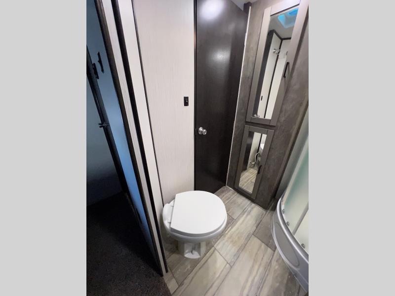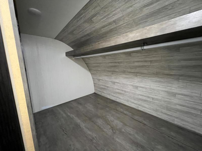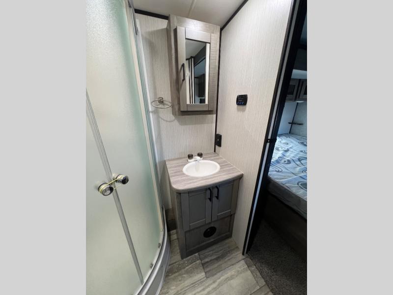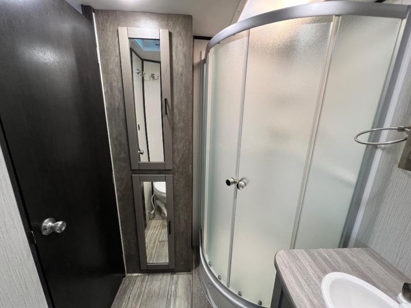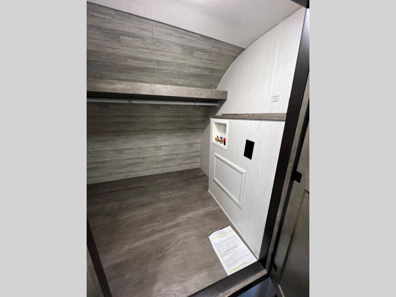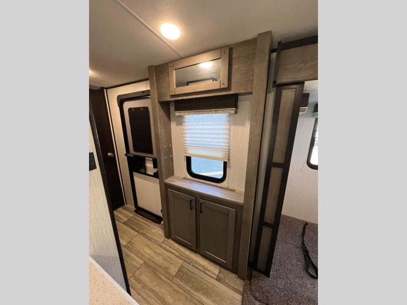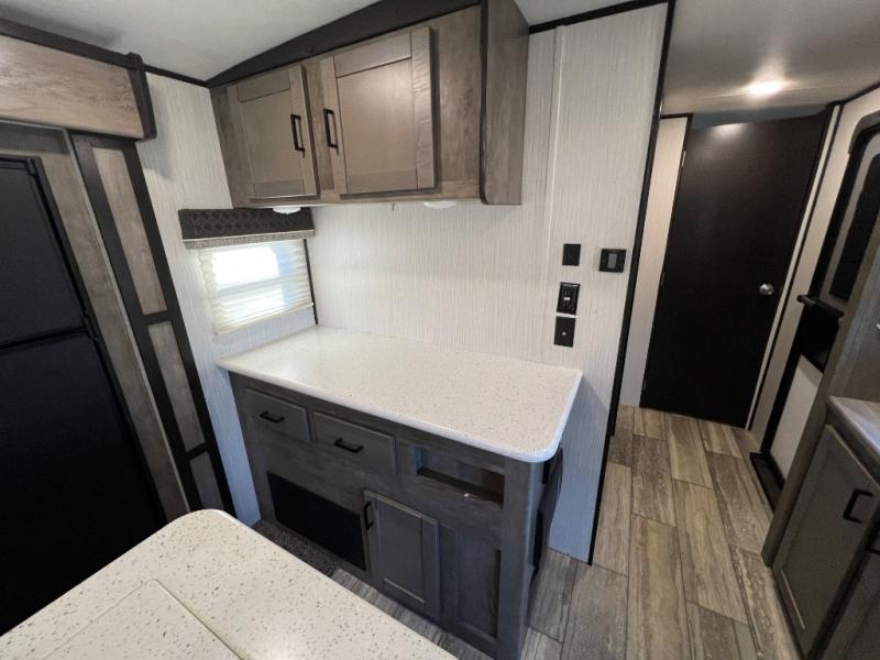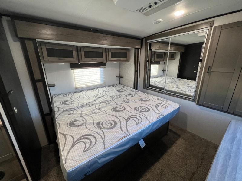 The amenities inside this North Trail travel trailer will have you smiling the whole time you are on vacation! All of these comforts will make anywhere you park and camp feel like home. A second entry within the bath leads right into the front master suite where you can rest easily on the king bed that slides out to create a more spacious and inviting room. You will love the abundant storage within the full-wall wardrobe that has been prepped for a washer and dryer. In the kitchen, you can stock up on refreshments and food with a nice double-door refrigerator, and the abundant counter space between the island and added counter area adjacent to the refrigerator will make your food prep and entertaining a breeze. You will also enjoy kicking back with your feet up in the theater seating found opposite the entertainment center for your enjoyment!