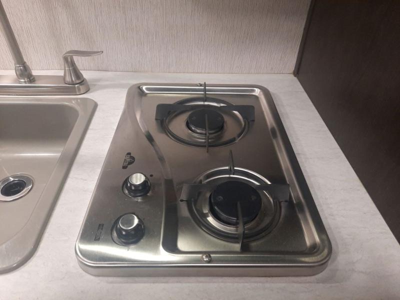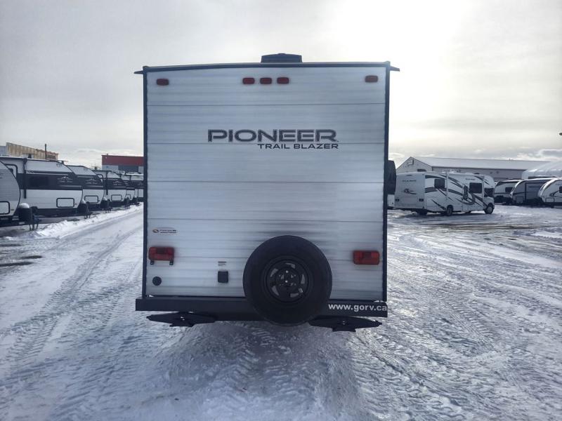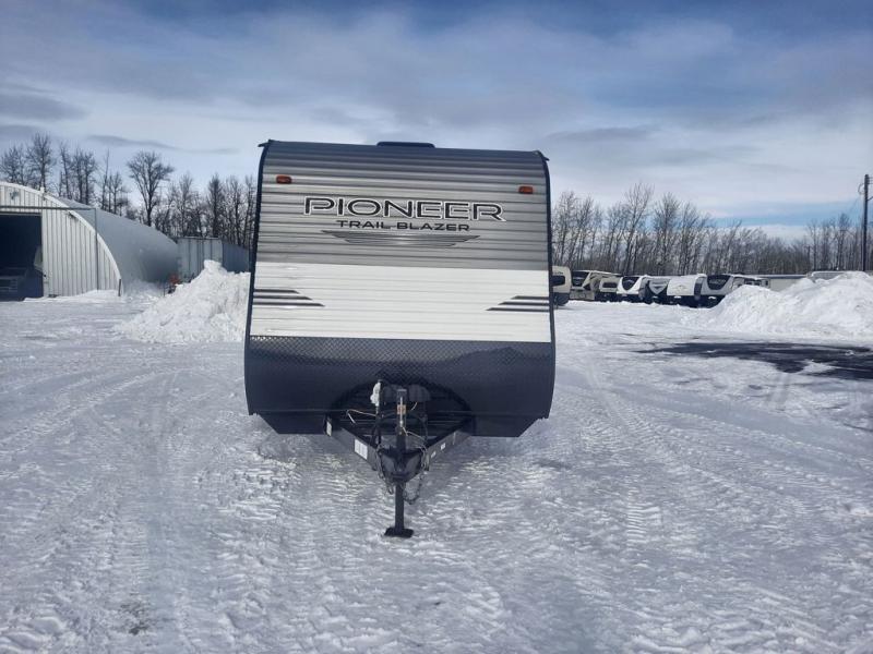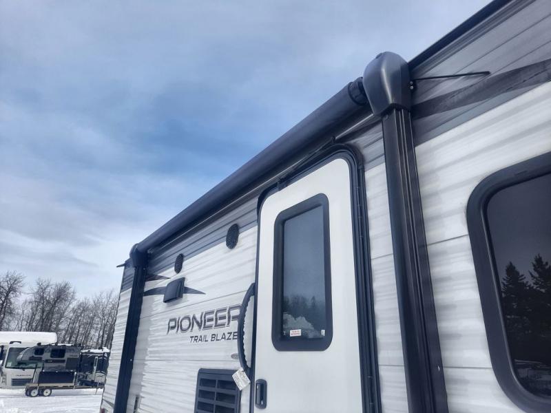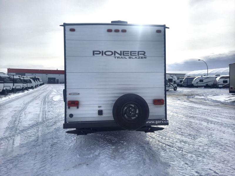 Discover what it's like to be free to roam with this Pioneer travel trailer! As you come inside after a long day of exhausting activities, you will certainly appreciate having your own bathroom where you can rinse off in the shower. Forget about the hassle of starting up a campfire in order to make dinner because the three-burner range will make it easy to cook like you do at home, and if you prefer to make dinner even more simple, you can just grab leftovers from the double-door refrigerator and heat them up in the microwave.
