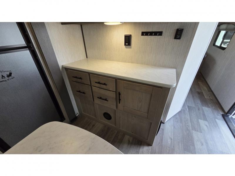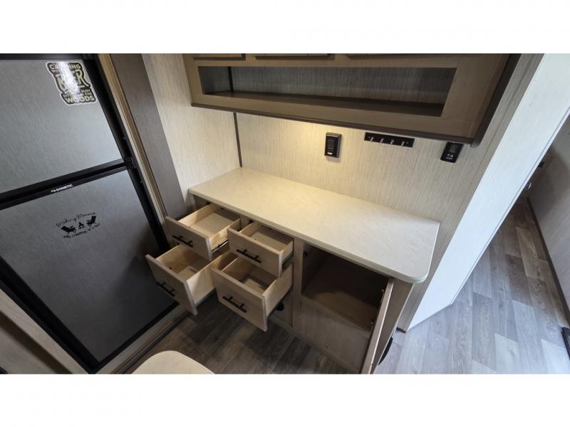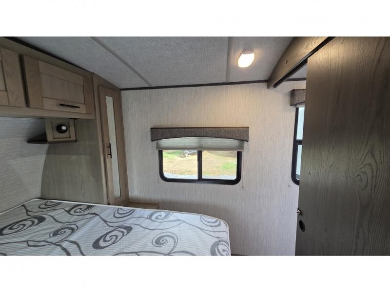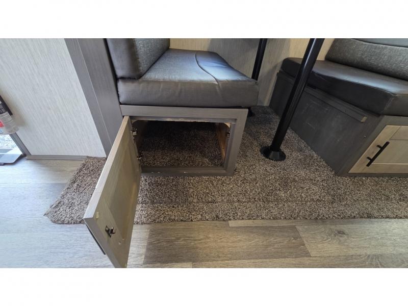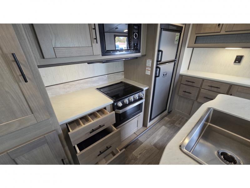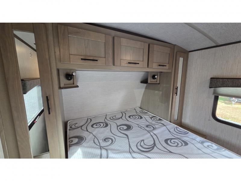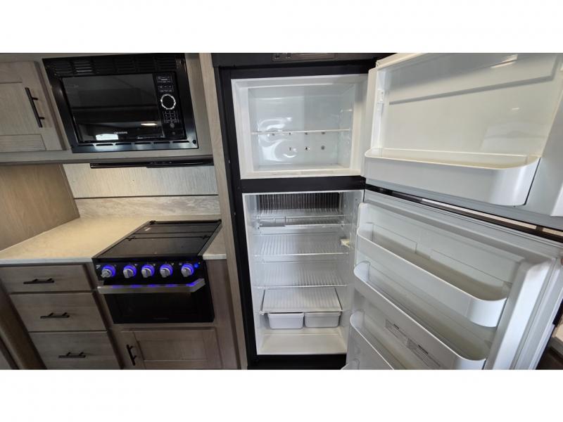 After an afternoon of hiking in the woods you can return to the comfort of your own accommodations such as a full bathroom, a bedroom, plus a kitchen and living area. There is plenty of room for meal prep on the kitchen island and on the extra counter space along the interior wall. The cook will love all the appliances also. The full bathroom is straight in from the entry door allowing quick access from outside. When it is time to turn in for the night then head to the front bedroom where you will find a queen bed and a space saving sliding door for privacy when you have overnight guests sleeping on the furniture. Step inside today!