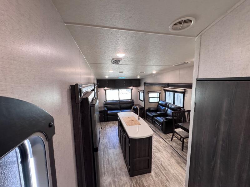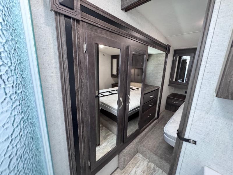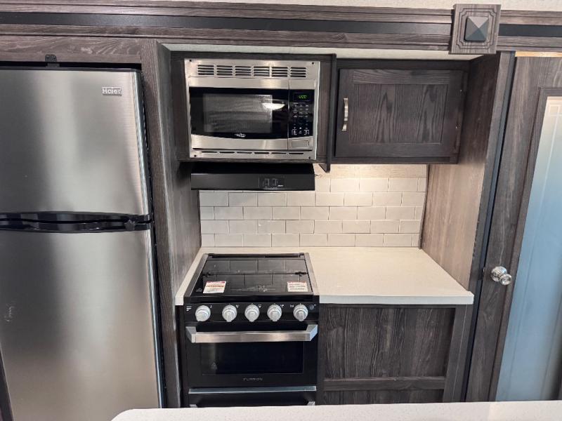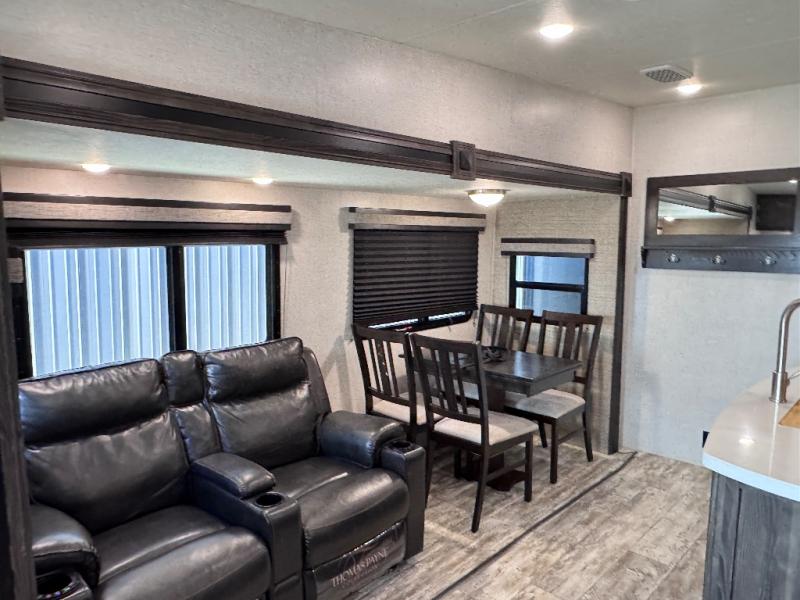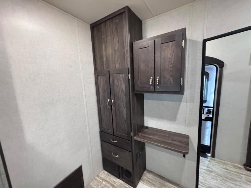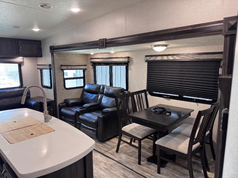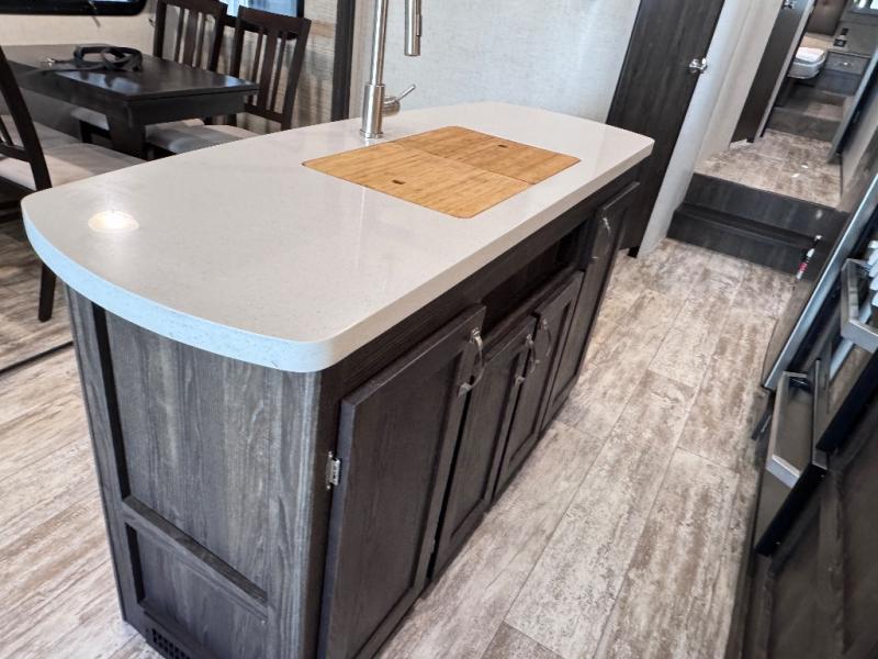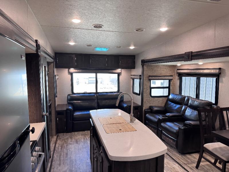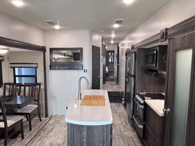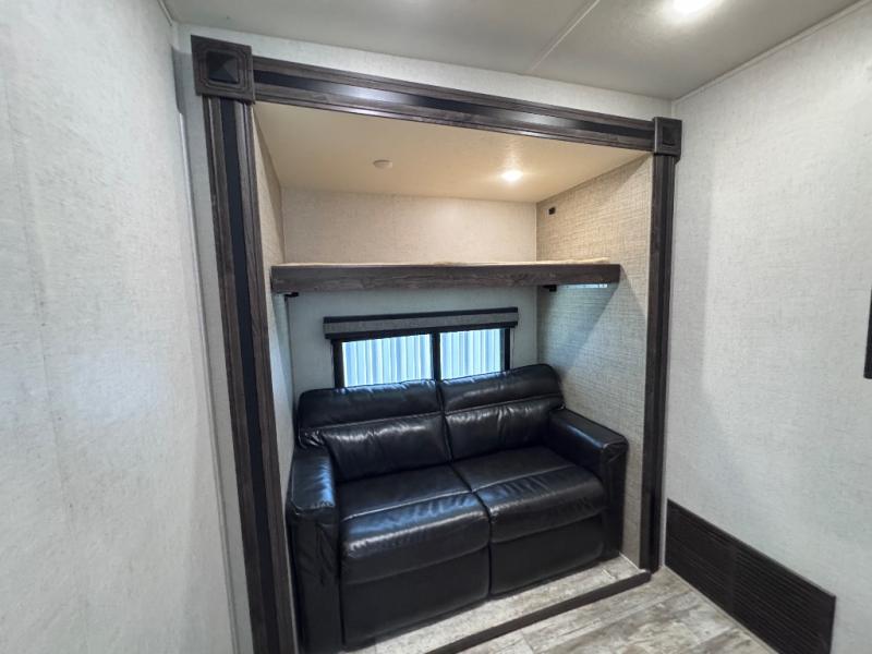 Been searching for a fifth wheel that can become your traveling office as well? You will find a middle bunk room with a desk to work from, a sofa to relax on, and a bunk offering extra sleeping space for overnight guests. When it's time to venture outside, you can cook on the exterior kitchen after going for a hike. Once you are ready for bedtime, the front bedroom will be your oasis to recharge, and the double entry bath allows you quick access at night. The main living and kitchen area is wide open with dual slides, provides the appliances you need to make meals including a center island, plus offers comfortable seating!