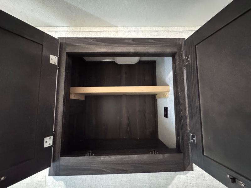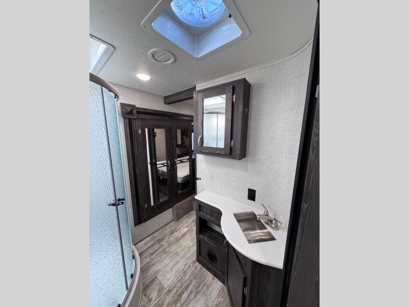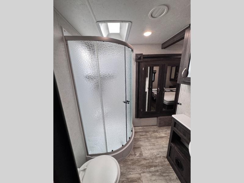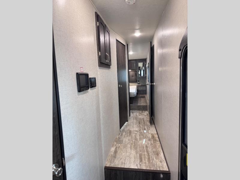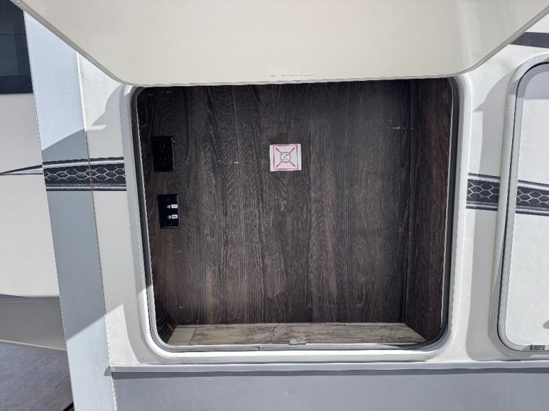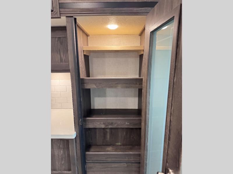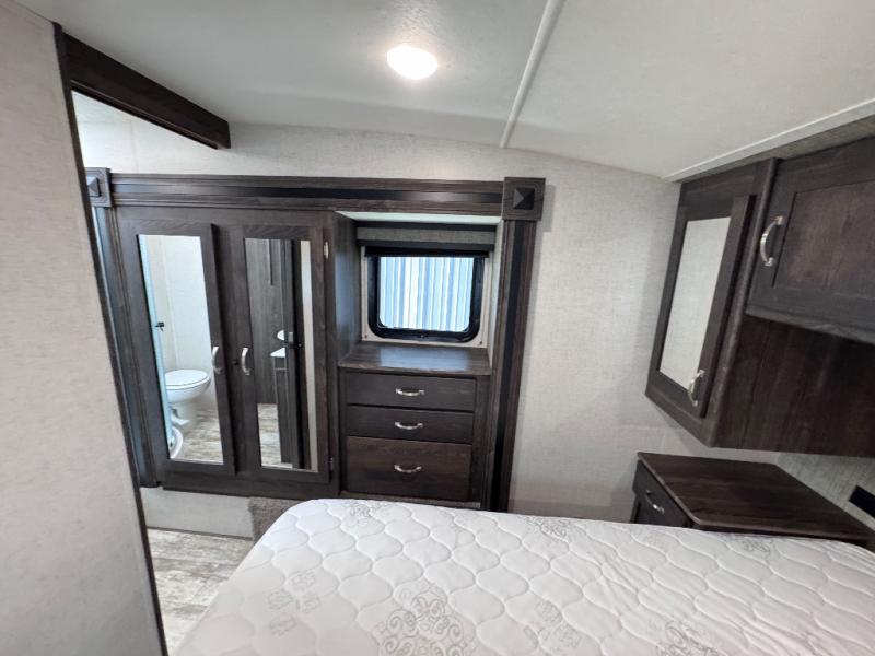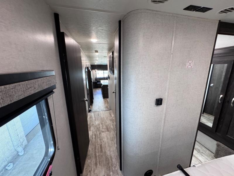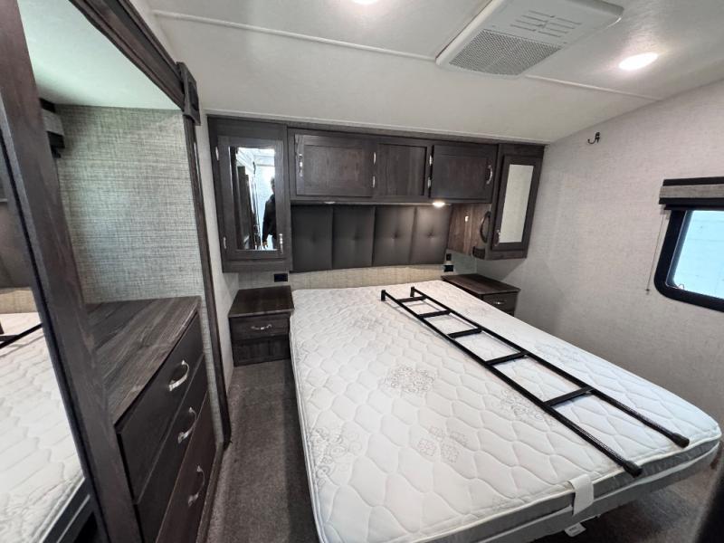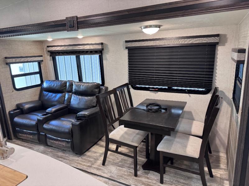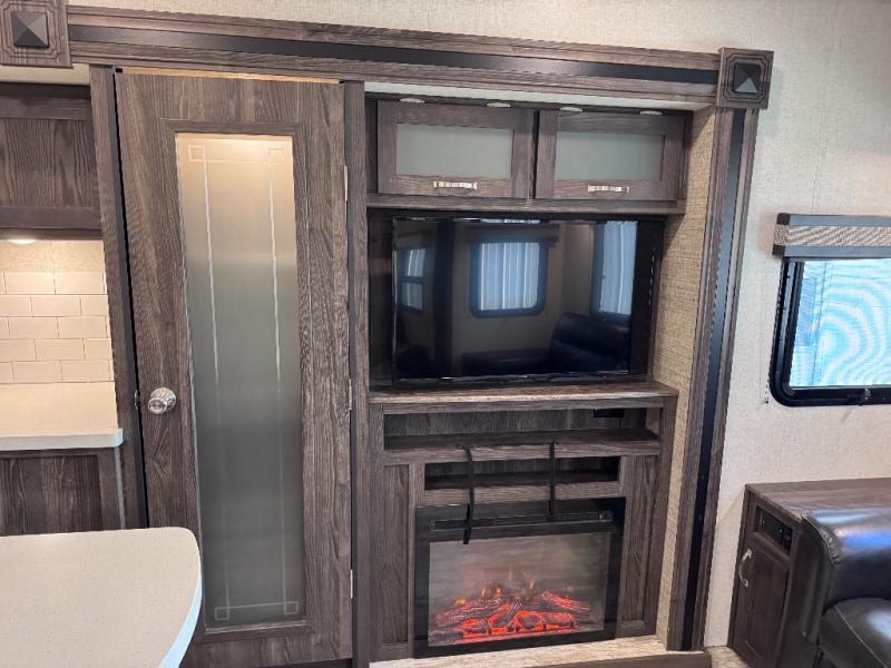 Been searching for a fifth wheel that can become your traveling office as well? You will find a middle bunk room with a desk to work from, a sofa to relax on, and a bunk offering extra sleeping space for overnight guests. When it's time to venture outside, you can cook on the exterior kitchen after going for a hike. Once you are ready for bedtime, the front bedroom will be your oasis to recharge, and the double entry bath allows you quick access at night. The main living and kitchen area is wide open with dual slides, provides the appliances you need to make meals including a center island, plus offers comfortable seating!