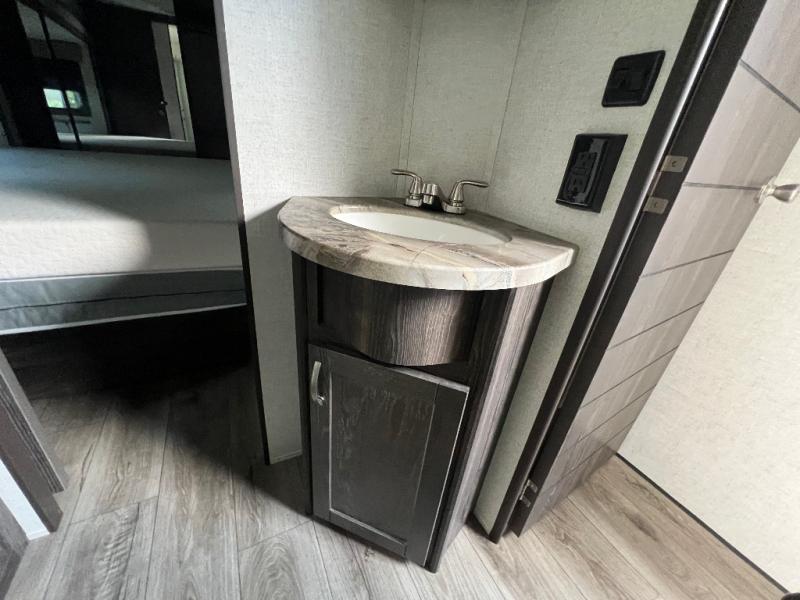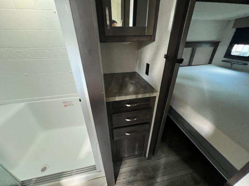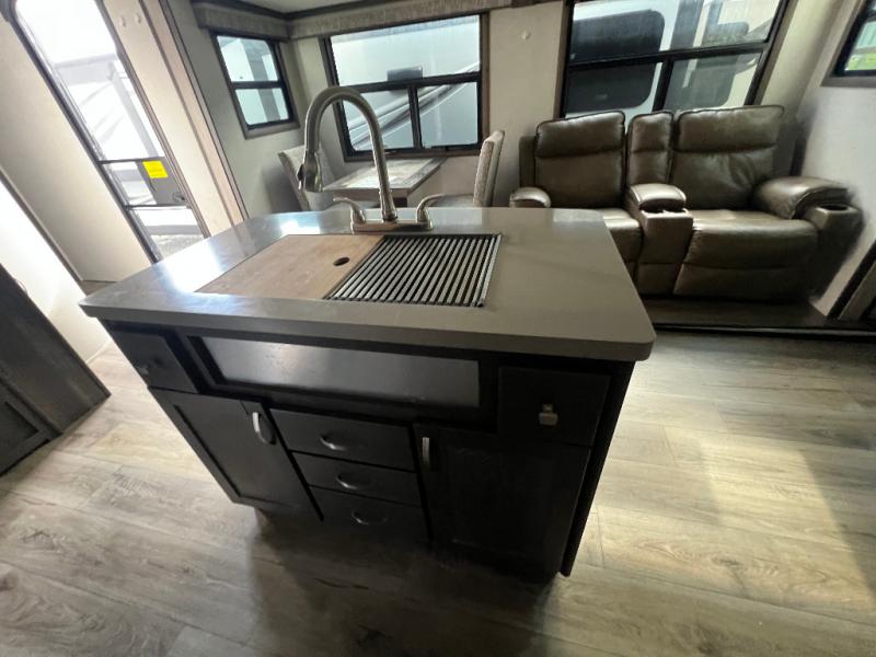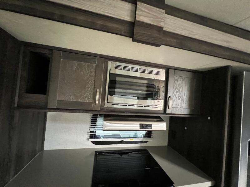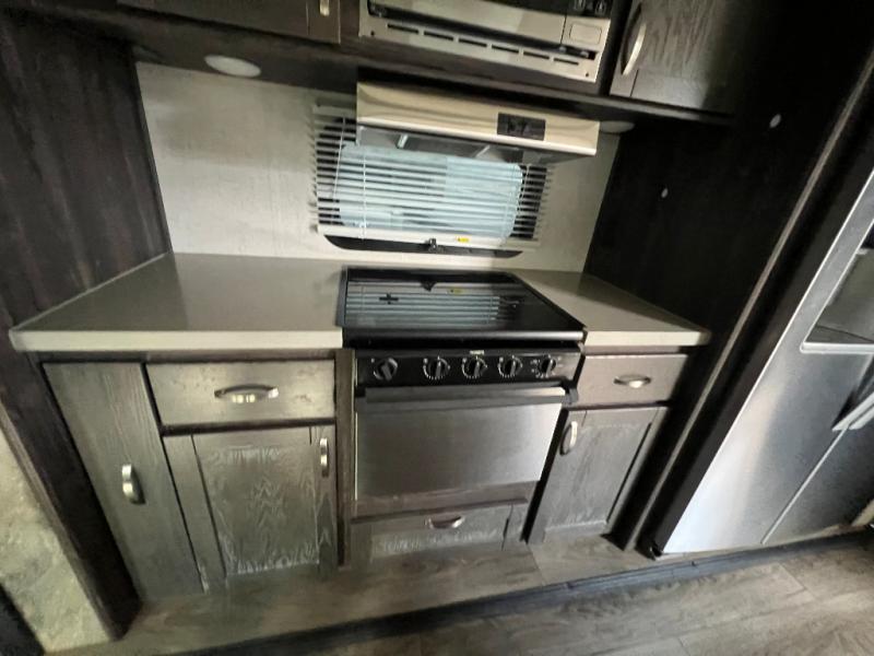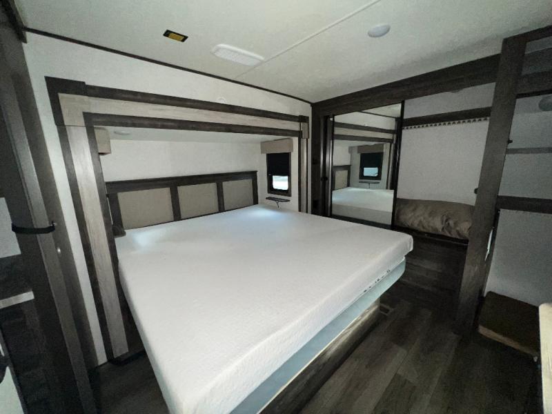 This Mesa Ridge is the perfect couple's travel trailer for several reasons. Just imagine having your own master suite with a queen bed or choose the optional king each night, and kitchen amenities to make meals whenever you like. The chef will enjoy the center island to wash dishes and prepare food, the stainless steel appliances to make meals, and the free-standing table with chairs for a place to eat and relax. The rear hide-a-bed sofa even doubles as extra sleeping space when you have overnight guests. Now imagine kayaking, fishing, or shopping before doing it all over again tomorrow in a new campground.