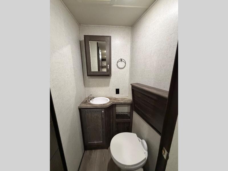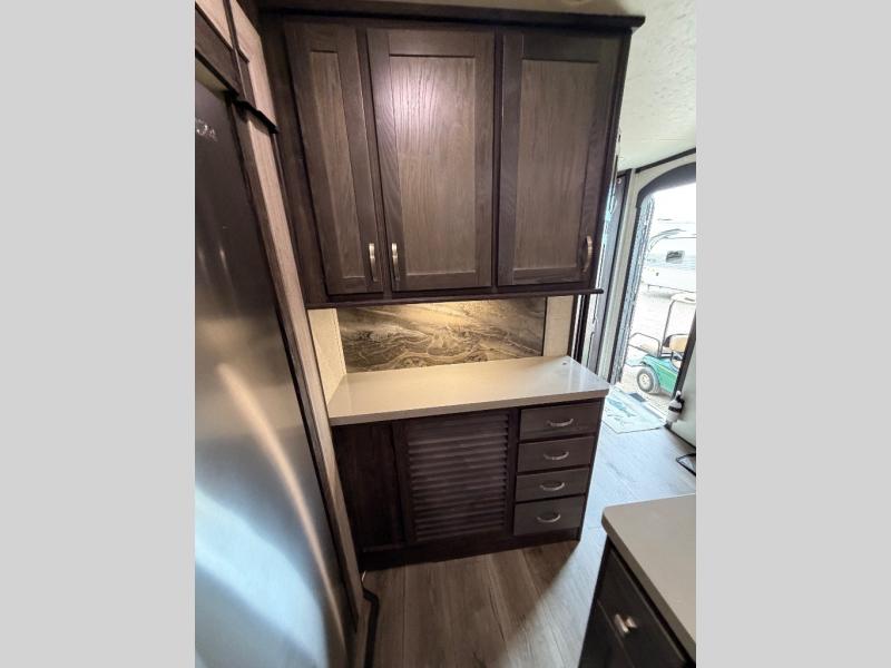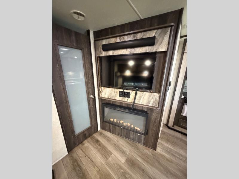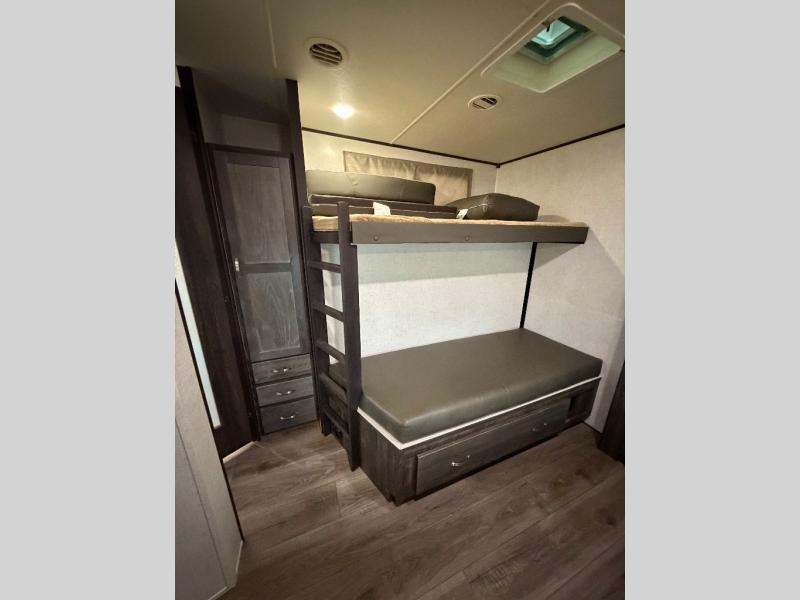Are you looking for lots of space for the whole gang? Are you wanting to have your own full bathroom away from the kids? This Mesa Ridge travel trailer checks all the boxes and offers a full and half bath to use and lots of floor space thanks to the four slides all throughout. Just imagine standing at the kitchen island and looking around at the stainless steel appliances as you make meals for everyone. The kids will surely be waiting anxiously for dinner at the free-standing table or maybe outside at the outdoor kitchen. The rear private bunkhouse suite is also amazing because it provides you with a set of double size bunks, a hinged bunk, a dinette, a hutch, and its very own half bath. You might even like to add a few options such as a king bed, a 21 cu. ft. refrigerator, and/or a U-lounge.