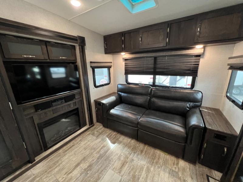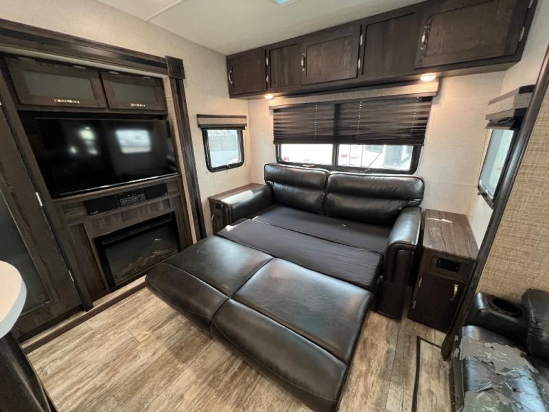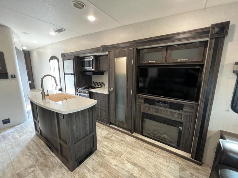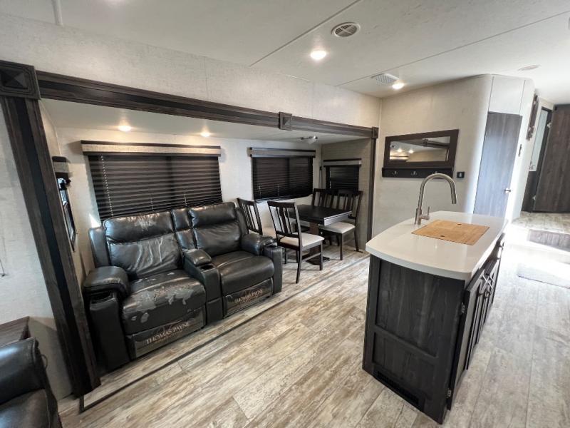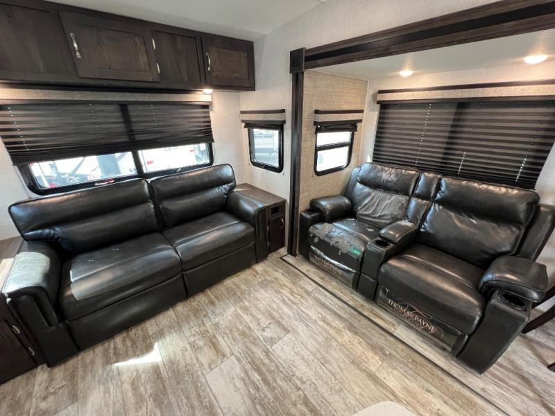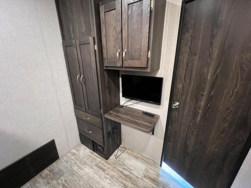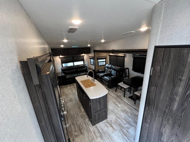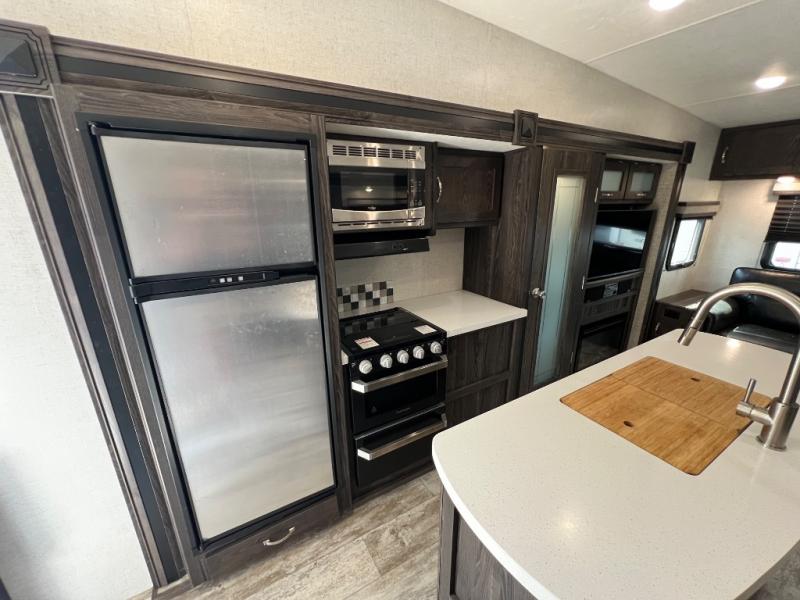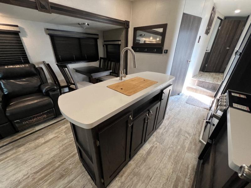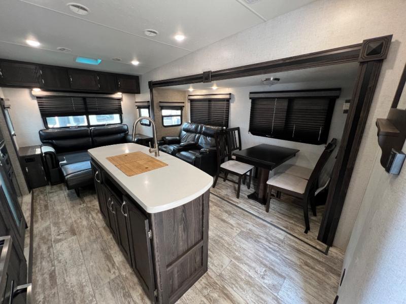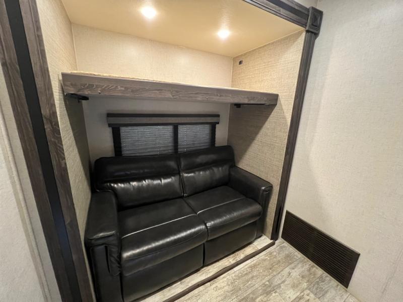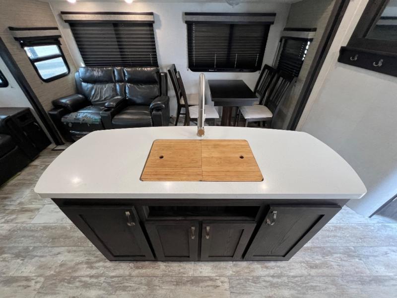 This fifth wheel will be perfect for camping with family or if you've decided to go full-time RVing! The middle bunkhouse includes a tri-sofa and a flip-up bunk that will be great for the kids and the desk allows this room to also be used as a work office if you telecommute. You'll find plenty of comfortable seating space in the rear living area on the tri-fold sofa, booth dinette, or on the theater seating. The chef of the family will love the kitchen island for extra counter space and the pull-out pet dishes will make feeding your furry friends easier than ever. Spend your evening outdoors under the 19' power awning with LED lights and the outside refrigerator can hold all the cold drinks.