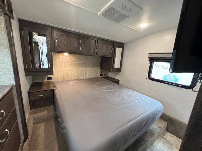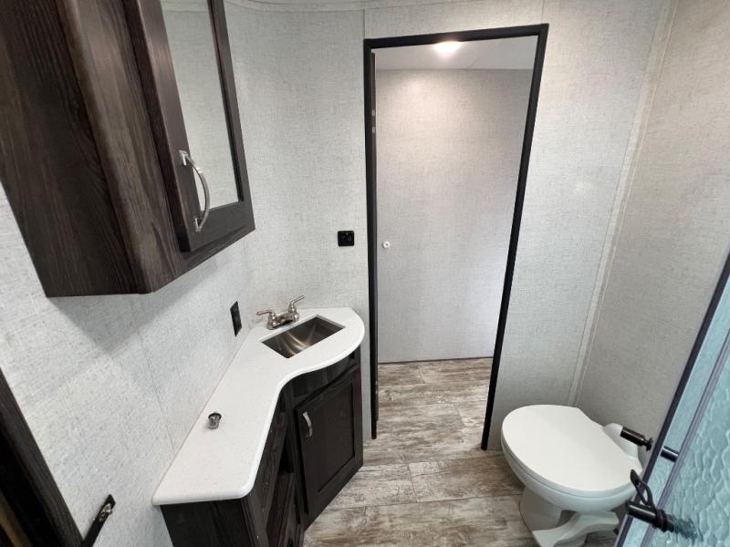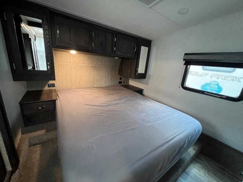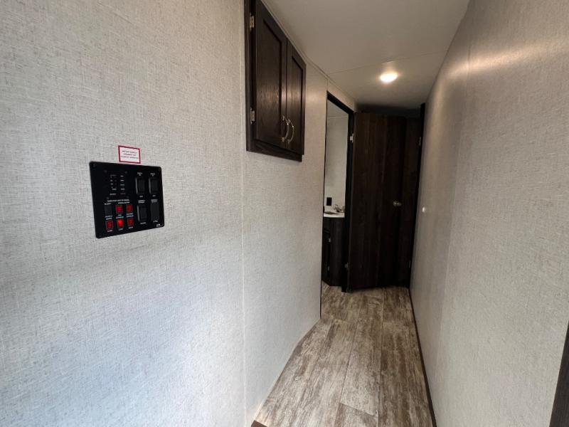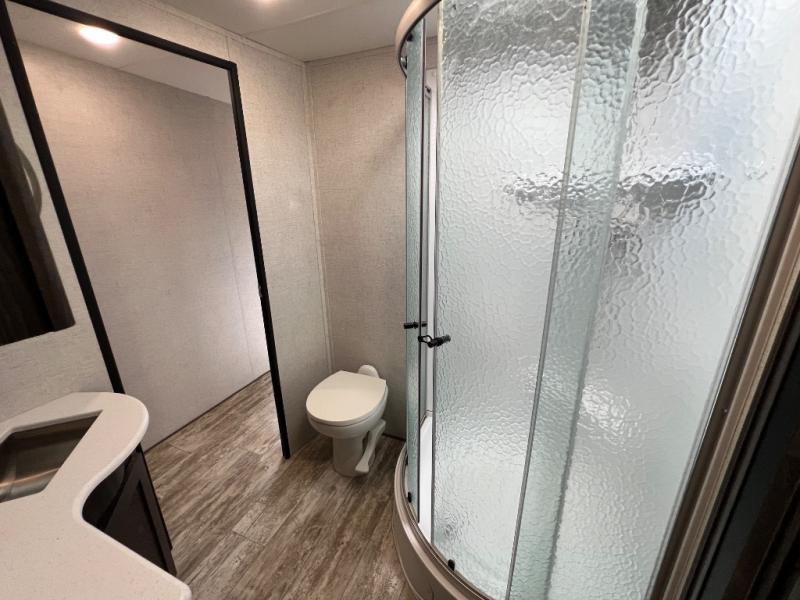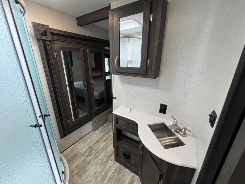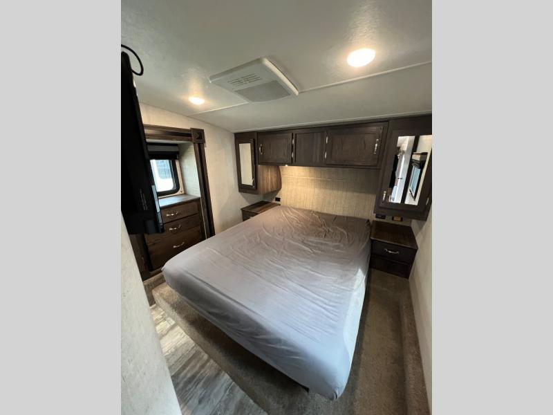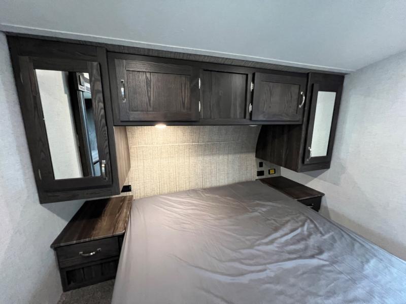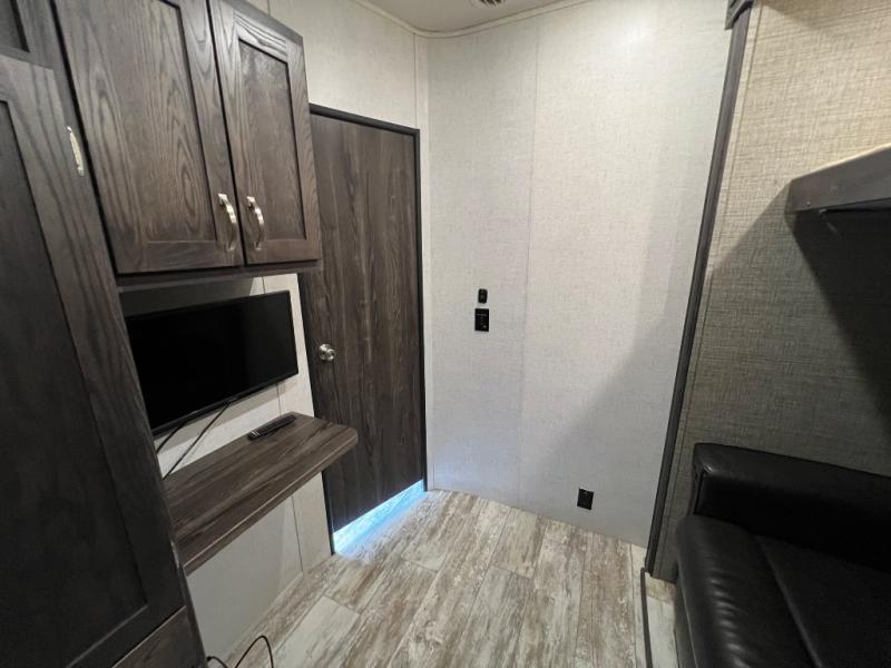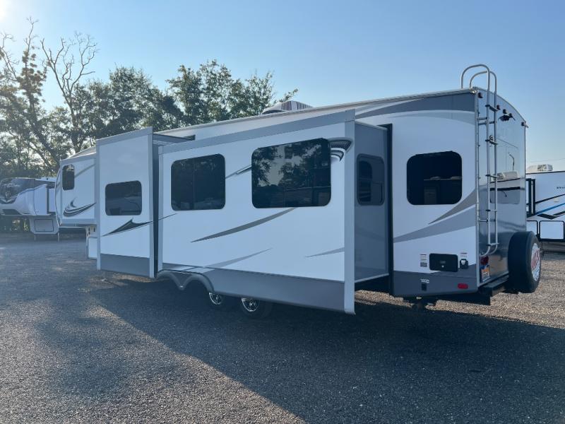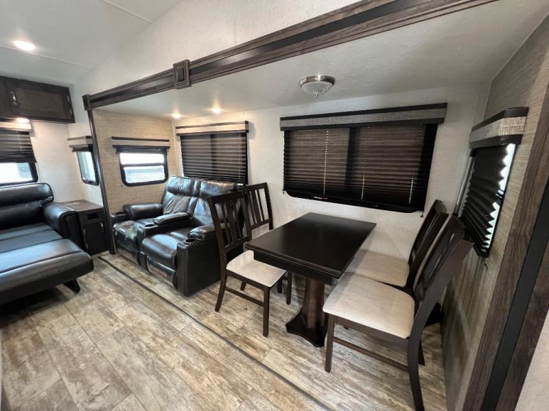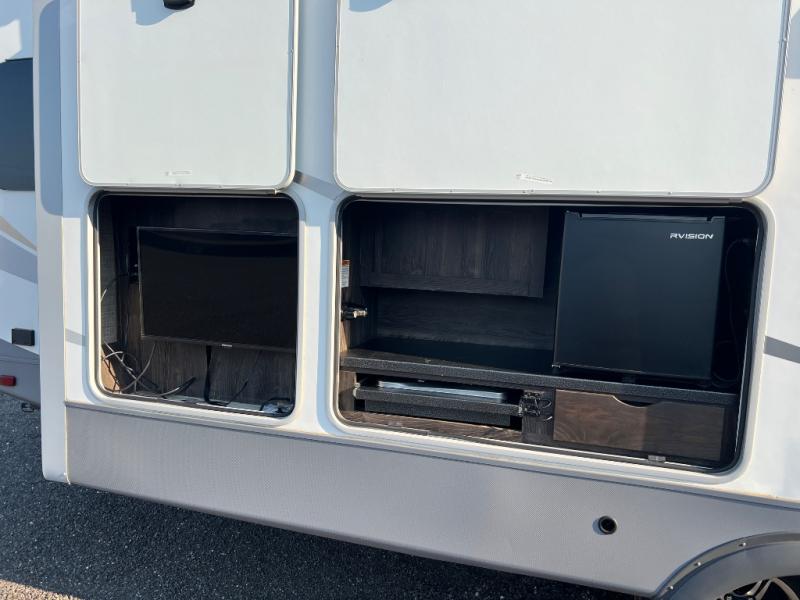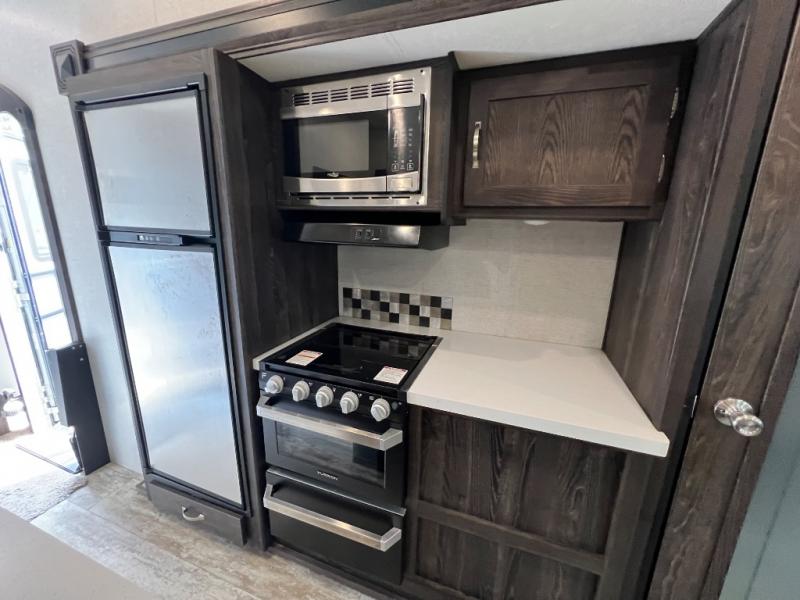This fifth wheel will be perfect for camping with family or if you've decided to go full-time RVing! The middle bunkhouse includes a tri-sofa and a flip-up bunk that will be great for the kids and the desk allows this room to also be used as a work office if you telecommute. You'll find plenty of comfortable seating space in the rear living area on the tri-fold sofa, booth dinette, or on the theater seating. The chef of the family will love the kitchen island for extra counter space and the pull-out pet dishes will make feeding your furry friends easier than ever. Spend your evening outdoors under the 19' power awning with LED lights and the outside refrigerator can hold all the cold drinks.