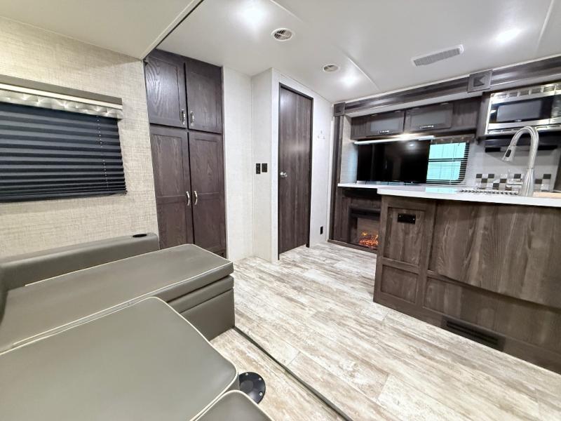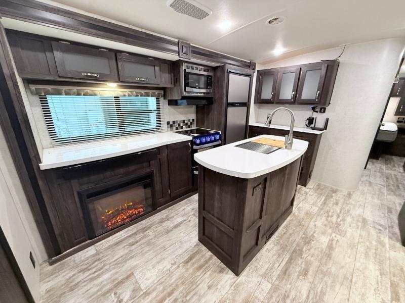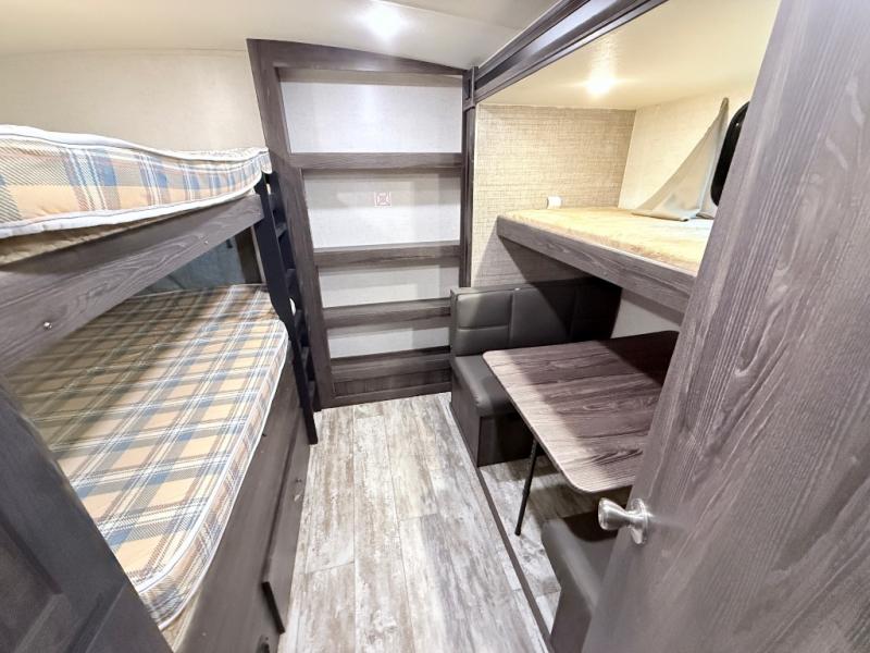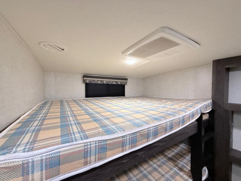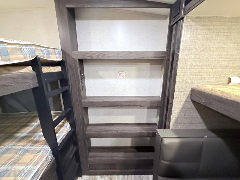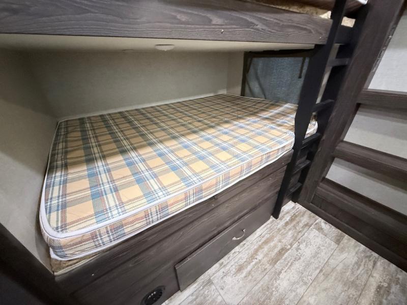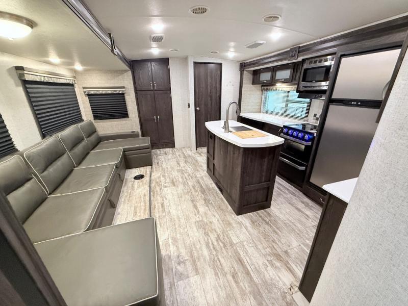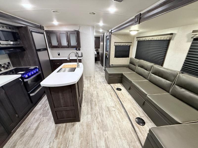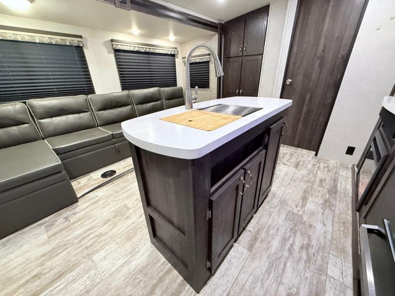 This travel trailer is the ultimate family unit since it features a rear bunkhouse for the kids and a front bedroom for mom and dad. The bunkhouse includes three bunks and a slide out for more floor space and you'll find dual opposing slides in the main living area, creating an open floor space. Spend your day outdoors and the full bath will allow you to clean up just like you do at home and the two power awnings outside will shade you as you cook dinner on the outside kitchen. There is also a three burner range indoors, a microwave oven, and a kitchen island for more counter space!