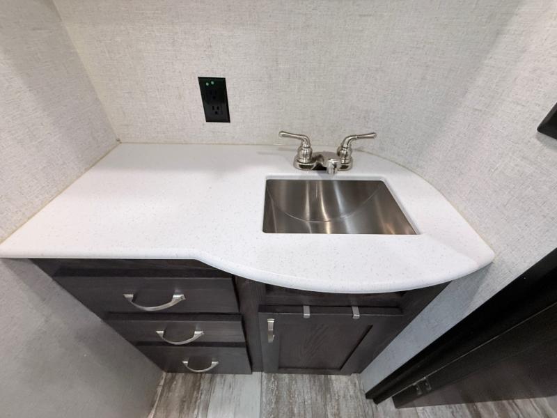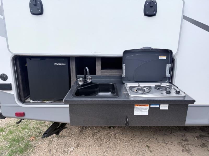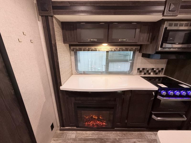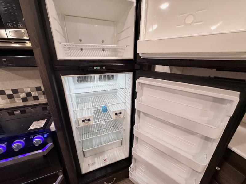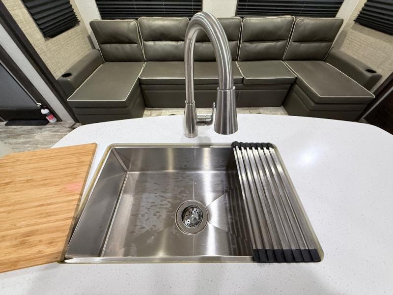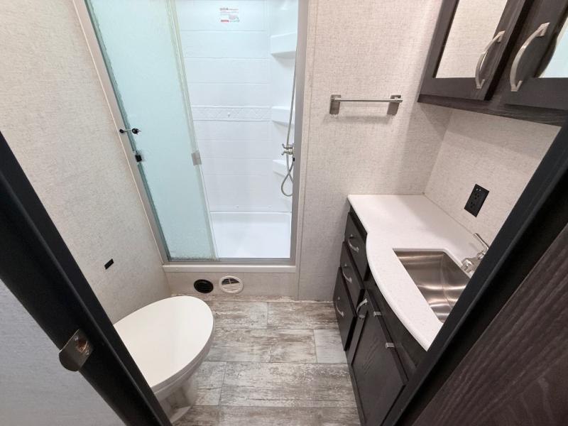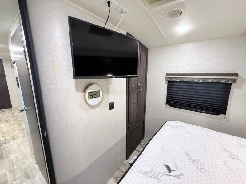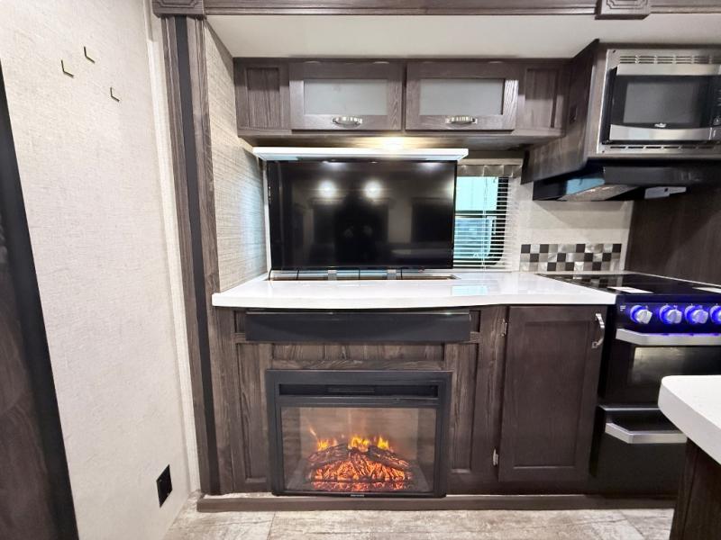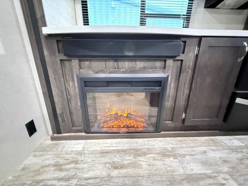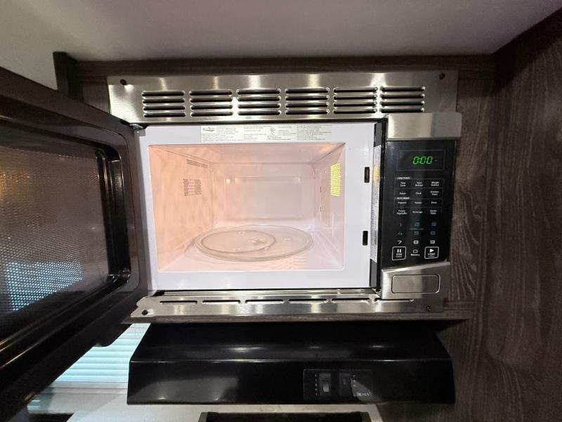 This travel trailer is the ultimate family unit since it features a rear bunkhouse for the kids and a front bedroom for mom and dad. The bunkhouse includes three bunks and a slide out for more floor space and you'll find dual opposing slides in the main living area, creating an open floor space. Spend your day outdoors and the full bath will allow you to clean up just like you do at home and the two power awnings outside will shade you as you cook dinner on the outside kitchen. There is also a three burner range indoors, a microwave oven, and a kitchen island for more counter space!