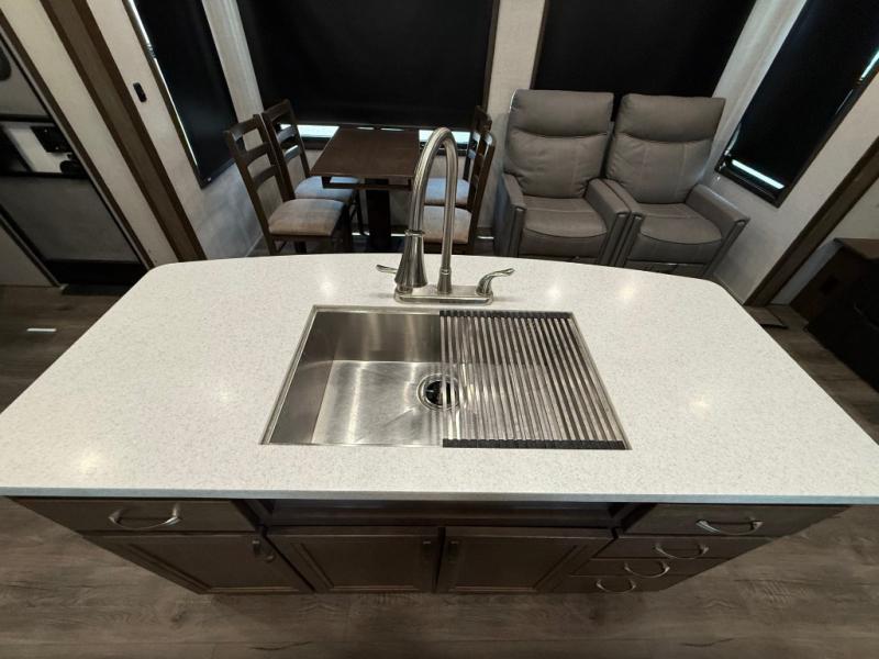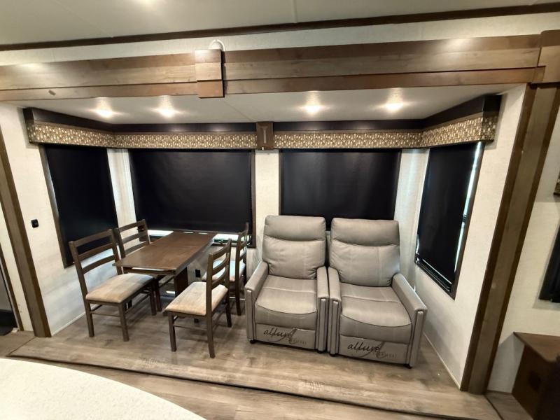 Imagine looking out the windows to see new scenery each time you decide to load up and head out in this fifth wheel. You can dine or work at the free standing dinette while watching the 50" TV, stay warm by the fireplace, and visit with the cook. The cook will love the storage in the large pantry and the counter space on the kitchen island. You can entertain other RVers with plenty of space to move around with dual slide outs in the main area, plus seating for nine. When everyone leaves, you can take turns getting ready for bed in the full bathroom, and master bedroom gives you privacy as well. You will love the walk-in closet, and the washer and dryer option, plus the comfortable queen bed. Come see what else makes this the perfect RV to stay awhile.