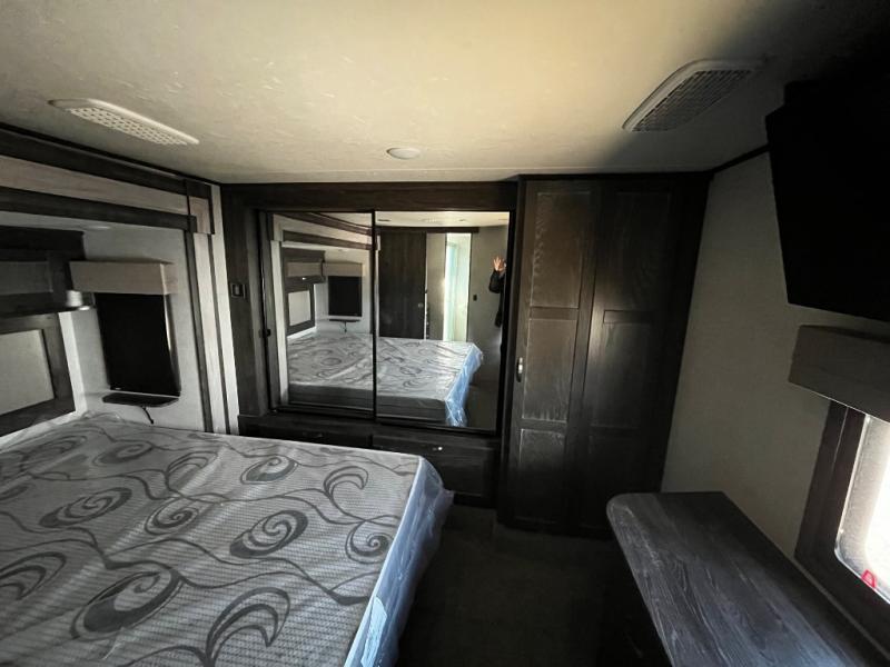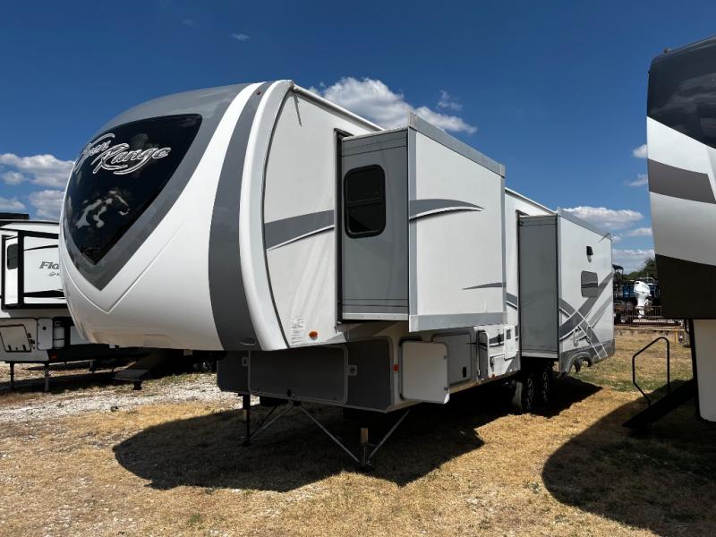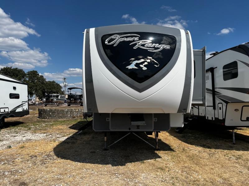 With each Highland Ridge RV Open Range fifth wheel you will enjoy an automatic leveling system, JT Strong Arm stabilizers, a laminated block foam floor, and more standard features on a 100" wide body frame. The ACCU-SLIDE Slide system, which is sealed in all positions to help reduce water leaks and wind drafts, allows you to use the slide even if it can not be fully extended depending on your campsite. The interior offers hardwood cabinet doors, LED lighting and a built-in Pet Bed, and more depending on the model you choose. And there are optional packages and several options to enhance your fifth wheel, take a look to see if you might like to add them!