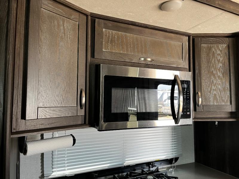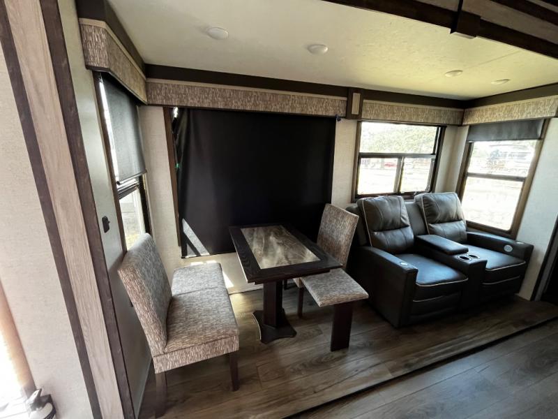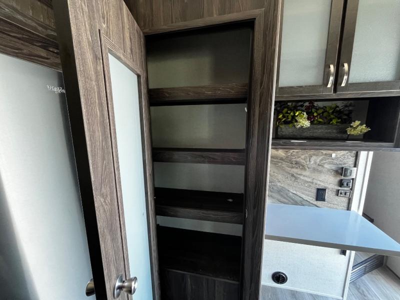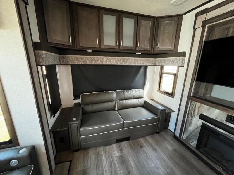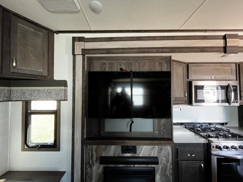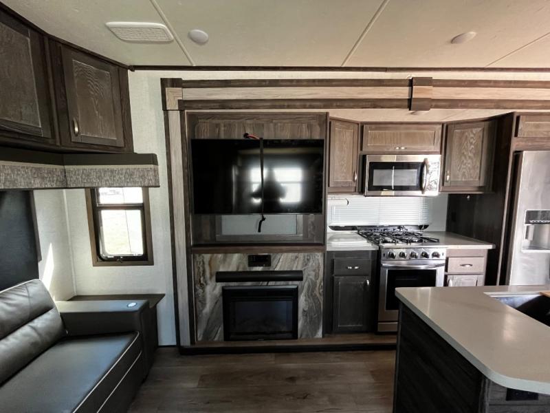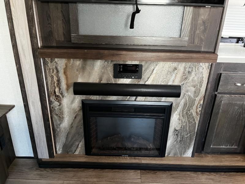 Imagine looking out the windows to see new scenery each time you decide to load up and head out in this fifth wheel. You can dine or work at the free standing dinette while watching the 50" TV, stay warm by the fireplace, and visit with the cook. The cook will love the storage in the large pantry and the counter space on the kitchen island. You can entertain other RVers with plenty of space to move around with dual slide outs in the main area, plus seating for nine. When everyone leaves, you can take turns getting ready for bed in the full bathroom, and master bedroom gives you privacy as well. You will love the walk-in closet, and the washer and dryer option, plus the comfortable queen bed. Come see what else makes this the perfect RV to stay awhile.