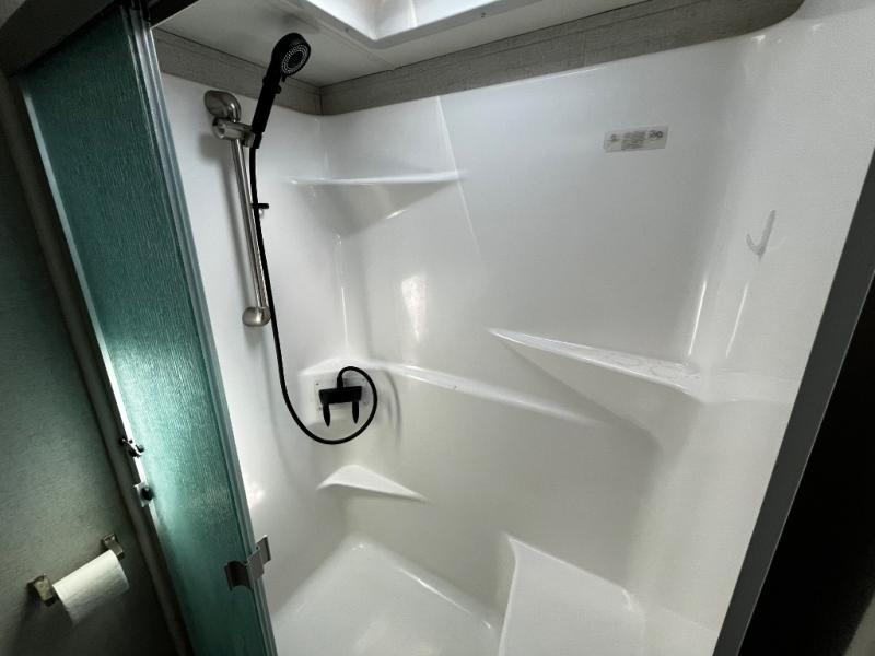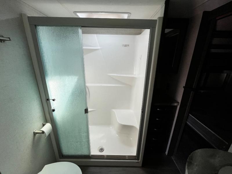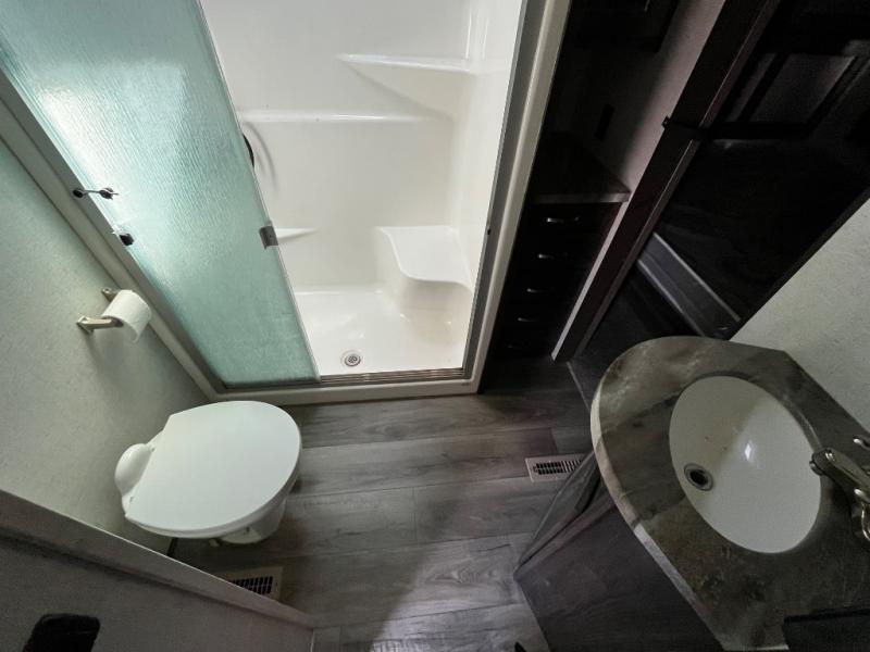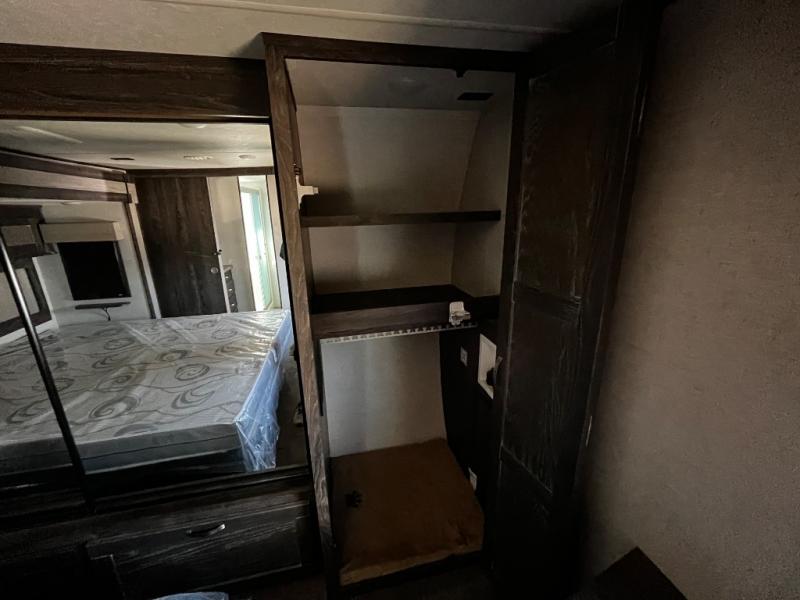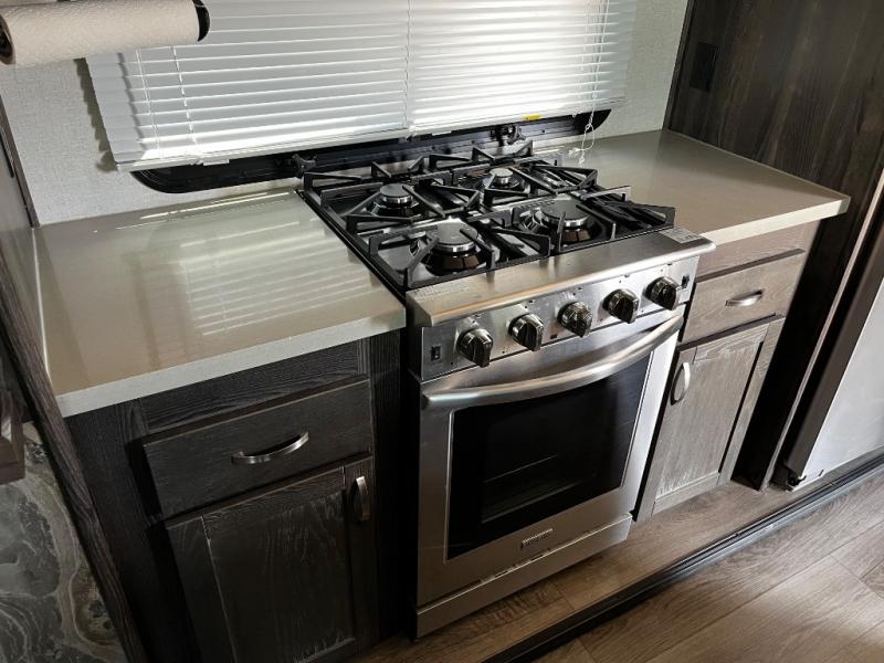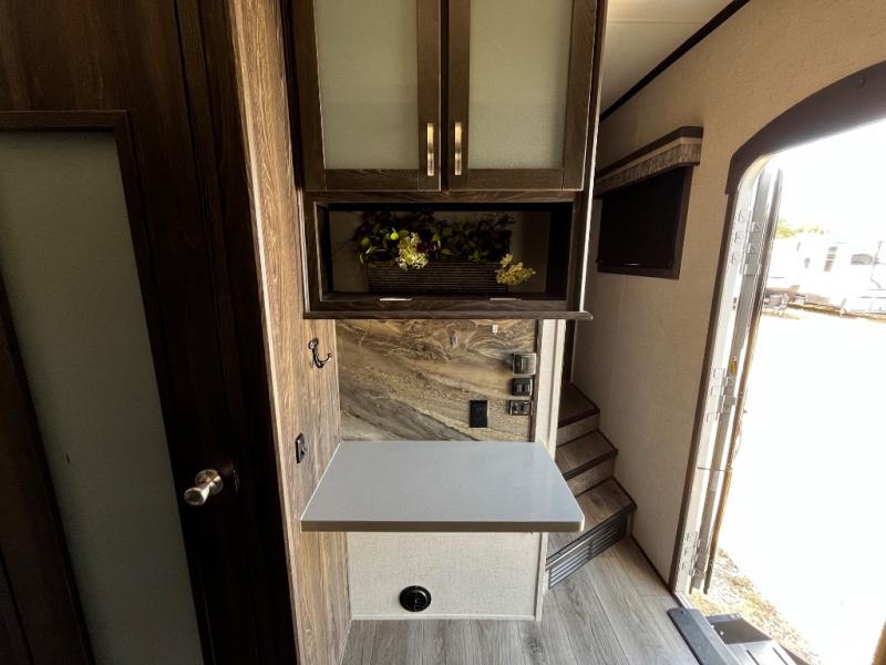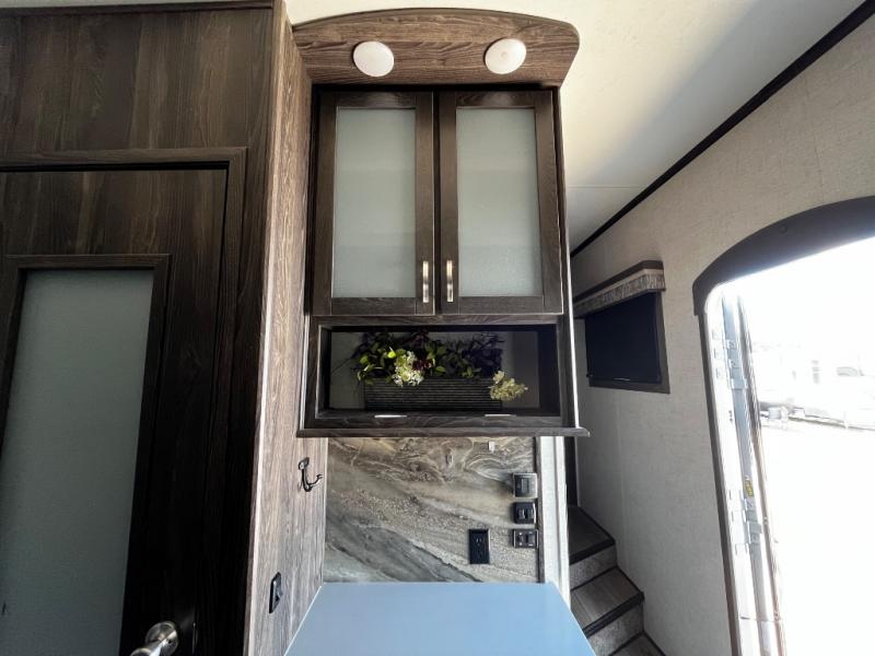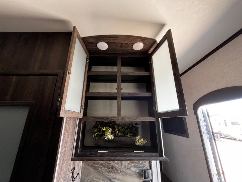 Imagine looking out the windows to see new scenery each time you decide to load up and head out in this fifth wheel. You can dine or work at the free standing dinette while watching the 50" TV, stay warm by the fireplace, and visit with the cook. The cook will love the storage in the large pantry and the counter space on the kitchen island. You can entertain other RVers with plenty of space to move around with dual slide outs in the main area, plus seating for nine. When everyone leaves, you can take turns getting ready for bed in the full bathroom, and master bedroom gives you privacy as well. You will love the walk-in closet, and the washer and dryer option, plus the comfortable queen bed. Come see what else makes this the perfect RV to stay awhile.