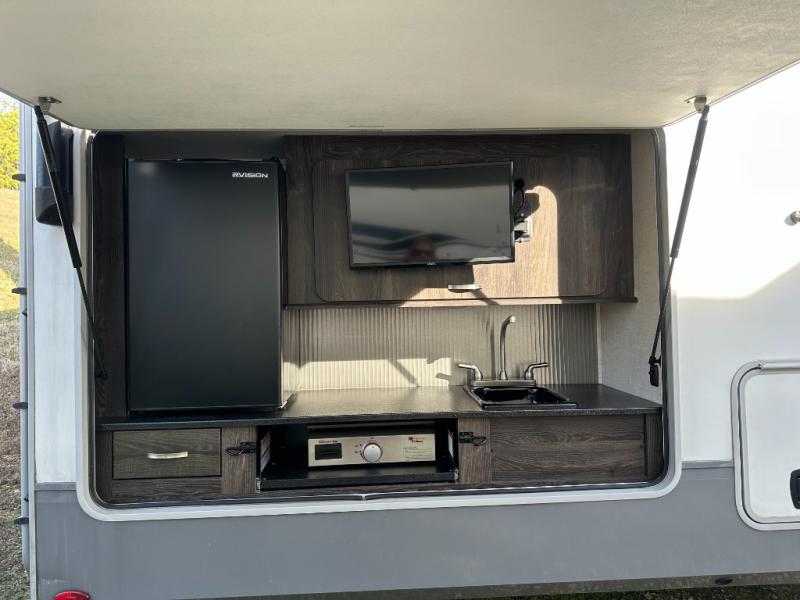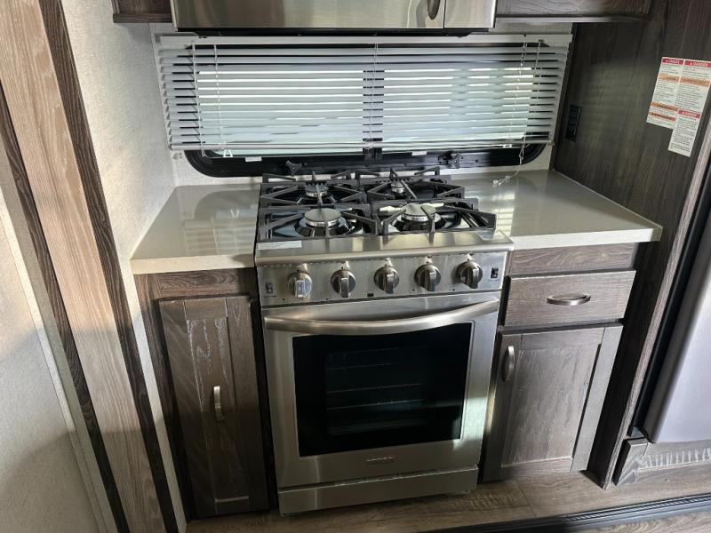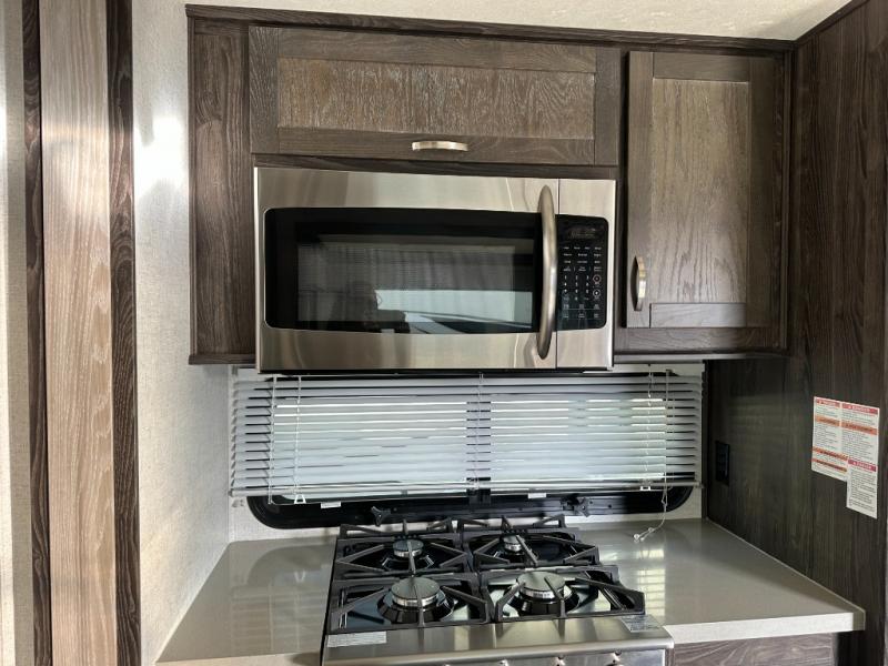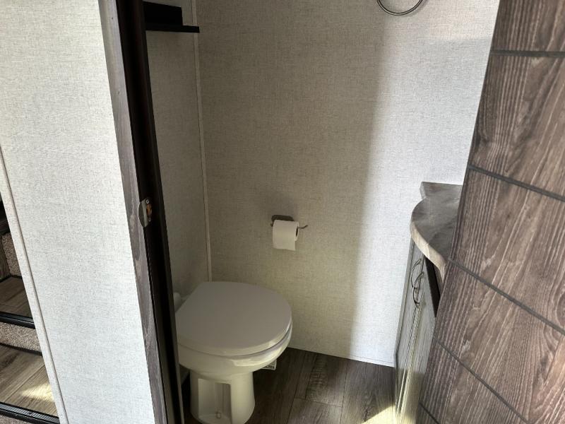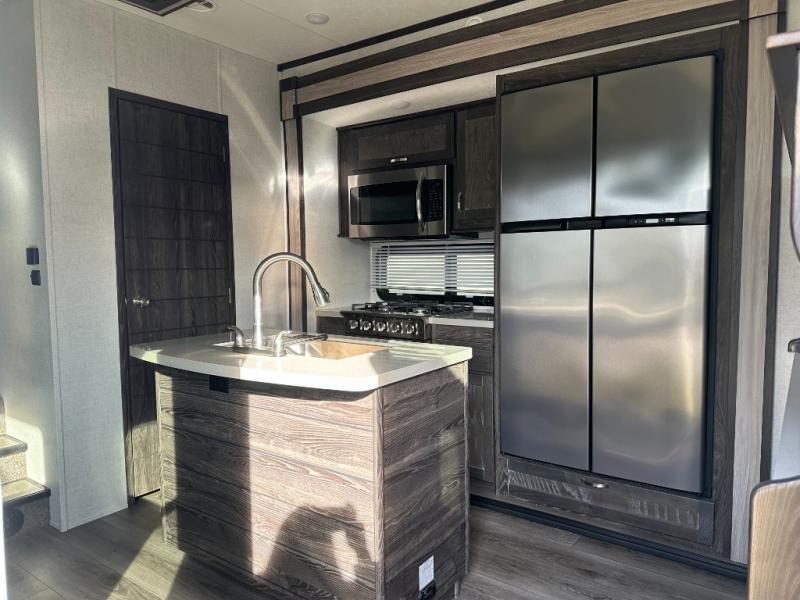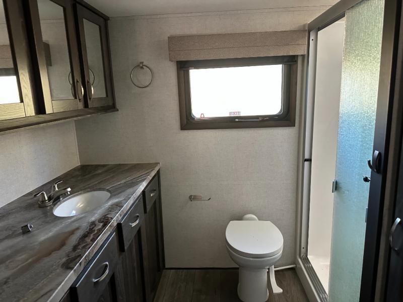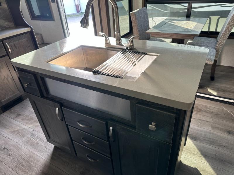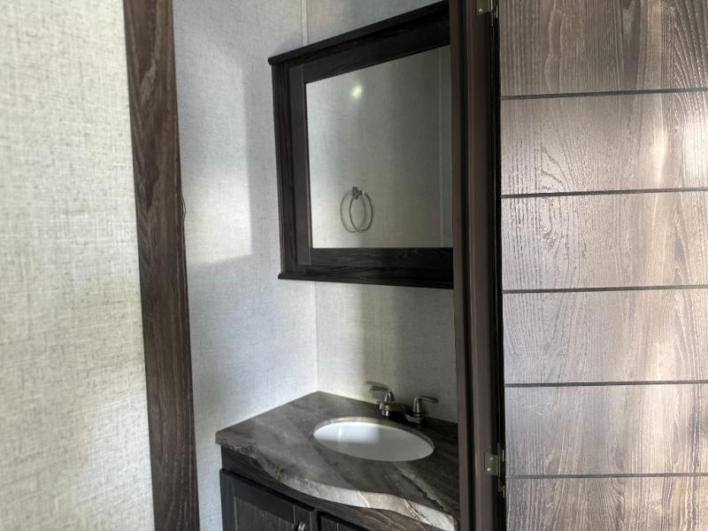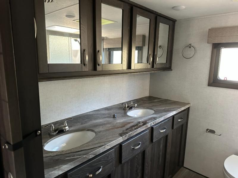 Just imagine how happy your spouse will be with their own sink in the rear full bathroom separate from the half bath that is off of the kitchen. You will also have plenty of counter space to place both of your toiletries away from each others, including lots of cabinets to store your linens and such. You will love the front living area with a full wall entertainment center and a fireplace, plus dual tri-fold sofas and a pub chair to watch the big game. The centrally located separate kitchen area offers an island to prepare meals and wash dishes, and the free standing dinette allows you to enjoy a meal together before heading out the entry to relax under the two awnings in the great outdoors!
