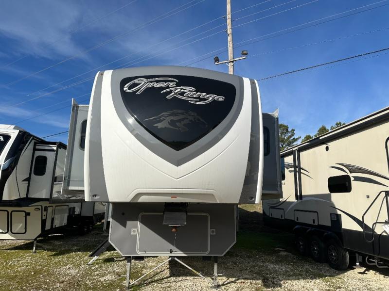 With each Highland Ridge RV Open Range fifth wheel you will enjoy an automatic leveling system, JT Strong Arm stabilizers, a laminated block foam floor, and more standard features on a 100" wide body frame. The ACCU-SLIDE Slide system, which is sealed in all positions to help reduce water leaks and wind drafts, allows you to use the slide even if it can not be fully extended depending on your campsite. The interior offers hardwood cabinet doors, LED lighting and a built-in Pet Bed, and more depending on the model you choose. And there are optional packages and several options to enhance your fifth wheel, take a look to see if you might like to add them!