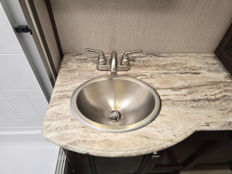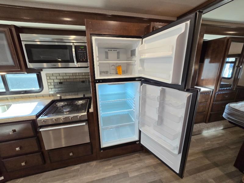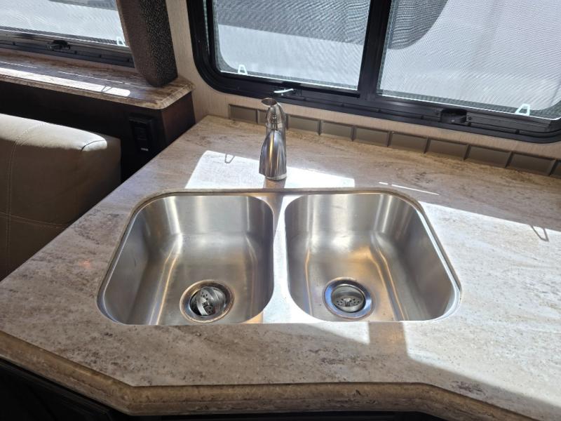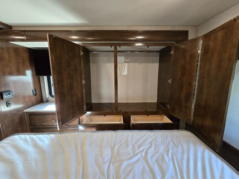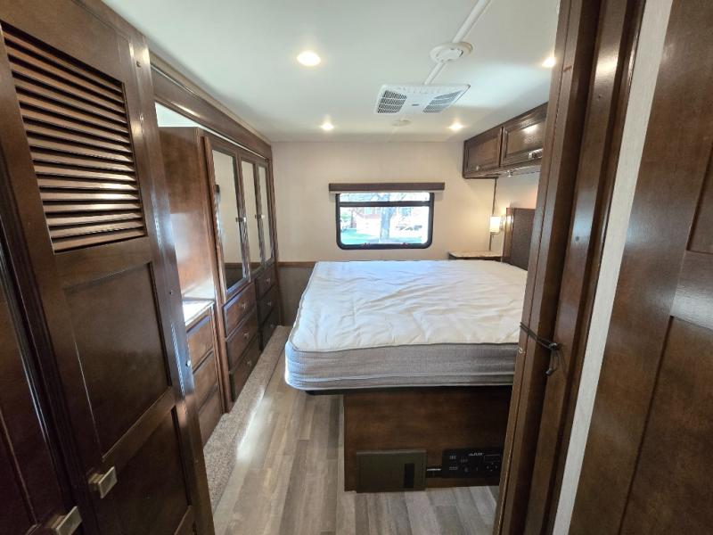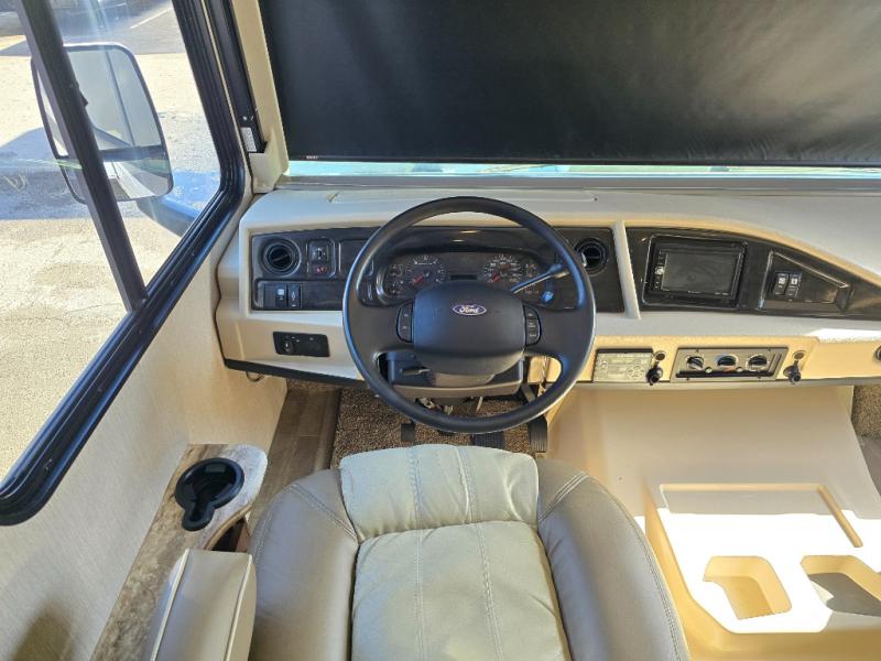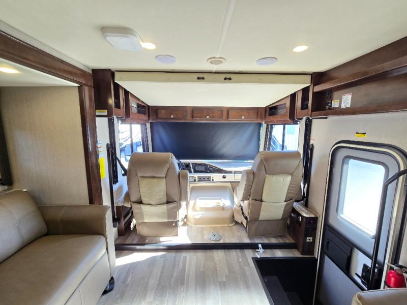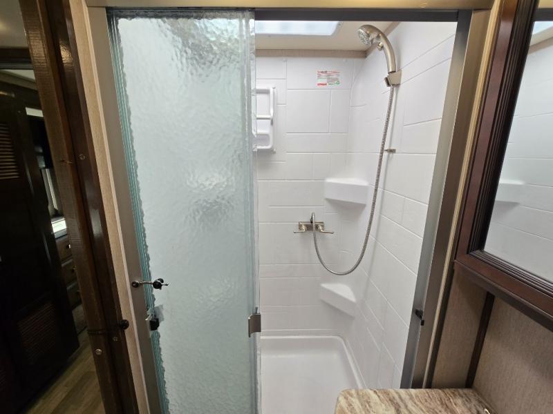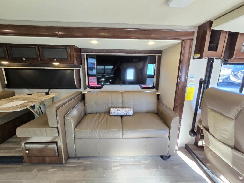 Whether you travel near or far, you'll never be without comfort and convenience when you choose this motorhome. You'll enjoy full kitchen and bath amenities, including a shower skylight that provides more standing space and a residential refrigerator for all your food. After a day outdoors, relax on the theater seating or enjoy a good book on the jack-knife sofa and the 70" booth dinette will be a perfect place for a game of Monopoly at night. This model features a full-wall slide that opens up the whole unit and the rear bedroom with a king bed will feel just like home. There is even a 32" LED TV in the bedroom to watch your favorite shows at night.