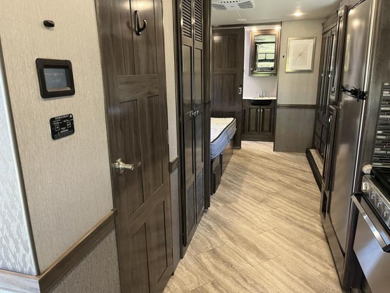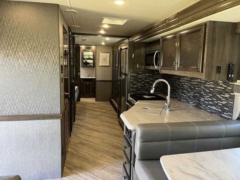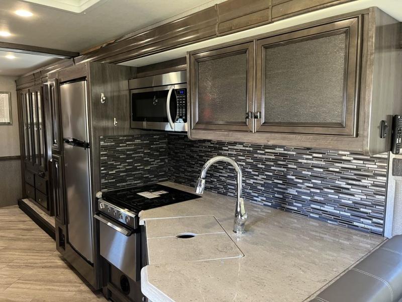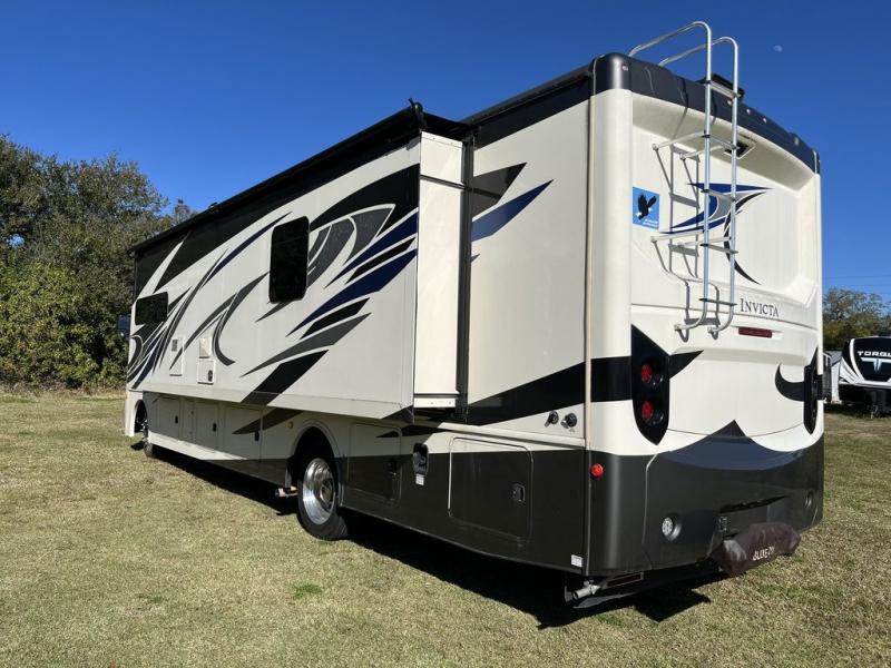 Achieve the very best adventures with this Invicta Class A gas motorhome! This luxurious coach will wow you from the moment you step foot inside and see the feature wall with accent wall covering, the vinyl tile flooring, the raised panel solid wood cabinets, and the energy-efficient flush-mount ceiling and under-cabinet reading lights. All of these features set the stage for the rest of the extravagant features, like a rear master suite with a king-size bed, full bathroom, and 32" LED TV and an additional half bath in the main living area. The residential refrigerator will be super helpful for stocking up on ingredients before leaving home, and the pantry will be able to hold any non-perishable items.
