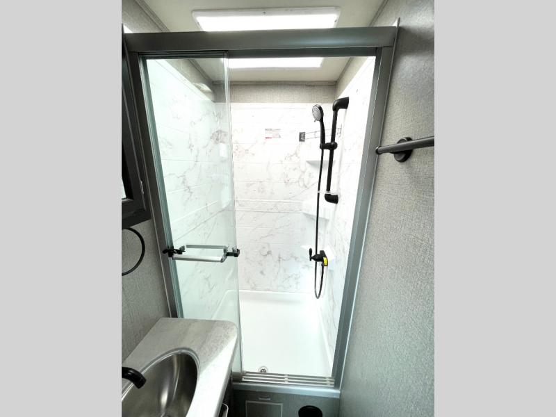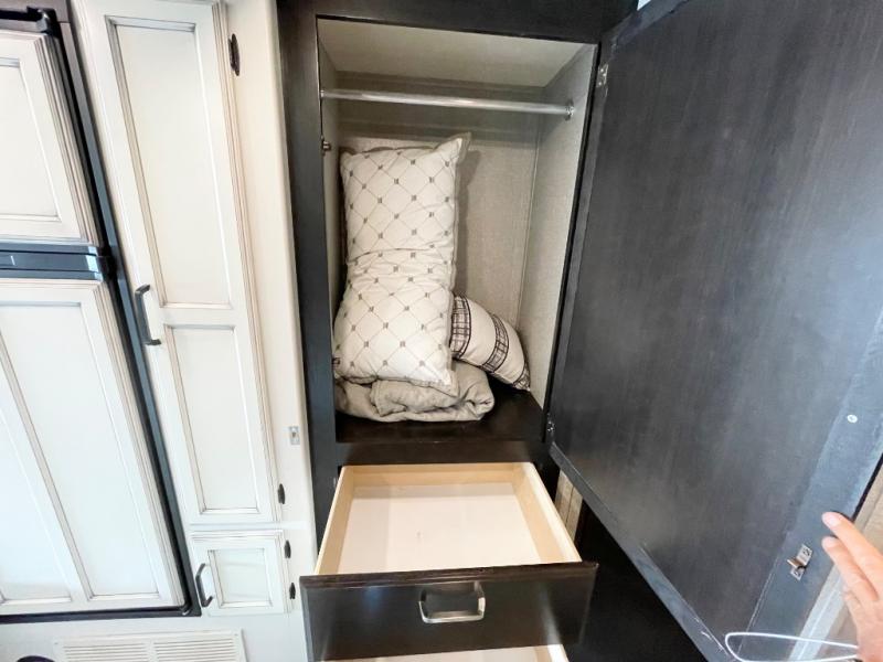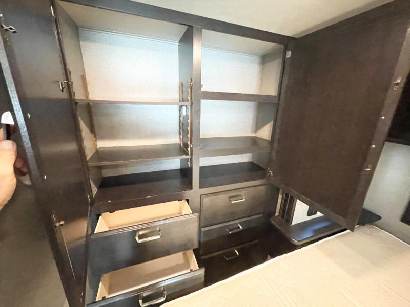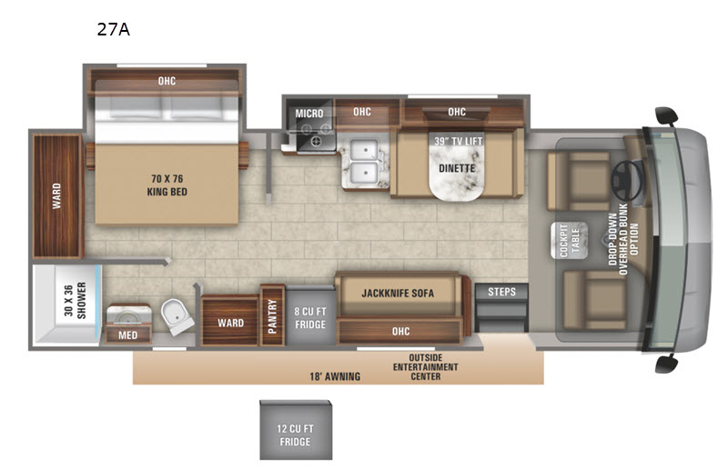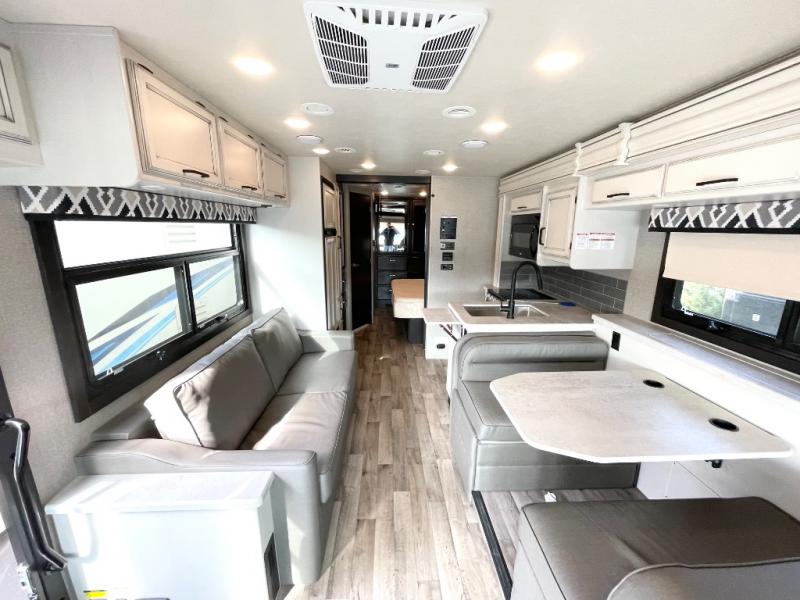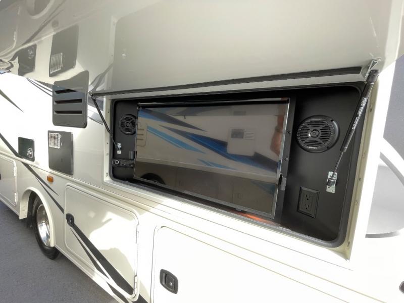 Set your sights on this motorhome that includes two slides for more space and a rear corner bath for added privacy. Each day you can prepare meals on the three burner cooktop and leftovers can go in the 8 cu. ft. refrigerator. You also have the choice here to upgrade to a 12 cu. ft. fridge for more storing space. Play a game of cards with the kids at the booth dinette or relax on the jack-knife sofa and watch a movie on the 39" TV. In the evening, the kids can convert the furniture for sleeping space and mom and dad will enjoy the rear corner bedroom with a king bed and a large wardrobe for all their clothes. This model also includes an outside entertainment center and an 18' electric awning with LED lights for an outdoor living space.