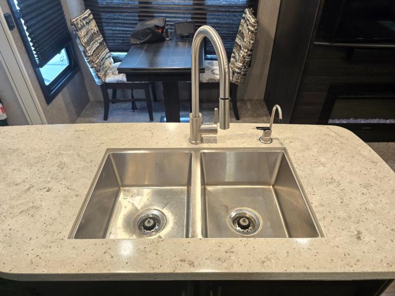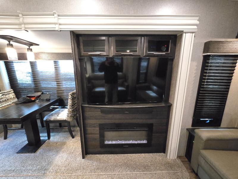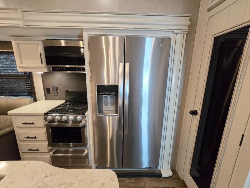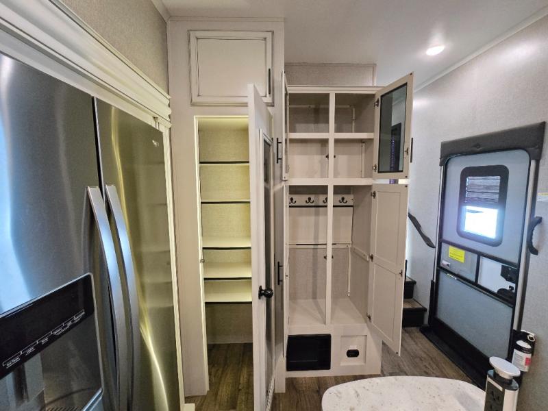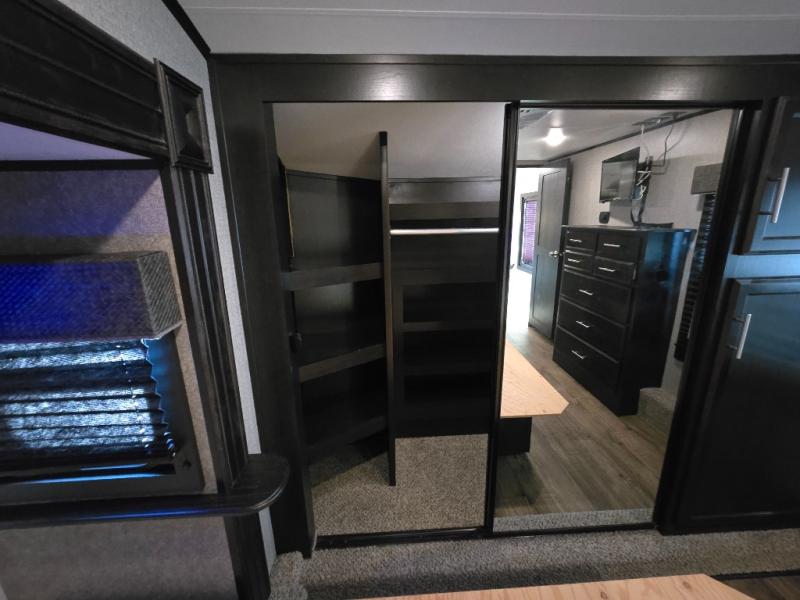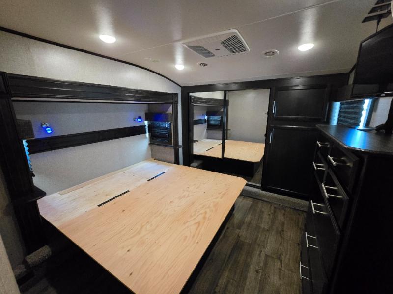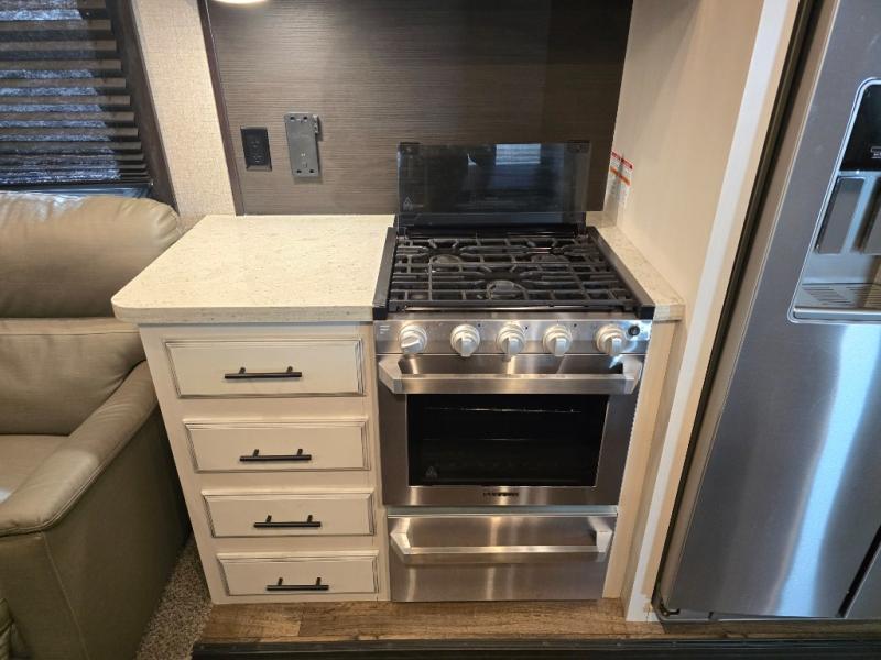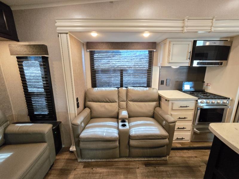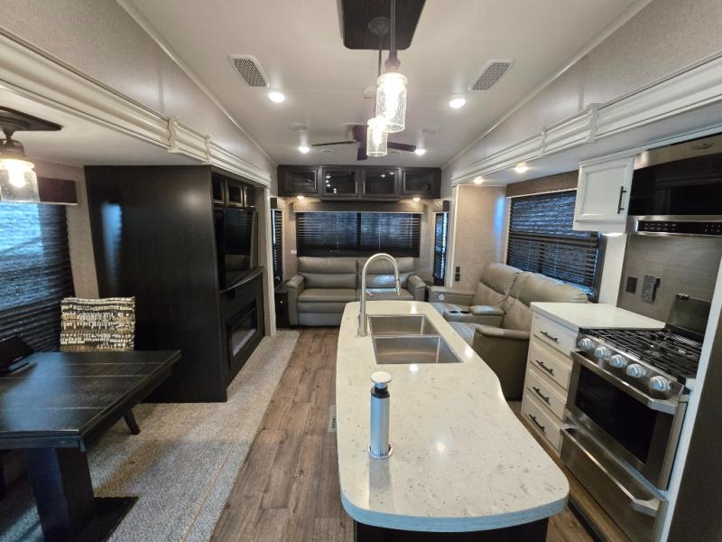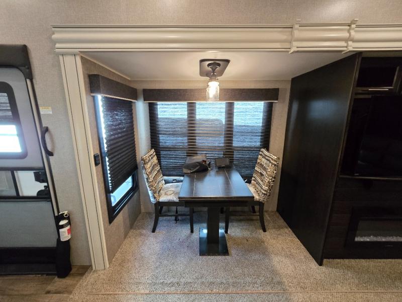 Take in the beautiful surroundings through the garden windows as you sit back on the tri-fold sofa in this Eagle fifth wheel! The free-standing table with chairs will be a great spot to sit down with a plate of spaghetti at dinnertime, and afterwards you can grab a dessert from the walk-in pantry. Opposing slides keep the main living area open and spacious so that you can enjoy time spent together, and the ceiling fan creates a cool breeze when you get too hot while cooking dinner.