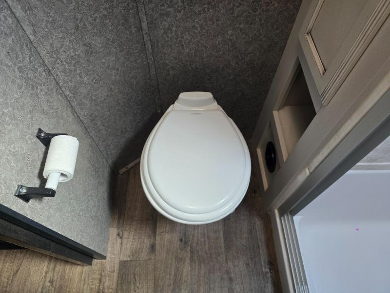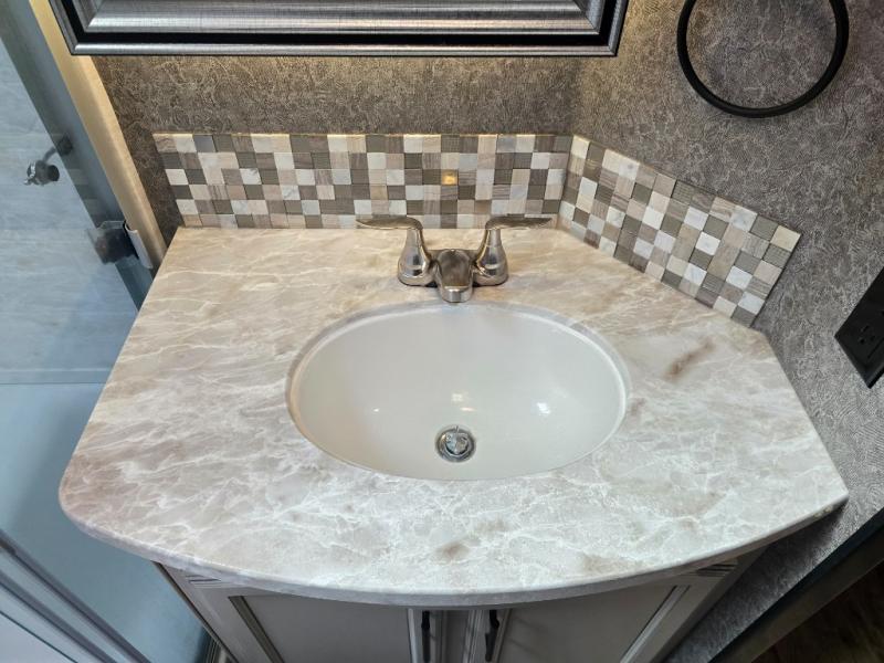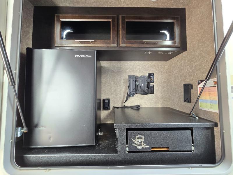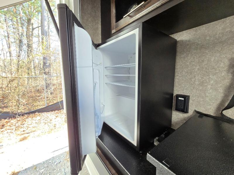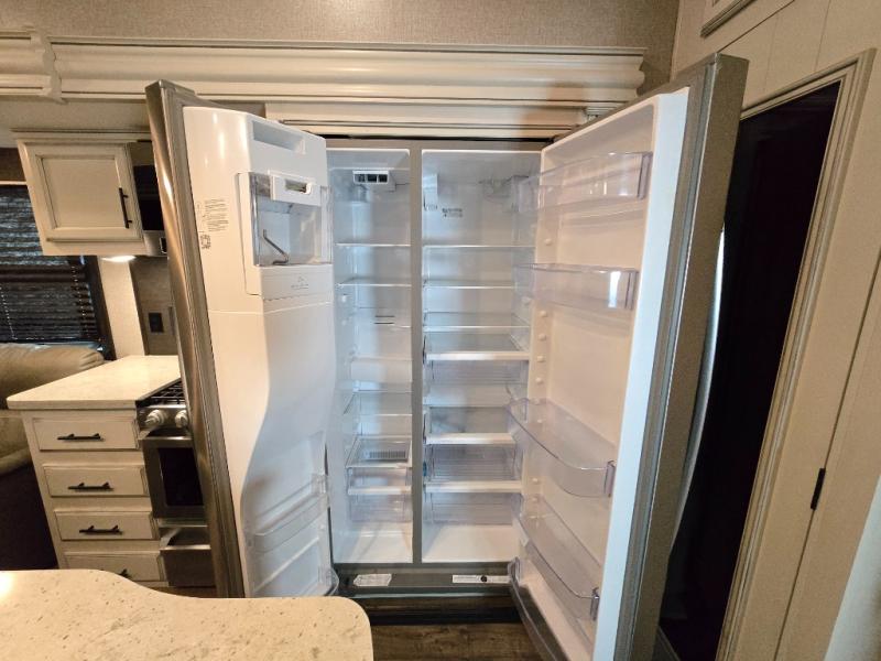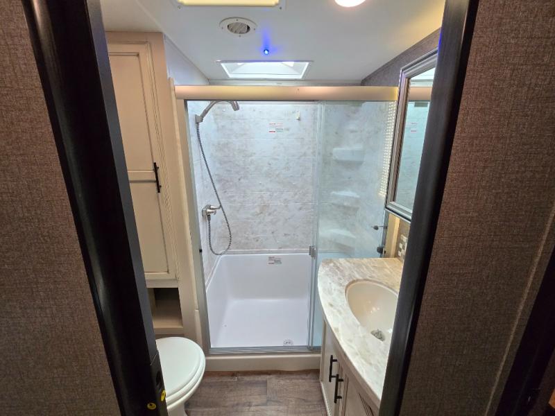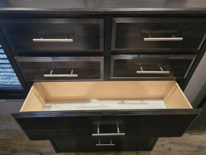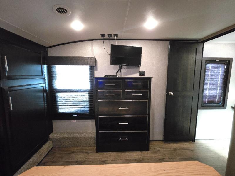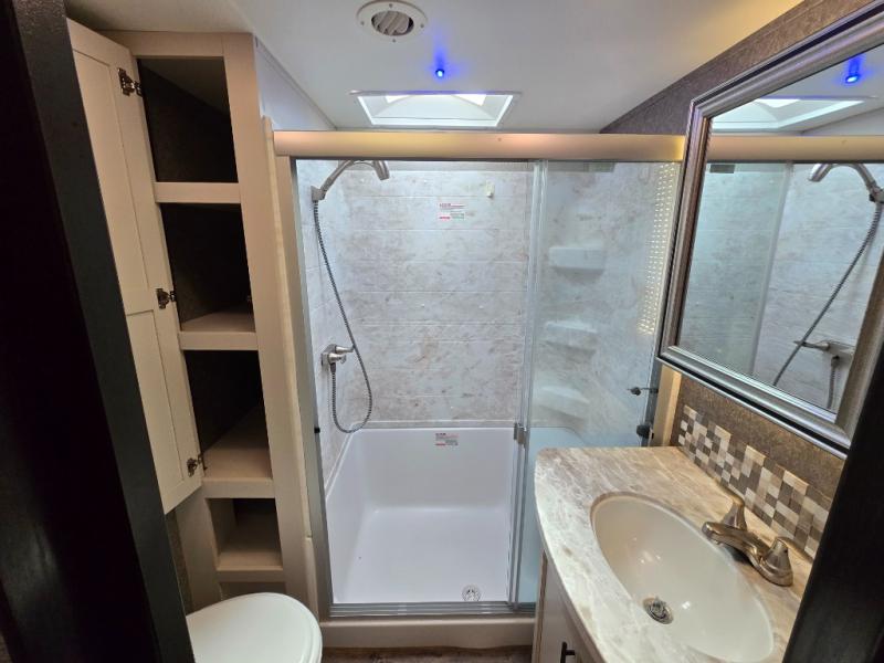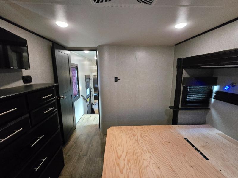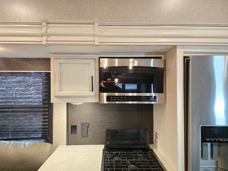 Take in the beautiful surroundings through the garden windows as you sit back on the tri-fold sofa in this Eagle fifth wheel! The free-standing table with chairs will be a great spot to sit down with a plate of spaghetti at dinnertime, and afterwards you can grab a dessert from the walk-in pantry. Opposing slides keep the main living area open and spacious so that you can enjoy time spent together, and the ceiling fan creates a cool breeze when you get too hot while cooking dinner.