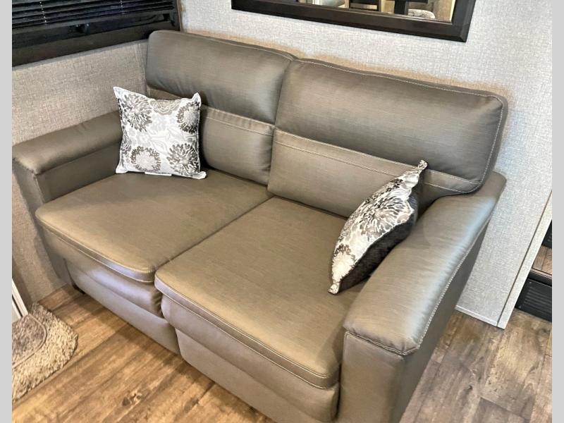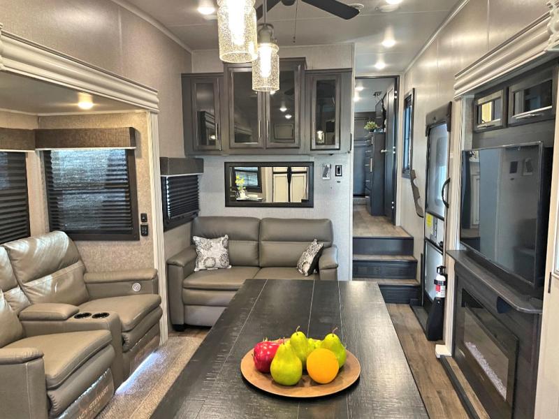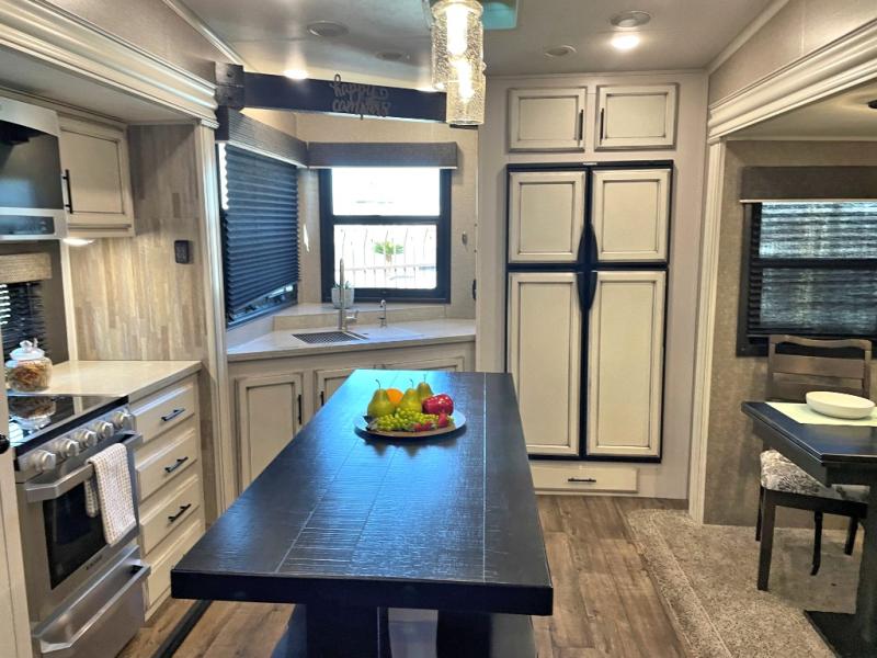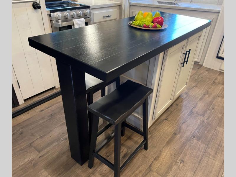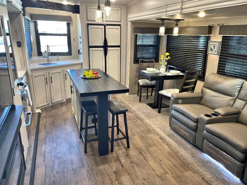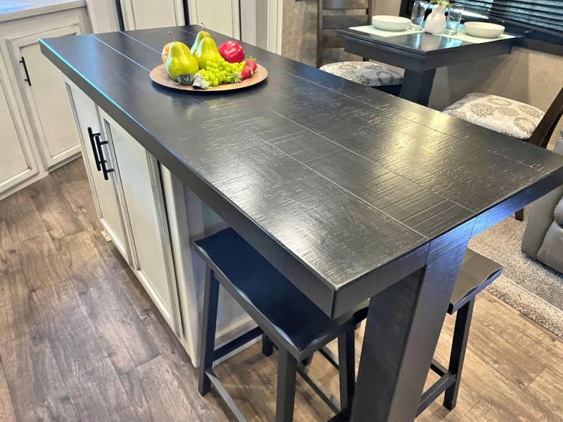 The huge island with bar stools creates a stylish focal point for this Eagle fifth wheel! Not only can you gather around the island in the bar stools, but you can also sit back in one of the two recliners, at the free-standing table with chairs, or on the hide-a-bed sofa while you chat with the cook. And the cook will appreciate having extra space from the opposing slides to move around and grab ingredients from the 13.5 cubic foot refrigerator. Plus, you'll also find a private bedroom up front so that you can retire in comfort once the day has ended.