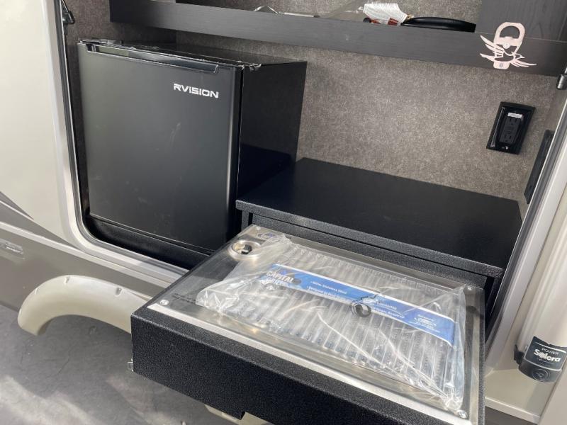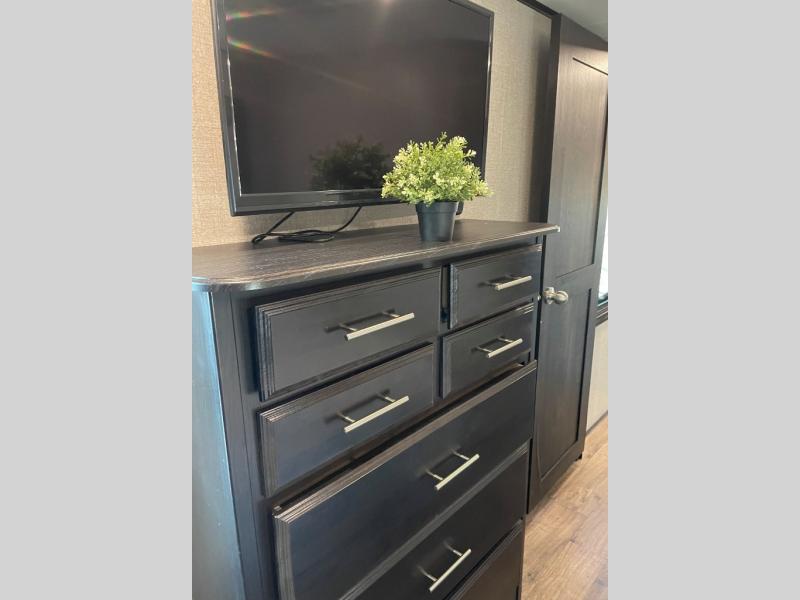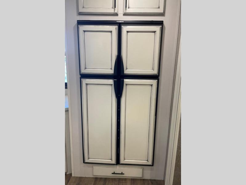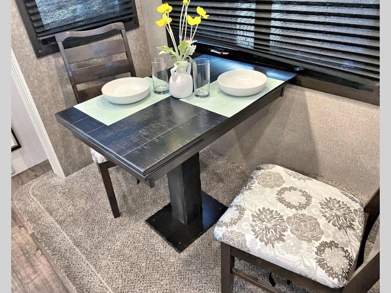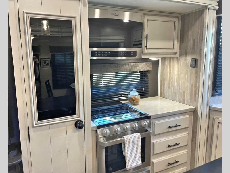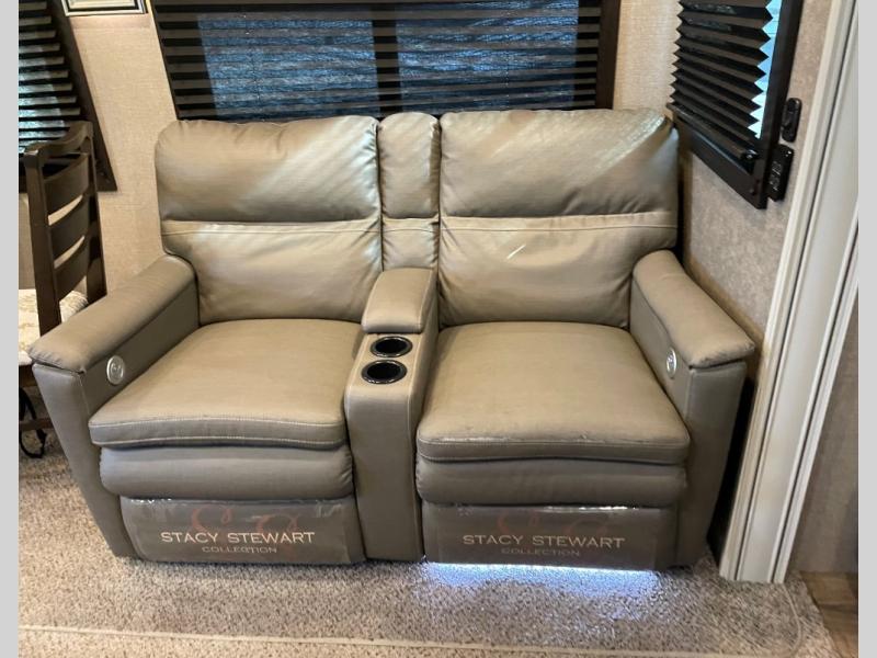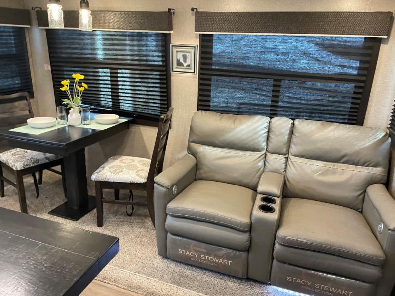 The huge island with bar stools creates a stylish focal point for this Eagle fifth wheel! Not only can you gather around the island in the bar stools, but you can also sit back in one of the two recliners, at the free-standing table with chairs, or on the hide-a-bed sofa while you chat with the cook. And the cook will appreciate having extra space from the opposing slides to move around and grab ingredients from the 13.5 cubic foot refrigerator. Plus, you'll also find a private bedroom up front so that you can retire in comfort once the day has ended.