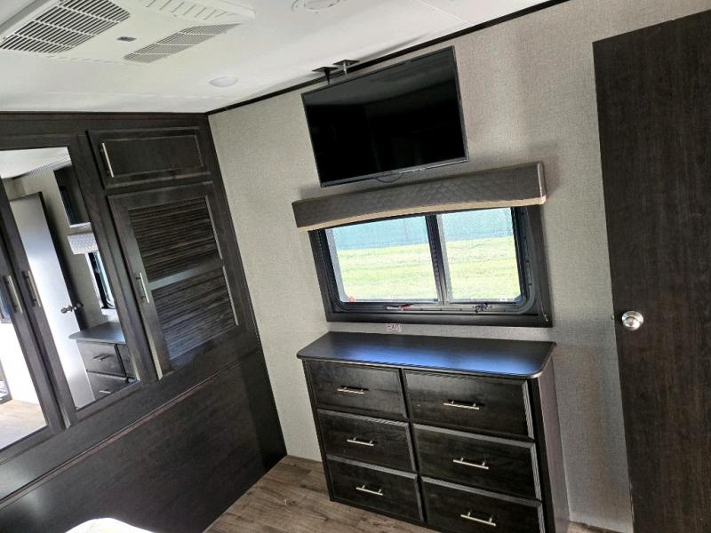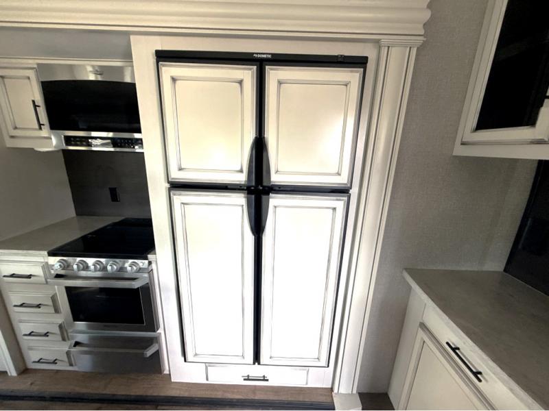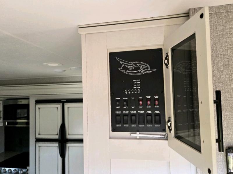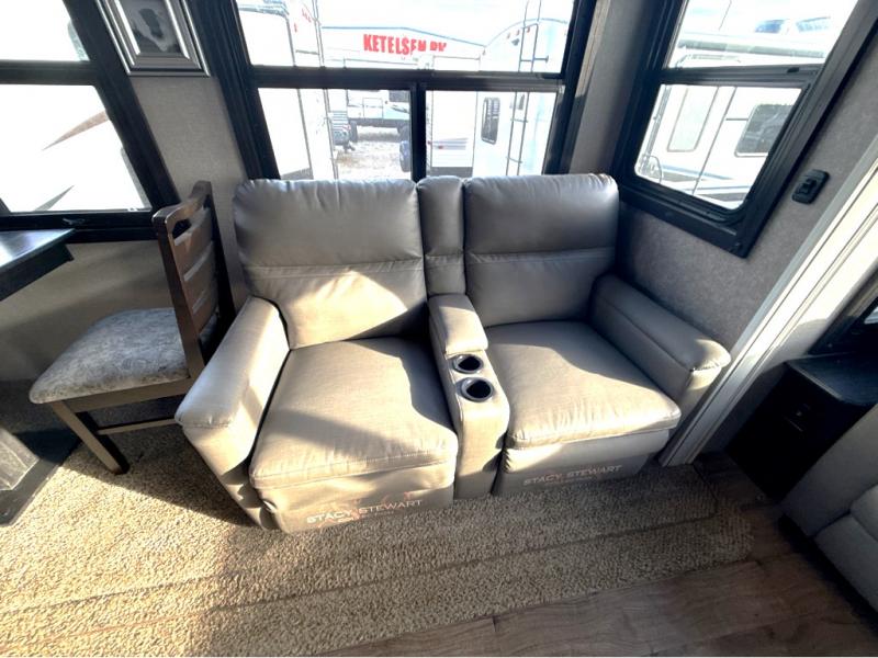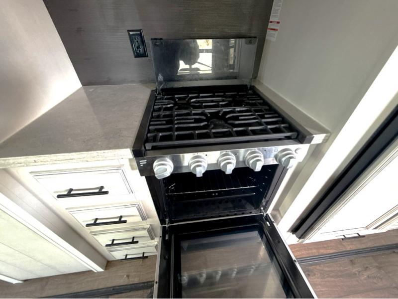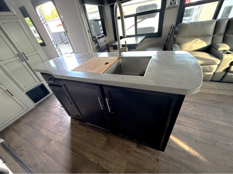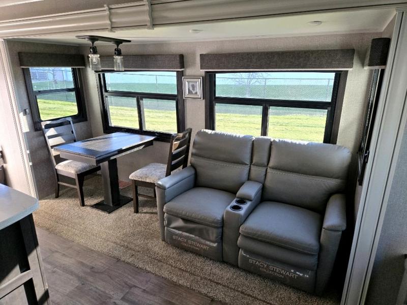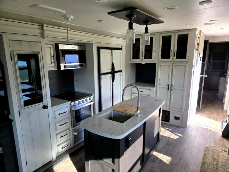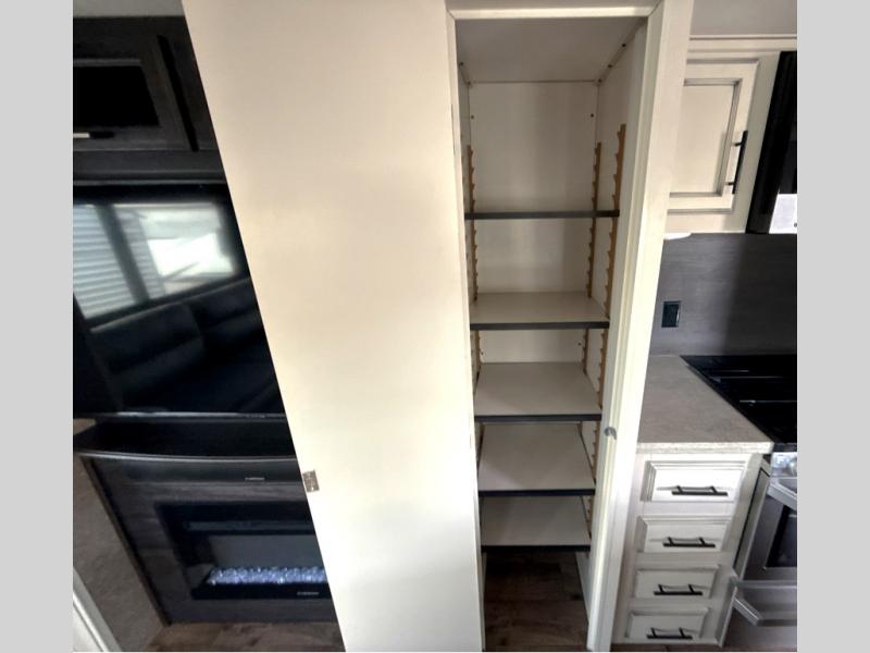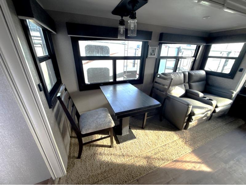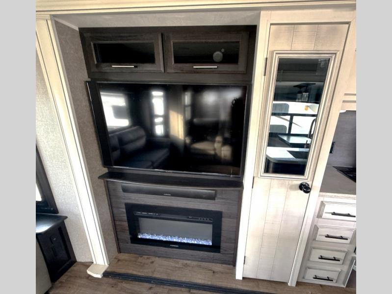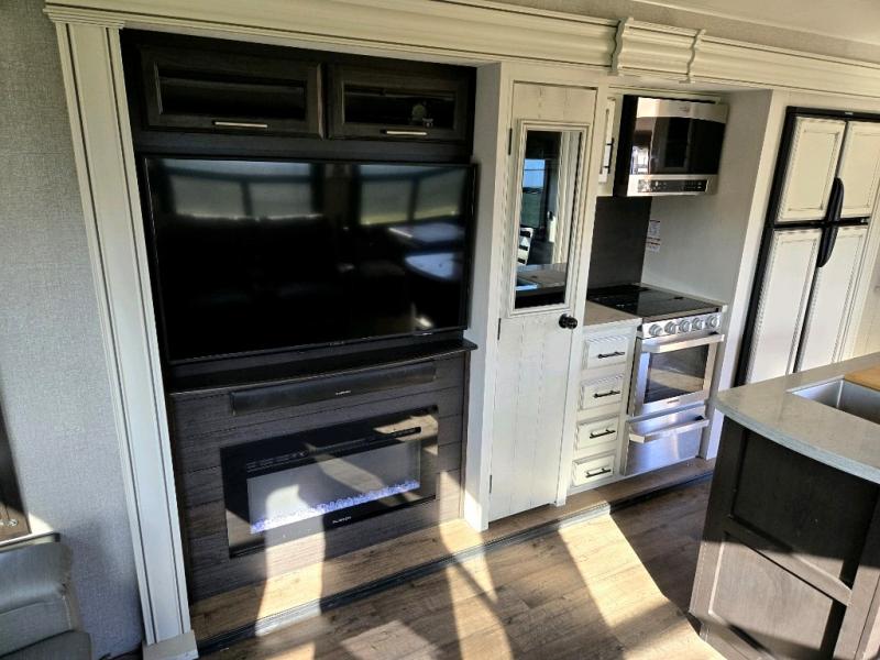 After spending a night of comfort and relaxation on the queen-size bed in the front private bedroom, you will be excited to wake up and see everything else that this Eagle travel trailer has to offer! A hutch, walk-in pantry, 13.5 cubic foot refrigerator, and second pantry provide plenty of storage space for all of your kitchen gadgets and tools, and the soft-close drawers are an added touch of elegance to this great kitchen. You will be able to sit down at the free-standing table with chairs after preparing a hearty breakfast, and if it happens to be a crisp fall morning, you can switch on the LED fireplace with 5,000 BTU electric space heater to warm up.