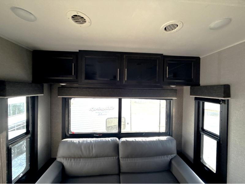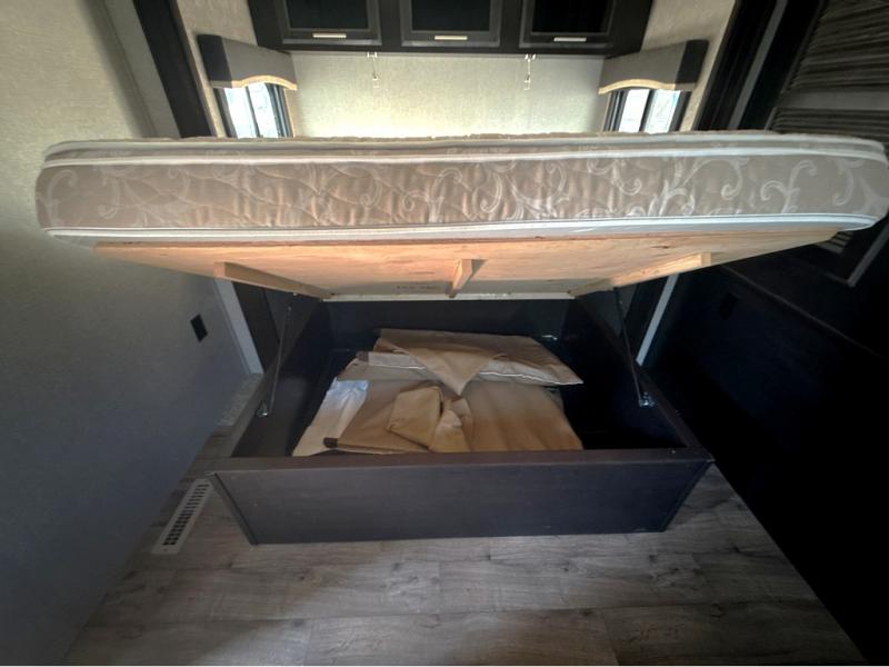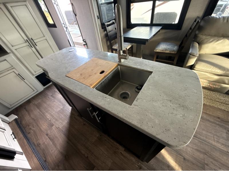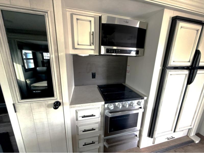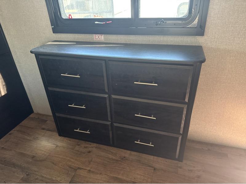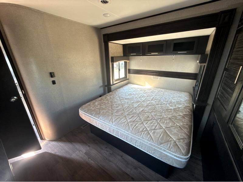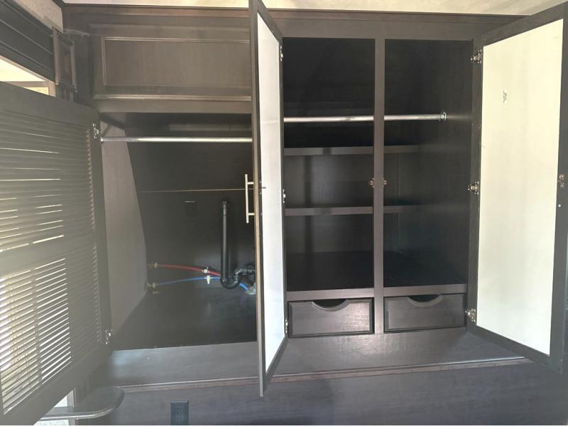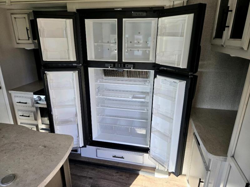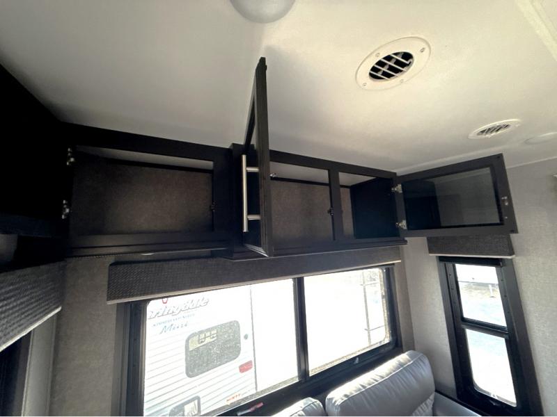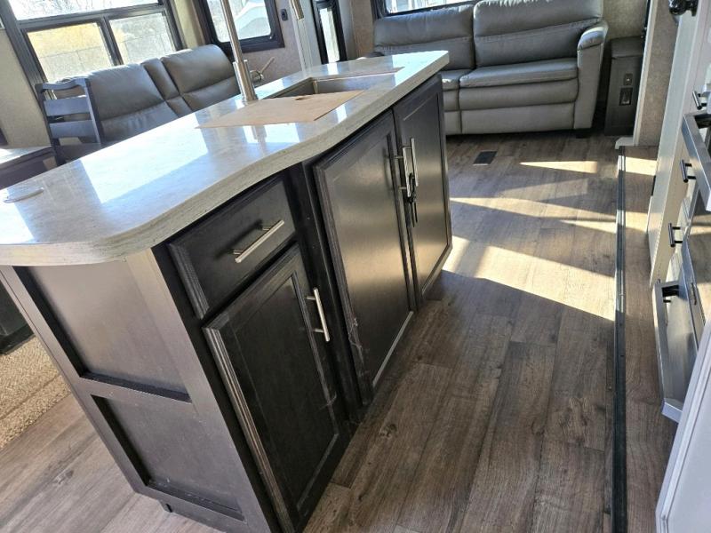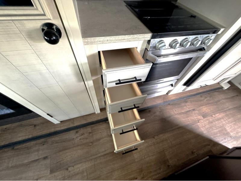 After spending a night of comfort and relaxation on the queen-size bed in the front private bedroom, you will be excited to wake up and see everything else that this Eagle travel trailer has to offer! A hutch, walk-in pantry, 13.5 cubic foot refrigerator, and second pantry provide plenty of storage space for all of your kitchen gadgets and tools, and the soft-close drawers are an added touch of elegance to this great kitchen. You will be able to sit down at the free-standing table with chairs after preparing a hearty breakfast, and if it happens to be a crisp fall morning, you can switch on the LED fireplace with 5,000 BTU electric space heater to warm up.