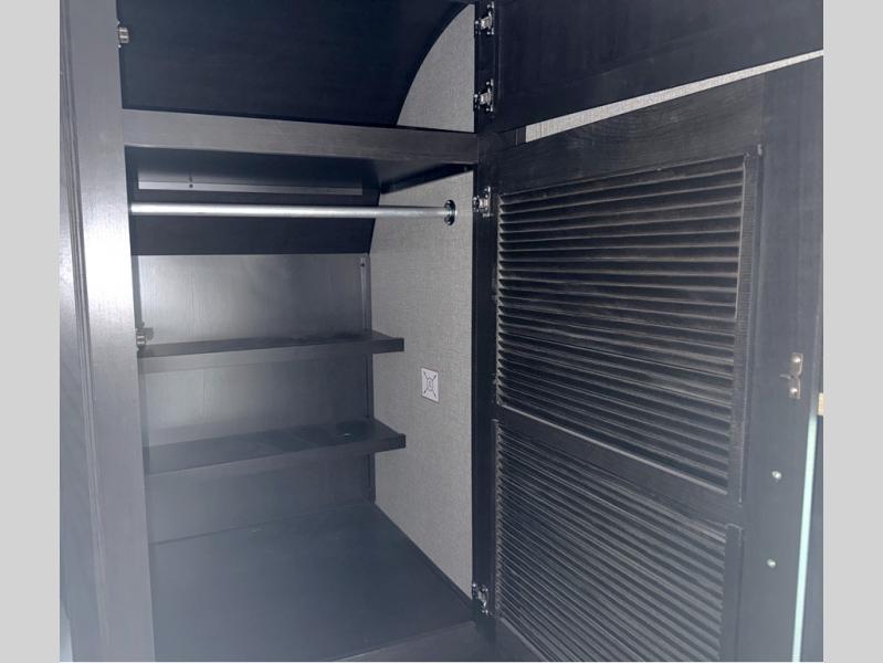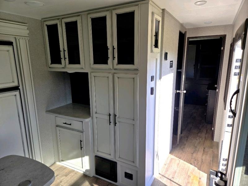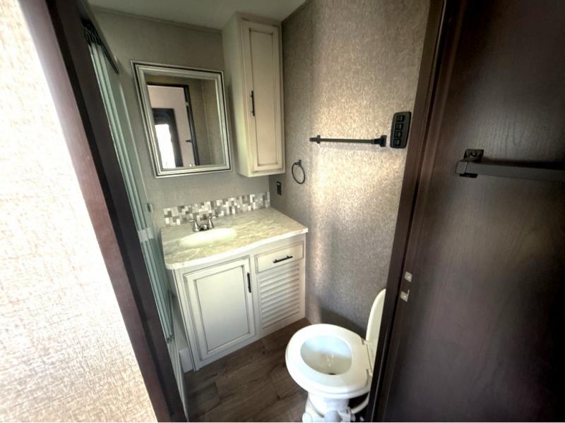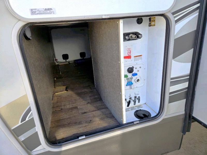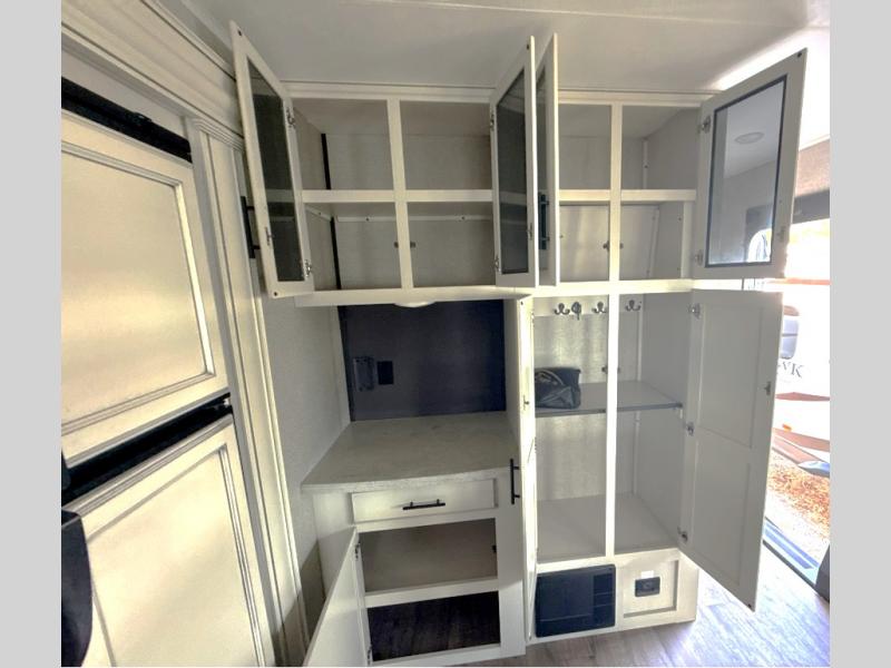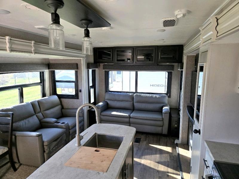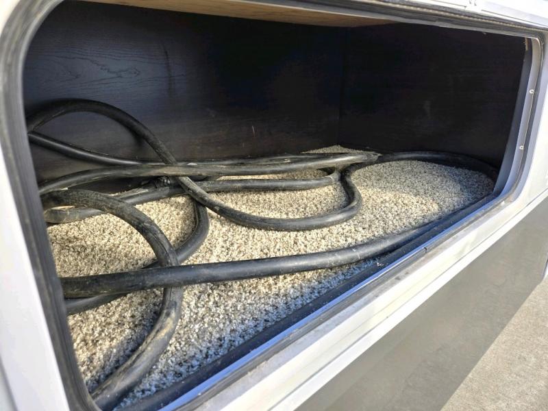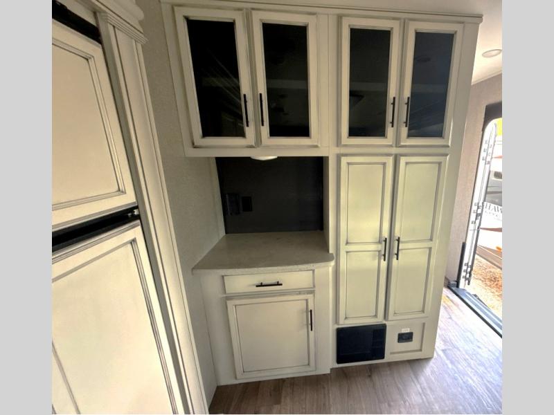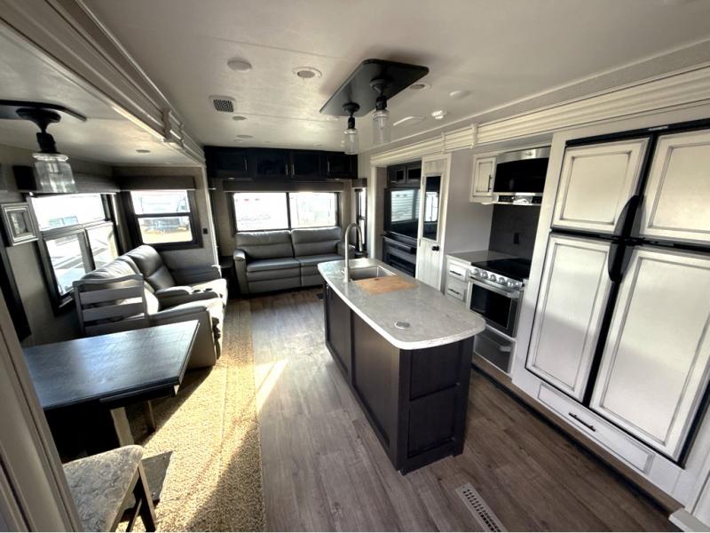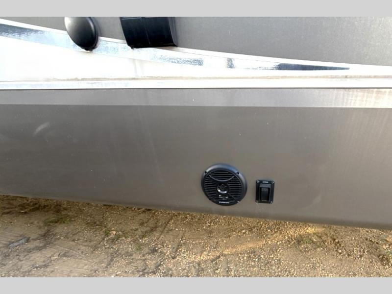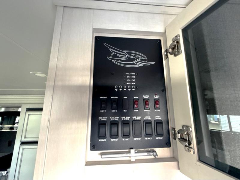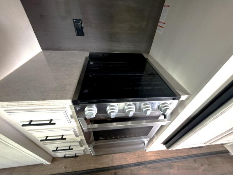 After spending a night of comfort and relaxation on the queen-size bed in the front private bedroom, you will be excited to wake up and see everything else that this Eagle travel trailer has to offer! A hutch, walk-in pantry, 13.5 cubic foot refrigerator, and second pantry provide plenty of storage space for all of your kitchen gadgets and tools, and the soft-close drawers are an added touch of elegance to this great kitchen. You will be able to sit down at the free-standing table with chairs after preparing a hearty breakfast, and if it happens to be a crisp fall morning, you can switch on the LED fireplace with 5,000 BTU electric space heater to warm up.